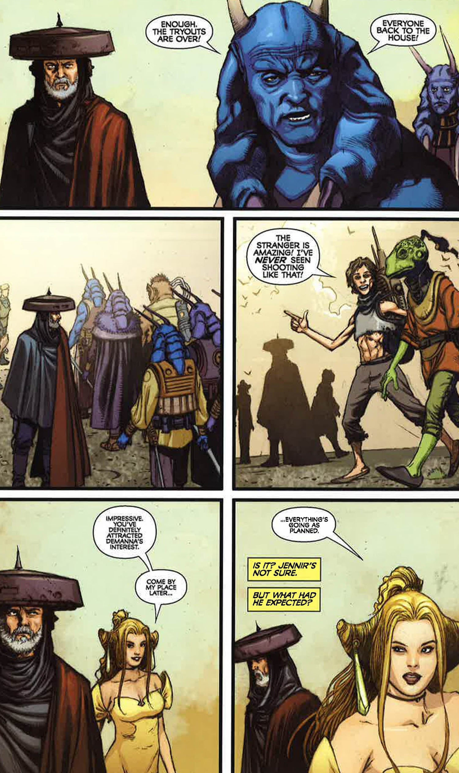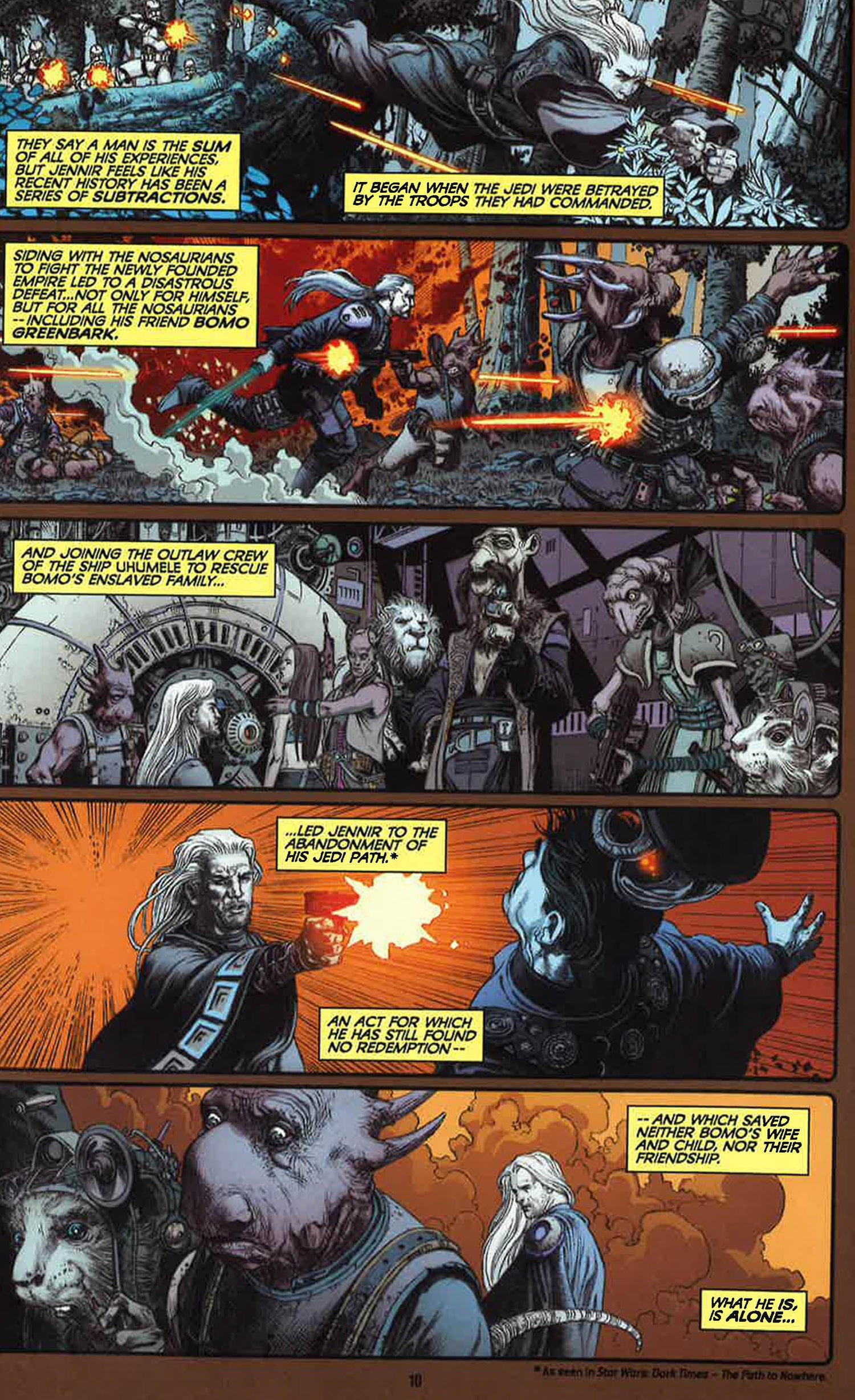 In a time when all Jedi are fugitives, surviving Jedi Dass Jennir is trying to live as an outlaw without actually becoming one. Accepting a job from a mysterious beauty, Jennir sets out to rid her town of a gang of slave runners. But when he finds that his employer hasn't been completely honest with him, he begins to doubt the course she's set him on. Outlaw or not, there's one thing he knows for certain: he has vowed to save this town-and a Jedi never gives up!
