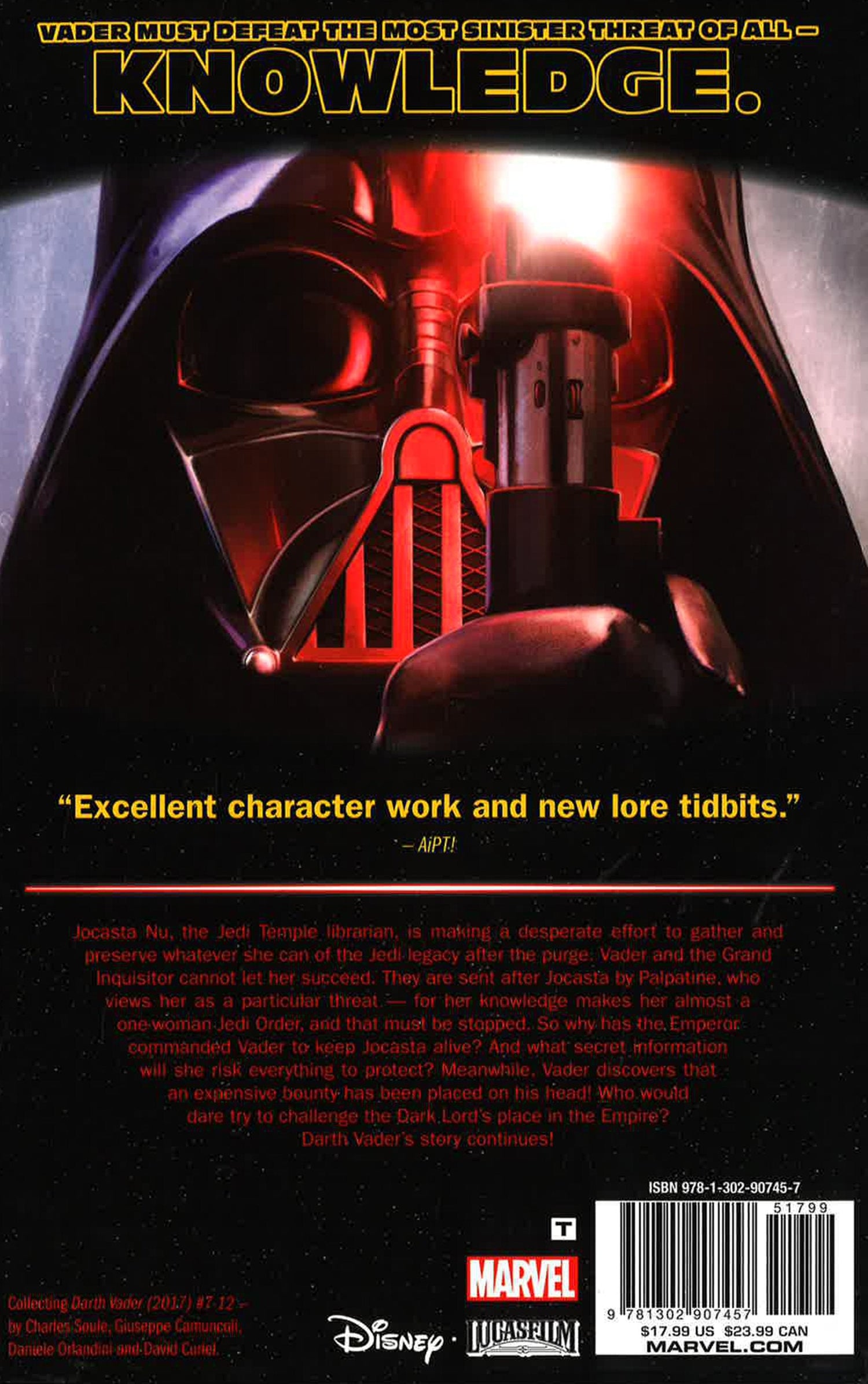 Vader's story continues! Jocasta Nu, the Jedi Temple librarian, puts forth a desperate eff ort to gather and preserve whatever he can of the Jedi legacy after the purge. Vader and the Grand Inquisitor cannot let Jocasta succeed and are sent after her, as alpatine views her as a particular threat. Her knowledge makes her almost a one-woman Jedi Order that must be stopped. COLLECTING: DARTH VADER 7-12