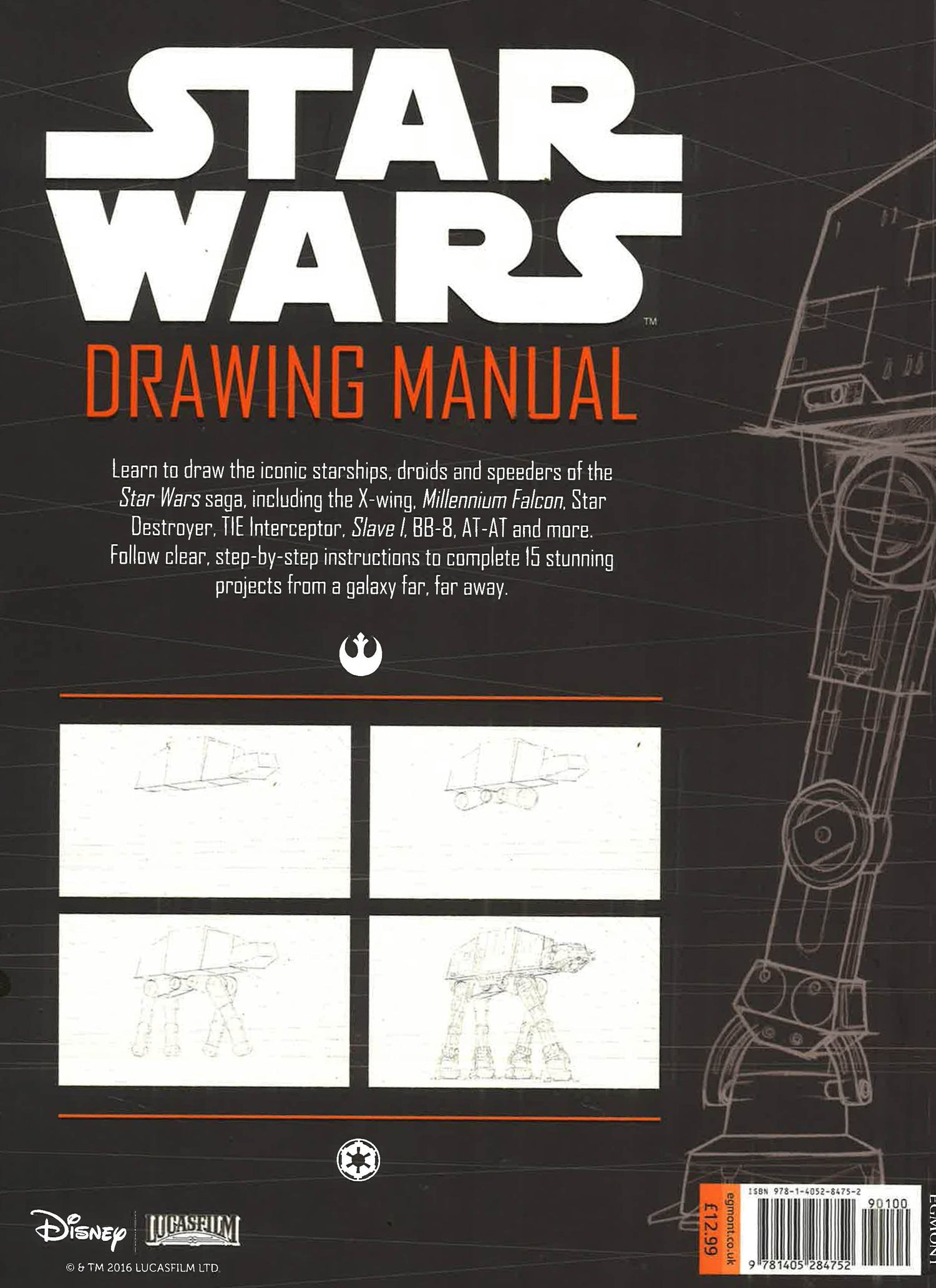 The Star Wars drawing book that no Star Wars fan should be without. Learn to draw the iconic starships, droids, and speeders of the Star Wars saga, including the X-wing, Millennium Falcon, Star Destroyer, TIE Interceptor, Slave I, BB-8, AT-AT and more. Follow clear, step-by-step instructions to complete 15 stunning projects from a galaxy, far, far away. Each drawing sits on a perspective grid that will help you to see what your drawings will look like as three-dimensional objects. The grid consists of a vanishing point with perspective lines leading away from it. Star rankings are also provided to indicate the difficulty level of each drawing. There are hours of entertainment for Star Wars fans young and old.