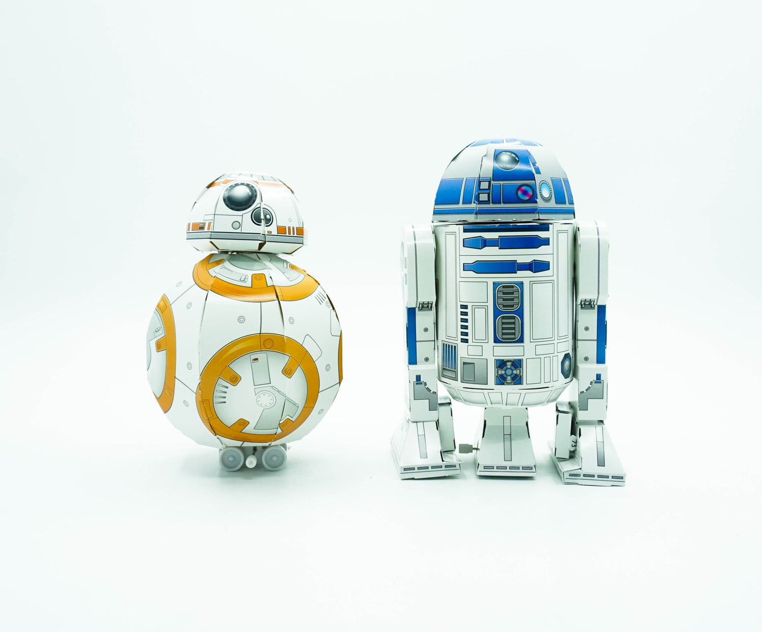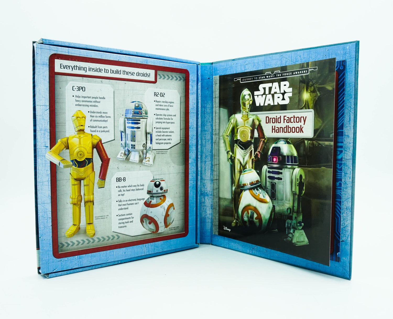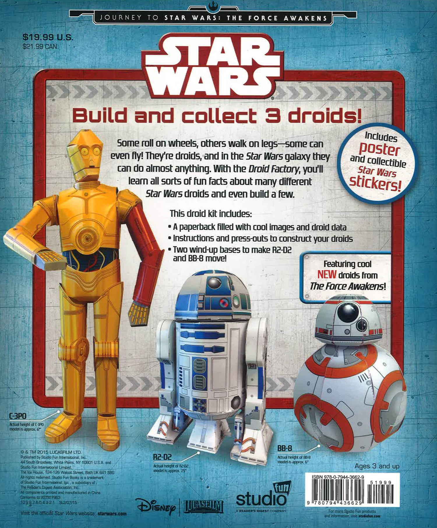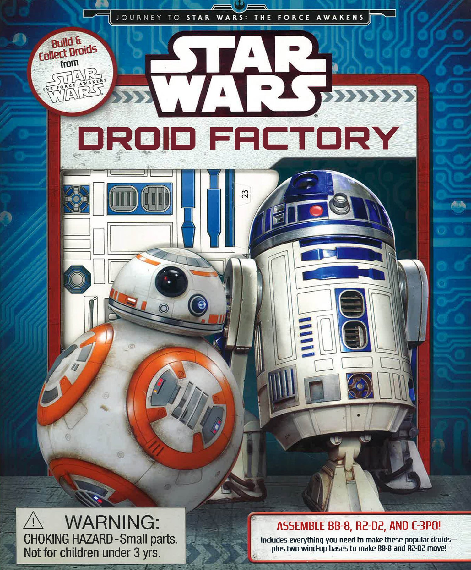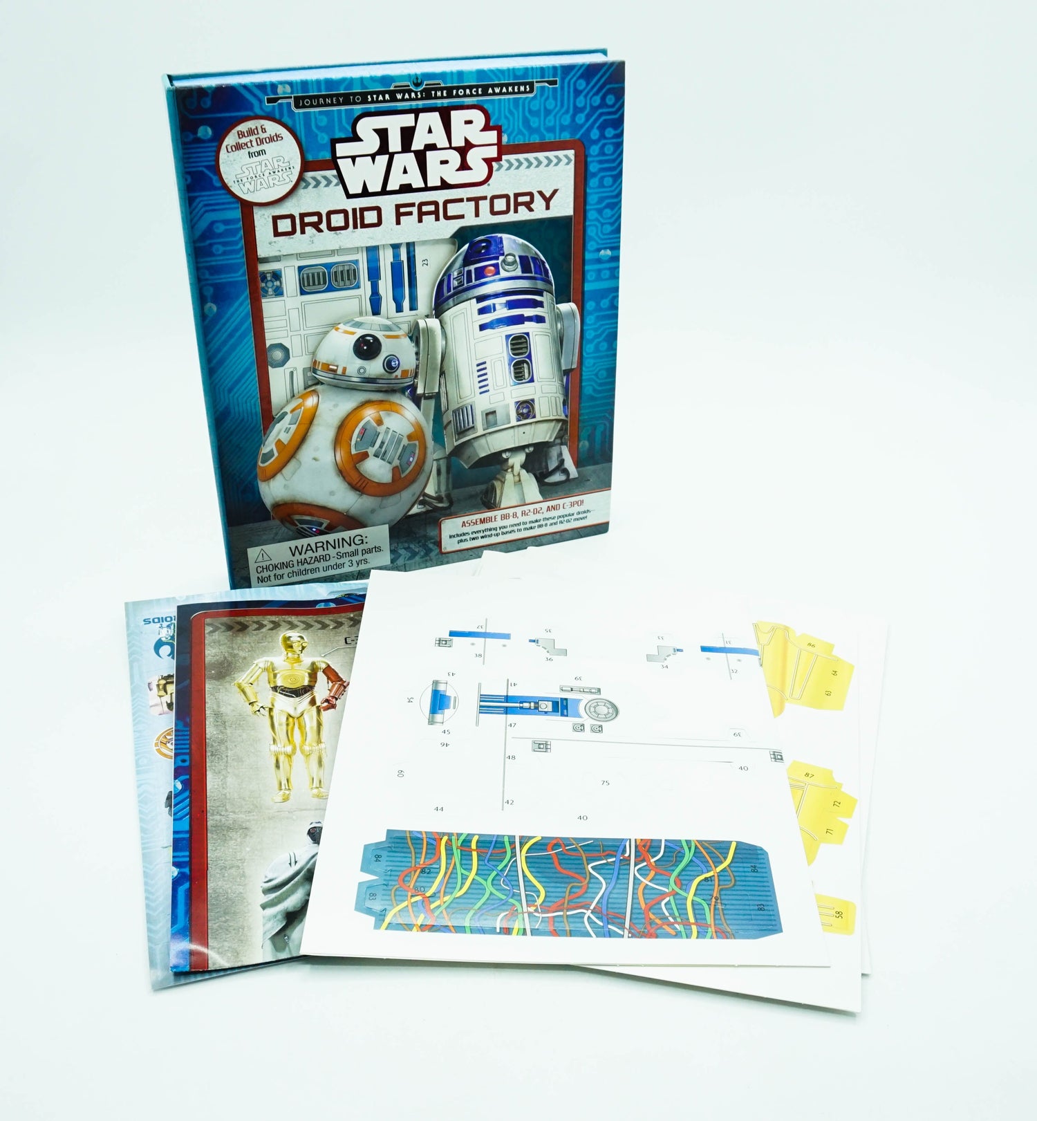 Become a "Star Wars" droid expert and build your own BB-8, R2-D2, and C-3PO! Some roll on wheels, others walk on legs some can even fly! They're droids, and in the "Star Wars" galaxy they can do almost anything. With the "Droid Factory," you'll learn all sorts of fun facts about many different" Star Wars "droids and even build a few. This kit includes a paperback book, instructions and press-outs to construct your droids, collectible "Star Wars "stickers, a poster, and two wind-up bases to make R2-D2 and BB-8 move!