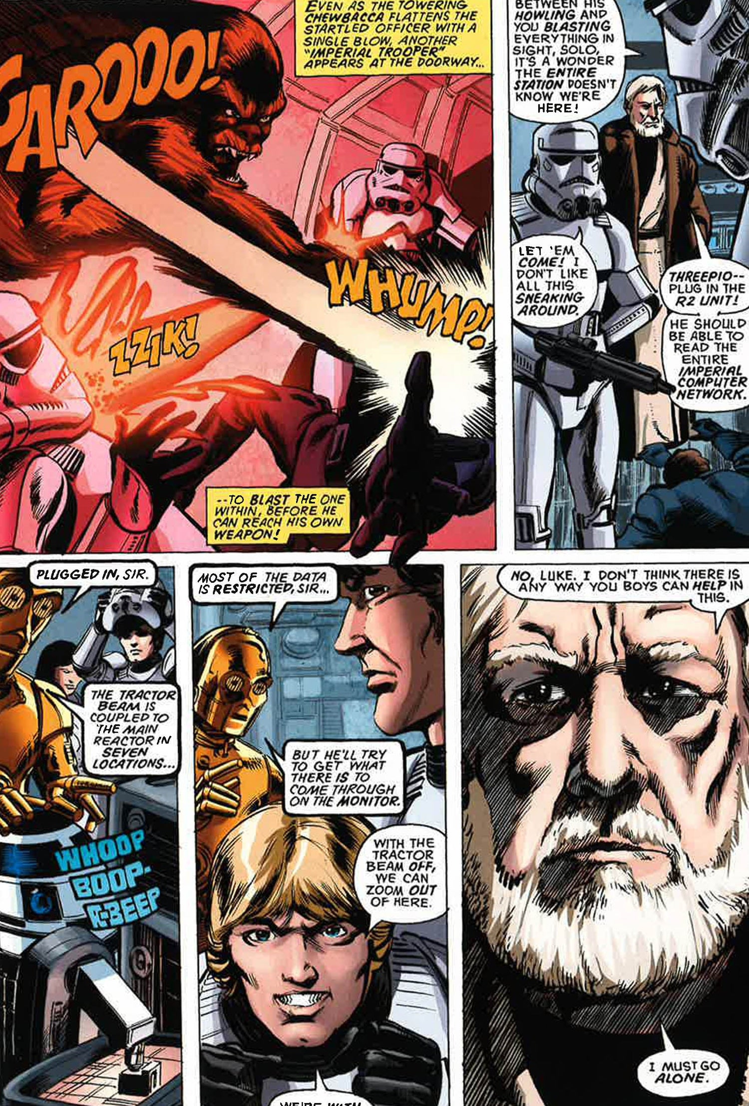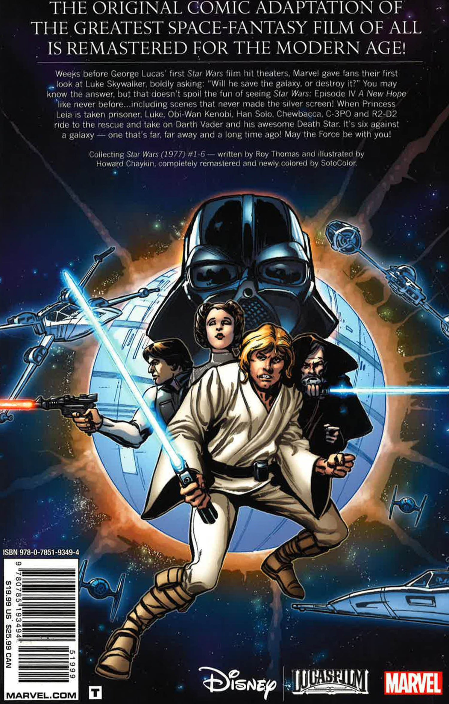 The original comic adaptation of the greatest space-fantasy film of all is remastered for the modern age with all-new coloring by Chris Sotomayor! Weeks before George Lucas' first STAR WARS film hit theatres, Marvel gave fans their first look at Luke Skywalker, boldly asking: "Will he save the galaxy, or destroy it?" You may know the answer, but that doesn't spoil the fun of seeing STAR WARS: EPISODE IV - A NEW HOPE like never before...including scenes that never made the silver screen! When Princess Leia is taken prisoner, Luke, Obi-Wan Kenobi, Han Solo, Chewbacca, C-3PO and R2-D2 ride to the rescue and take on Darth Vader in his awesome Death Star. It's six against a galaxy - one that's far, far away and a long time ago! May the Force be with you, in the mighty Marvel manner!