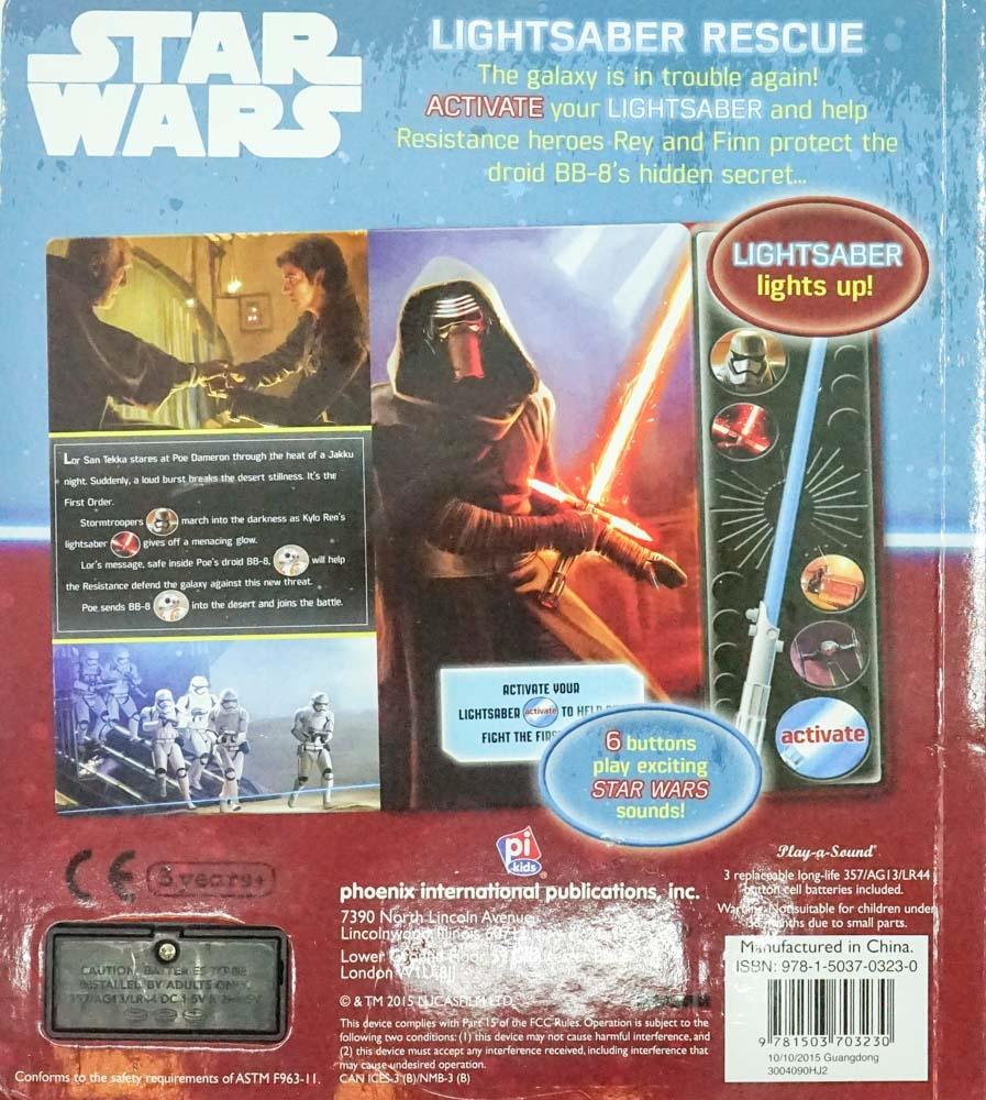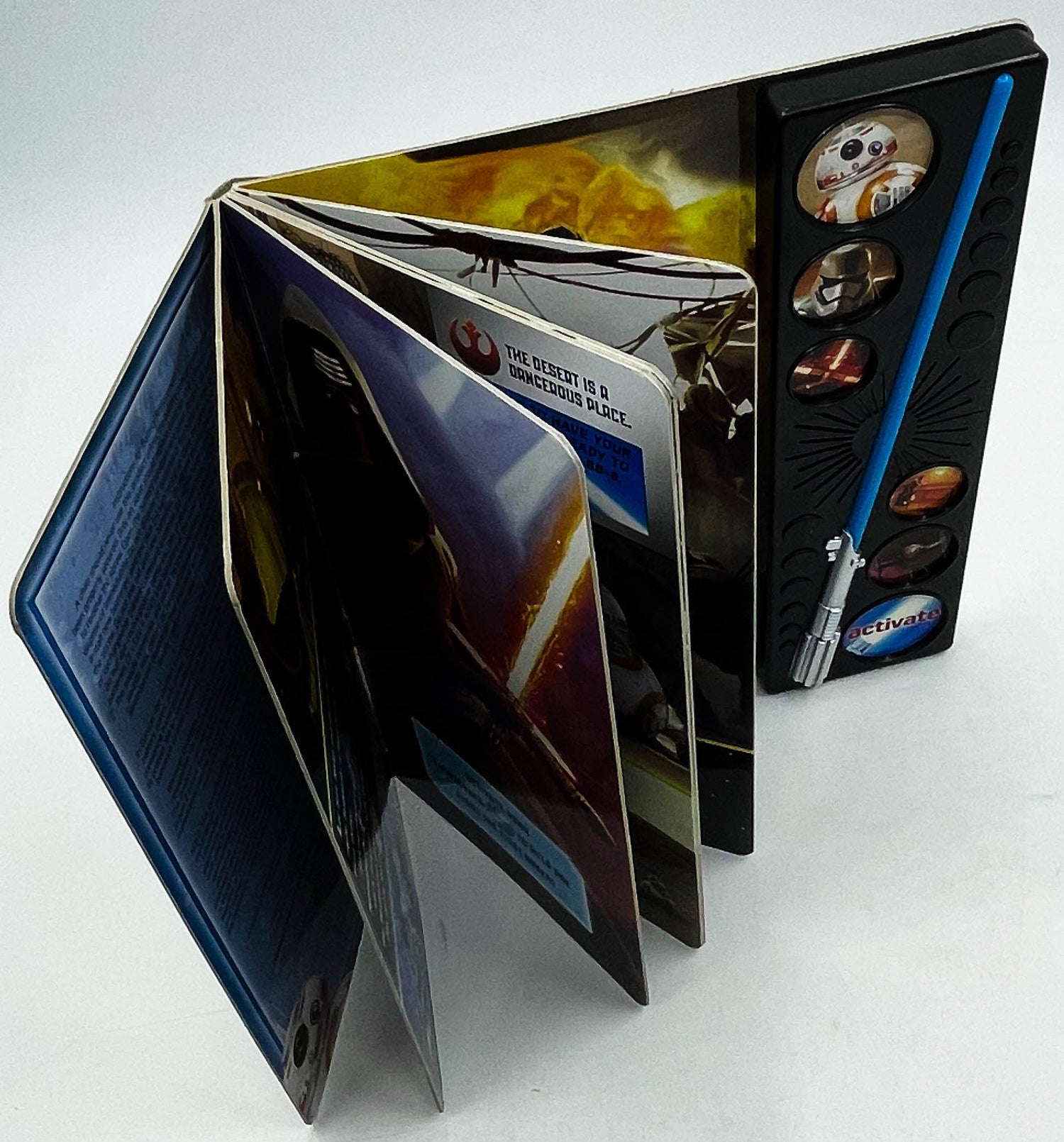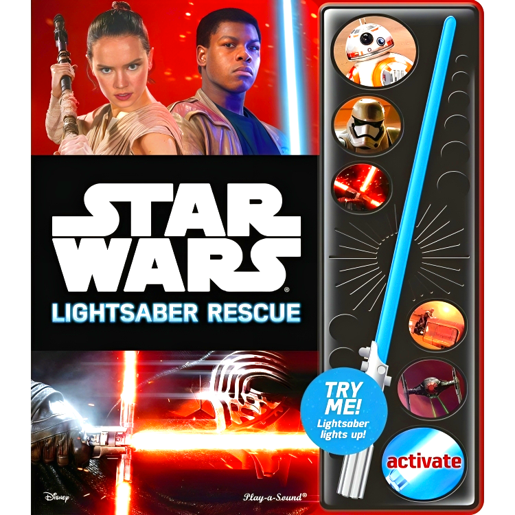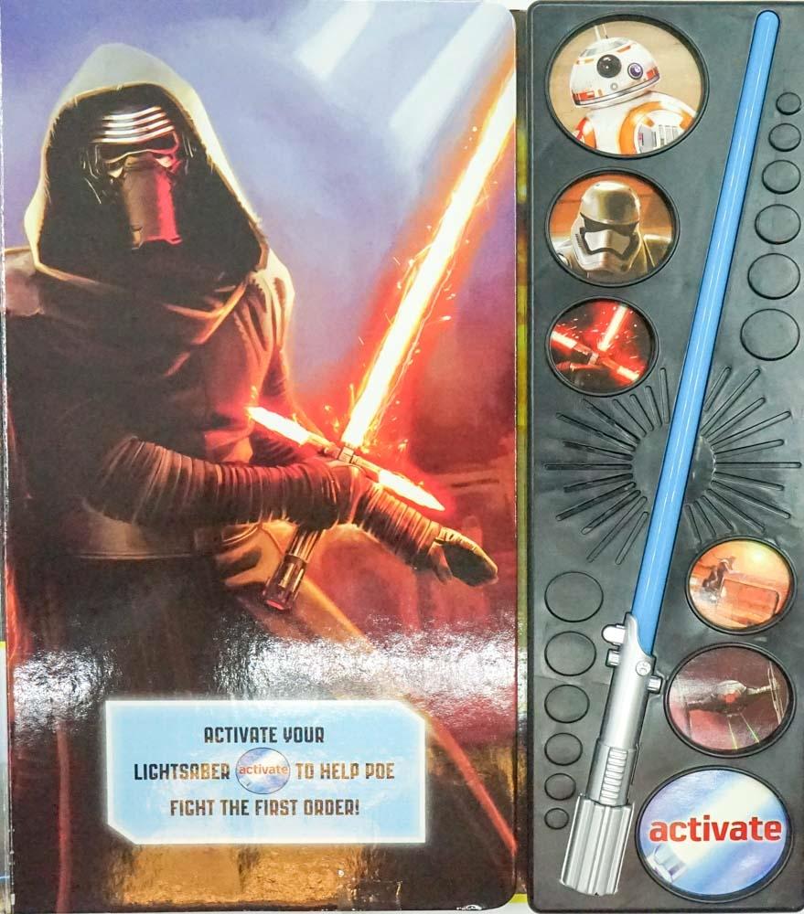 The Force will be with you when you join these Jedi adventures!Based on Star Wars: The Force Awakens (film release date: 18/12/15). 6 sound buttons with attached light-up lightsaber. Press the lightsaber icon to hear lightsaber activation sound and see the lights turn on from bottom to top, and then pulse; press again to hear deactivation sound and see the lights go off from top to bottom.