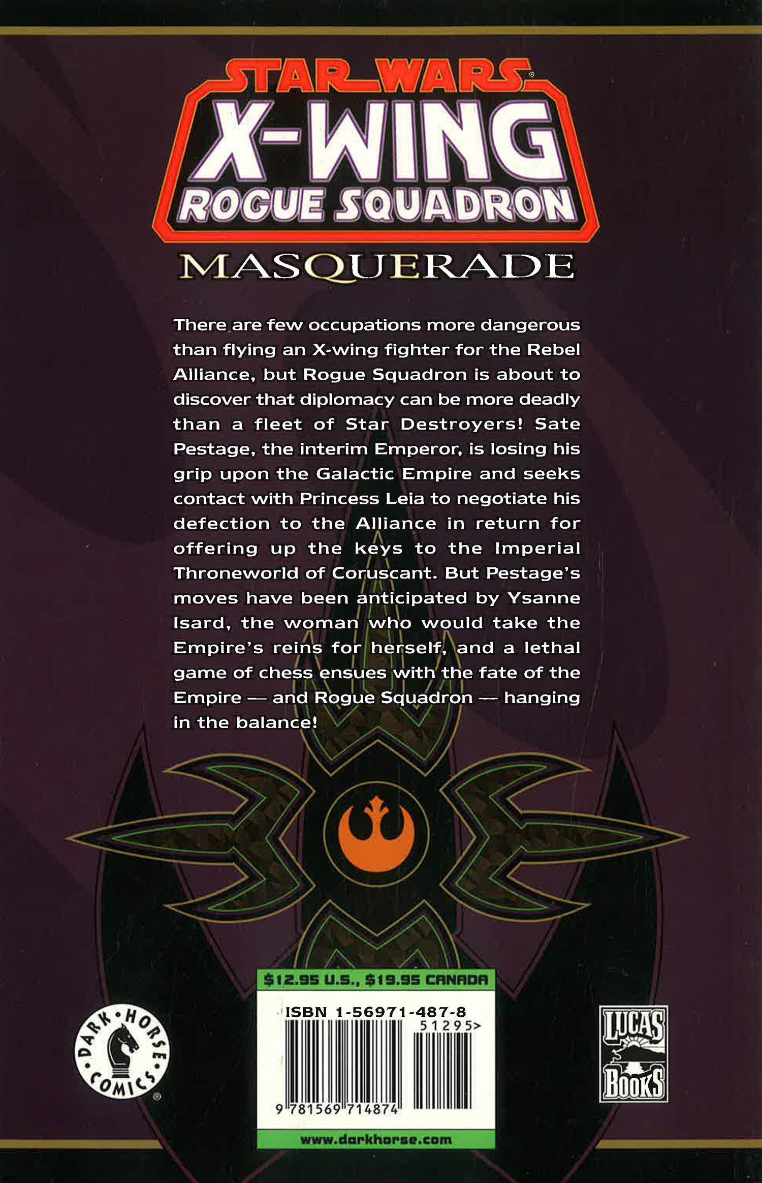 There are few occupations more dangerous than flying an X-wing fighter for the Rebel Alliance, but Rogue Squadron is about to discover that diplomacy can be more deadly than a fleet of Star Destroyers! Sate Pestage, the interim Emperor, is losing his grip upon the Galactic Empire and seeks contact with Princess Leia to negotiate his defection to the Alliance in return for offering up the keys to the Imperial Throneworld of Coruscant. But Pestage's moves have been anticipated by Isard, the woman who would take the Empire's reins for herself, and a lethal game of chess ensues with the fate of the Empire and Rogue Squadron hanging in the balance!