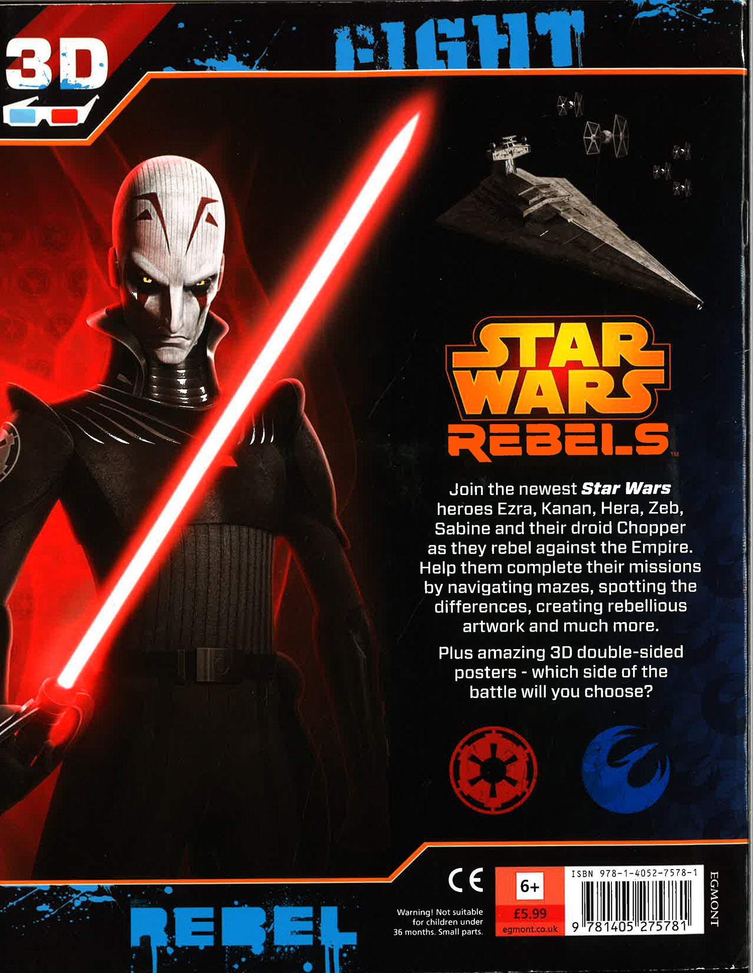 Join the heroes of the Star Wars Rebels TV series in this epic activity book, featuring jaw-dropping 3D scenes! Help Ezra and Kanan through mazes, colour in grumpy Chopper, break codes with Zeb and Hera, and create graffiti masterpieces with Sabine. Includes awesome 3D posters and a fold-out full of exclusive character info! Based on the award-winning animated television series that features the voices of Freddie Prinze JR, Sarah Michelle Geller, Jason Isaacs and James Earl Jones as Darth Vader, this thrilling activity book will delight young rebels aged six and upwards. Do you own the complete Star Wars Rebels Activity range? Rebels Rule Activity Book; Star Wars Rebels 3D Activity Book; Star Wars Rebels How to Draw Activity Book; Star Wars Rebels Transfer Book; and, Star Wars Rebels Story and Activity Book.
