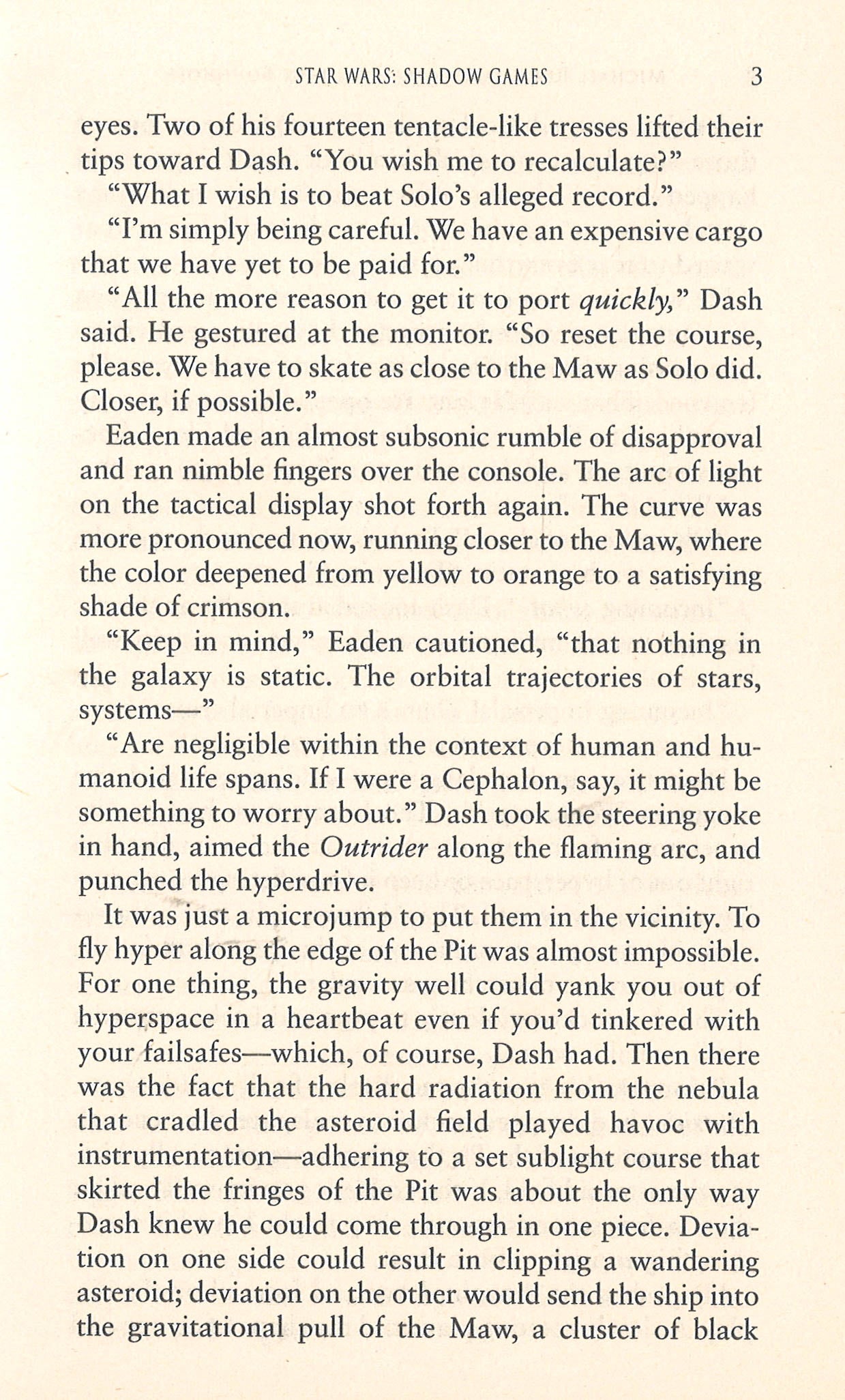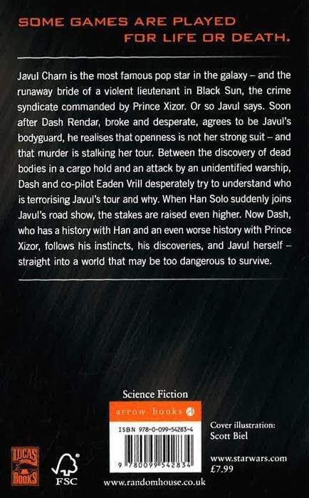 Stranded on Tatooine with a broken-down hyperdrive, Dash Rendar and crew - his Nautolan copilot, Eaden Vrill, and a droid named Leebo - have to find a way to raise credits. It comes in the lovely form of Javul Charn, a multi-talented human holostar being stalked by an over-zealous fan. She needs bodyguards to protect her during her tour along the Corellian Run; Dash needs credits. It's a perfect match...until things begin to go wrong - seriously and dangerously wrong. By the time Dash realizes that the threat to Javul is not what it seems, he's in up to his neck in a conspiracy that goes much deeper than anything he would have signed up for. Even with the help of his hated rival - Han Solo - will Dash be able to protect this spoiled entertainer, all the while being reminded that he couldn't protect his own family?