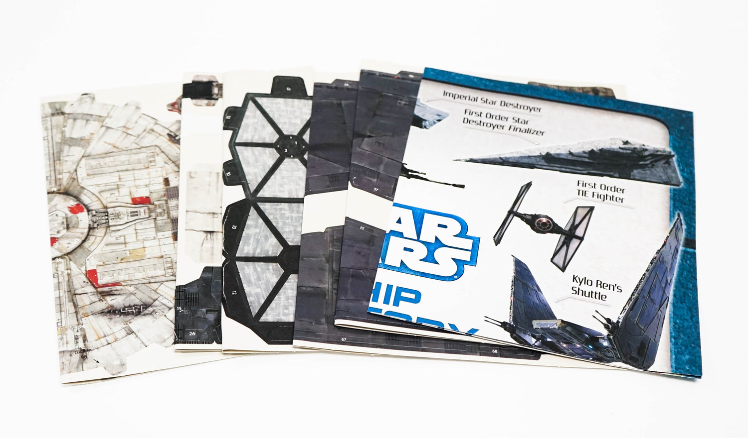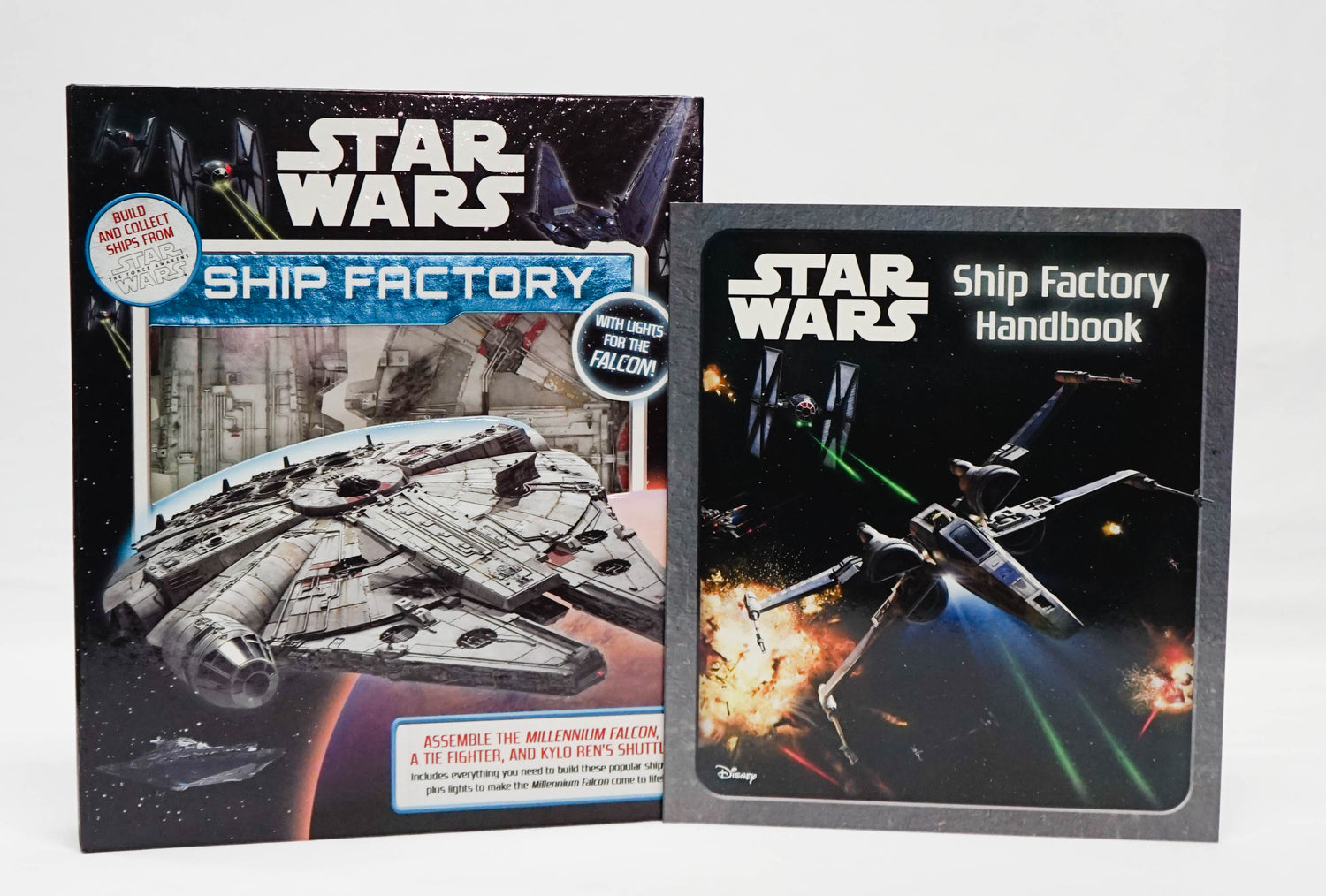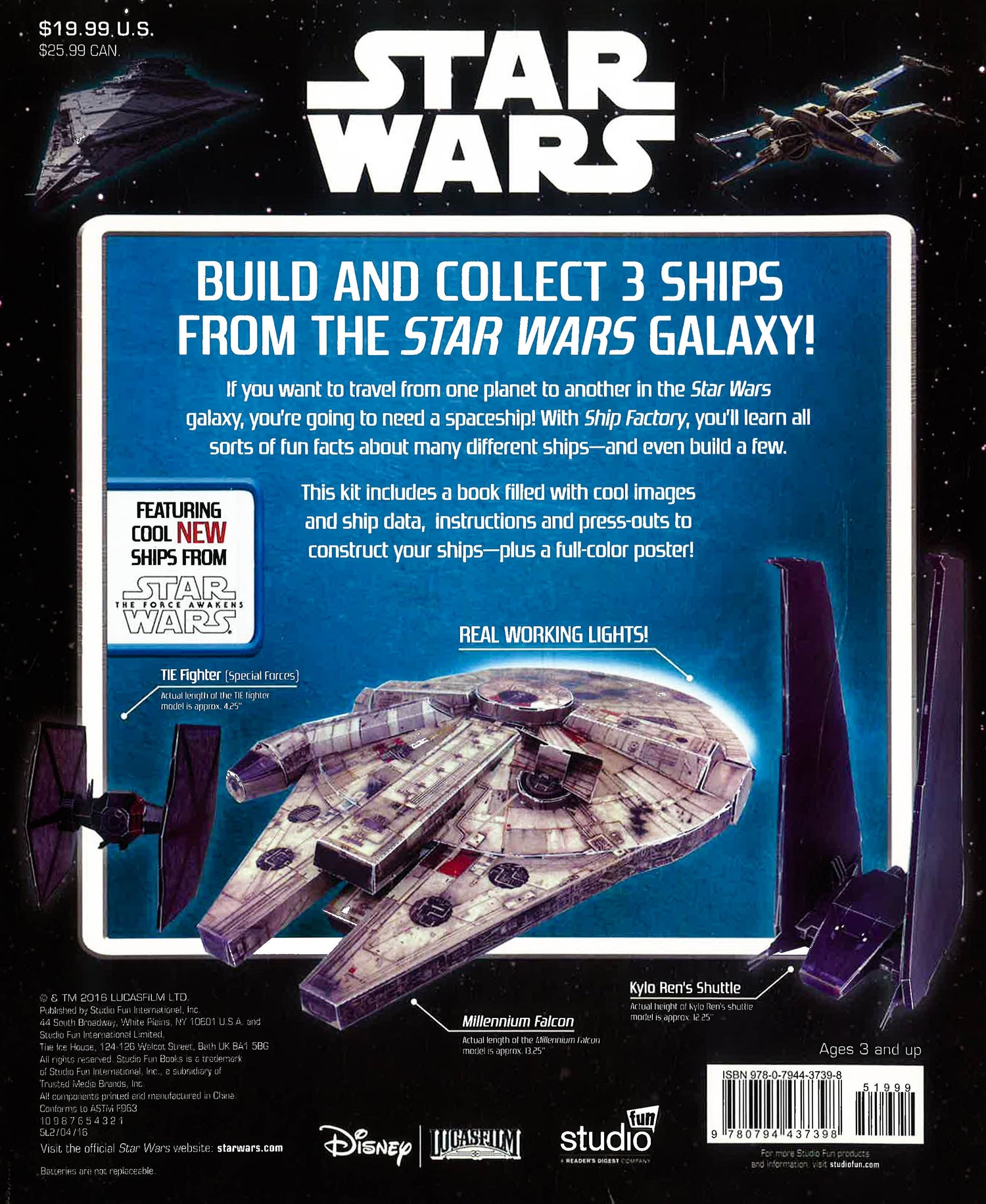 Become a Star Wars ship expert and build your own Millennium Falcon, the new TIE fighter, and Kylo Ren's command shuttle. Choose your favorite and add lights to make it supercool! Discover many different kinds of Star Wars spacecraft, and then build a few! This complete kit includes everything kids need to assemble the Millennium Falcon, a new TIE fighter, and Kylo Ren's ship, plus a full-color paperback reveals fun ship facts. Included within are instructions and press-outs to construct the ships, stickers, a 17" x 20" poster, and an LED light pack to light up the Millennium Falcon.