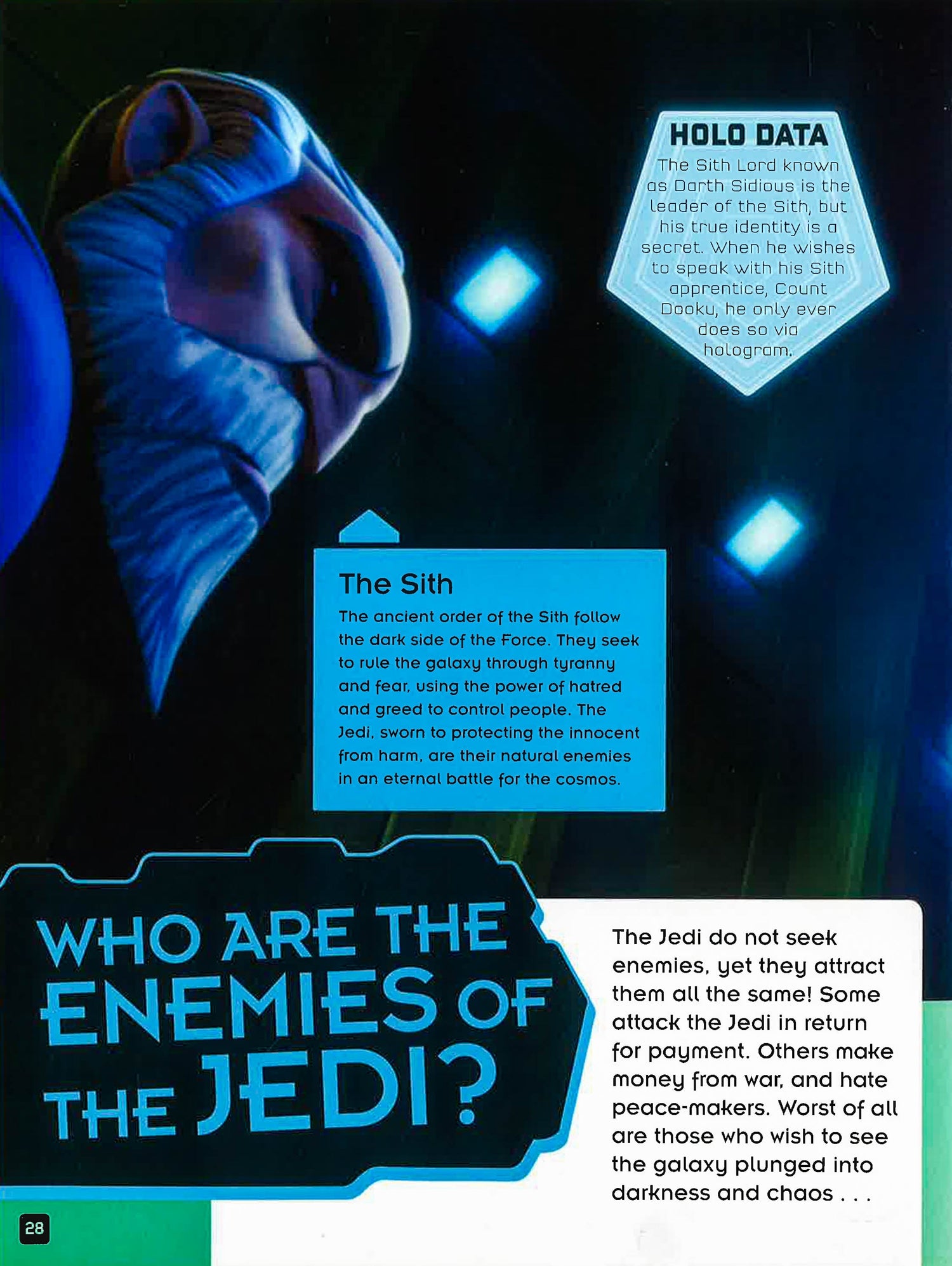Discover the secrets behind the deadly Sith's mission to rule the galaxy. Meet the brave Jedi warriors who will stop at nothing to defeat them. Witness the most amazing chases and duels. Learn all about the Jedi and Sith's weapons, plots and powers.