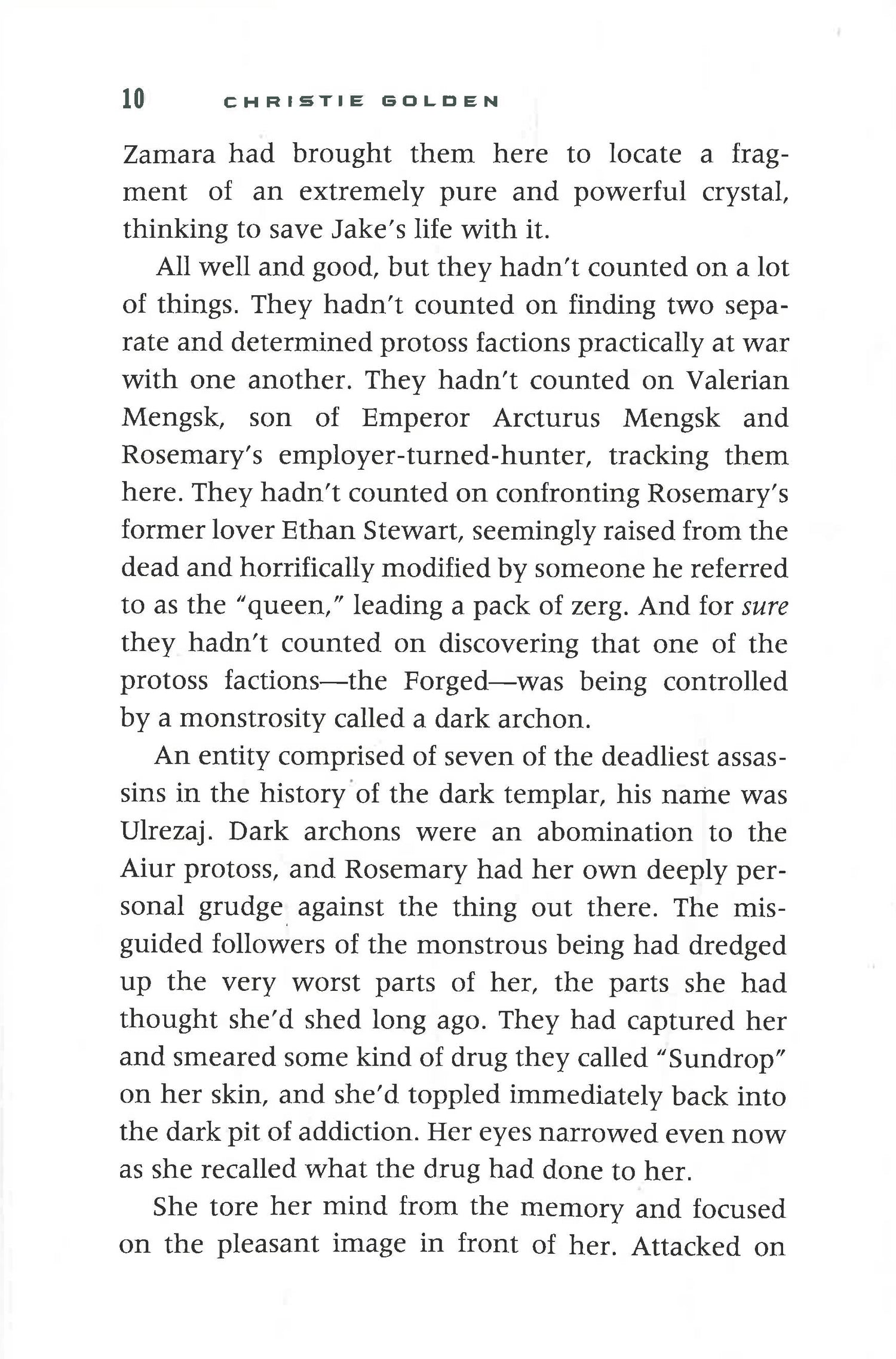 After the seeming defeat of the dark archon Ulrezaj on the protoss homeworld of Aiur, Jake and Rosemary become separated as they flee through the newly repaired warp gate. Rosemary finds herself with the other refugee protoss on Shakuras, while Jake is catapulted elsewhere. But Jake does not have long to live: their enemies are regrouping, and Zamara's essence must be separated from Jake's mind before time runs out.
