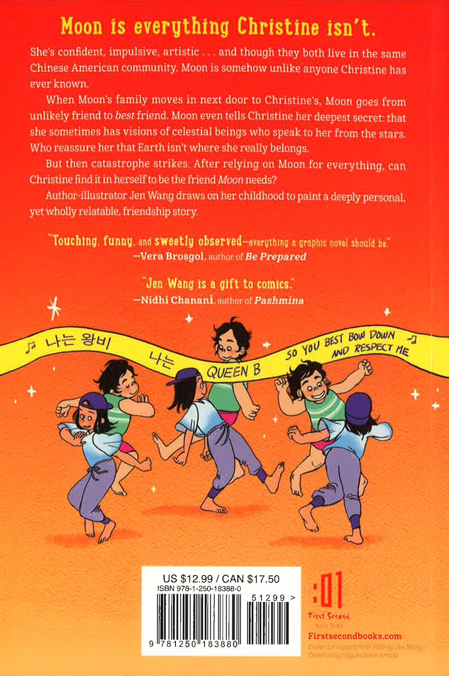 Moon is everything Christine isn't. She's confident, impulsive, artistic . . . and though they both grew up in the same Chinese-American suburb, Moon is somehow unlike anyone Christine has ever known. But after Moon moves in next door, these unlikely friends are soon best friends, sharing their favorite music videos and painting their toenails when Christine's strict parents aren't around. Moon even tells Christine her deepest secret: that she has visions, sometimes, of celestial beings who speak to her from the stars. Who reassure her that earth isn't where she really belongs. Moon's visions have an all-too-earthly root, however, and soon Christine's best friend is in the hospital, fighting for her life. Can Christine be the friend Moon needs, now, when the sky is falling? Jen Wang draws on her childhood to paint a deeply personal yet wholly relatable friendship story that's at turns joyful, heart-wrenching, and full of hope.