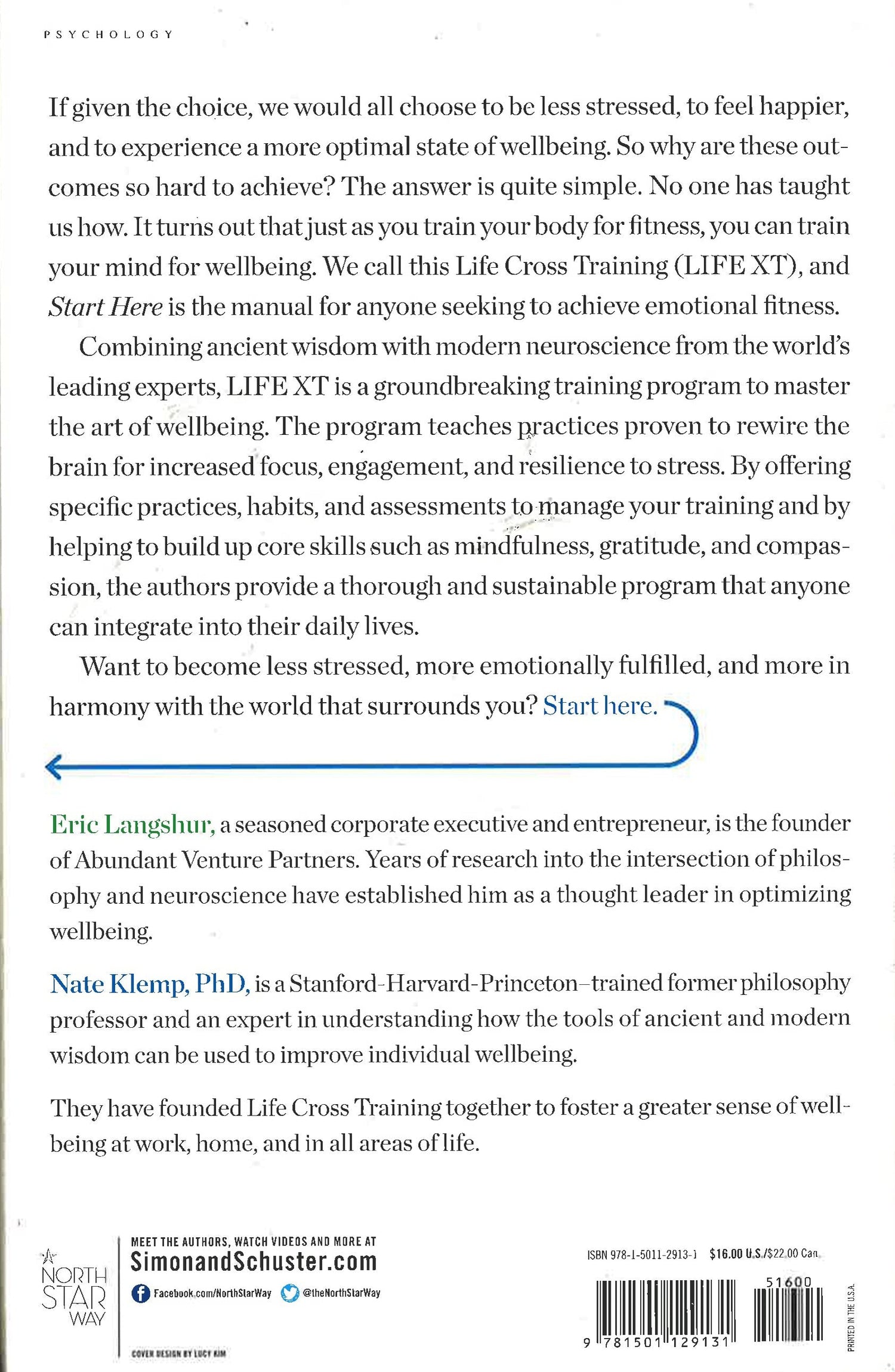 If given the choice, we would all choose to be less stressed, feel happier, and experience a more optimal state of wellbeing. So why are these outcomes so hard to achieve? The answer is quite simple. No one has taught us how. It turns out that just as you train your body for fitness, you can train your mind for wellbeing. We call this Life Cross Training (LIFE XT), and Start Here is the manual for anyone seeking to achieve emotional satisfaction.Combining ancient wisdom with modern neuroscience from the world’s leading experts, LIFE XT is a groundbreaking training program to master the art of wellbeing. The program teaches practices that are proven to rewire the brain for increased focus, engagement, and resilience to stress. By offering specific practices, habits, and assessments to manage your training and helping to build up core skills such as mindfulness, gratitude, and compassion, authors Eric Langshur and Nate Klemp lay out a thorough and sustainable program that anyone can integrate into their daily lives.