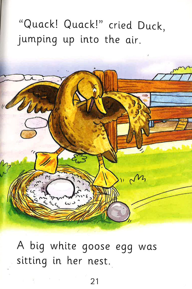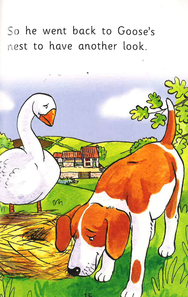 Goose’s egg has been stolen. Detective Dog looks all around the farmyard but cannot see anywhere. Then, he finds out Goose built her nest in a very silly place…