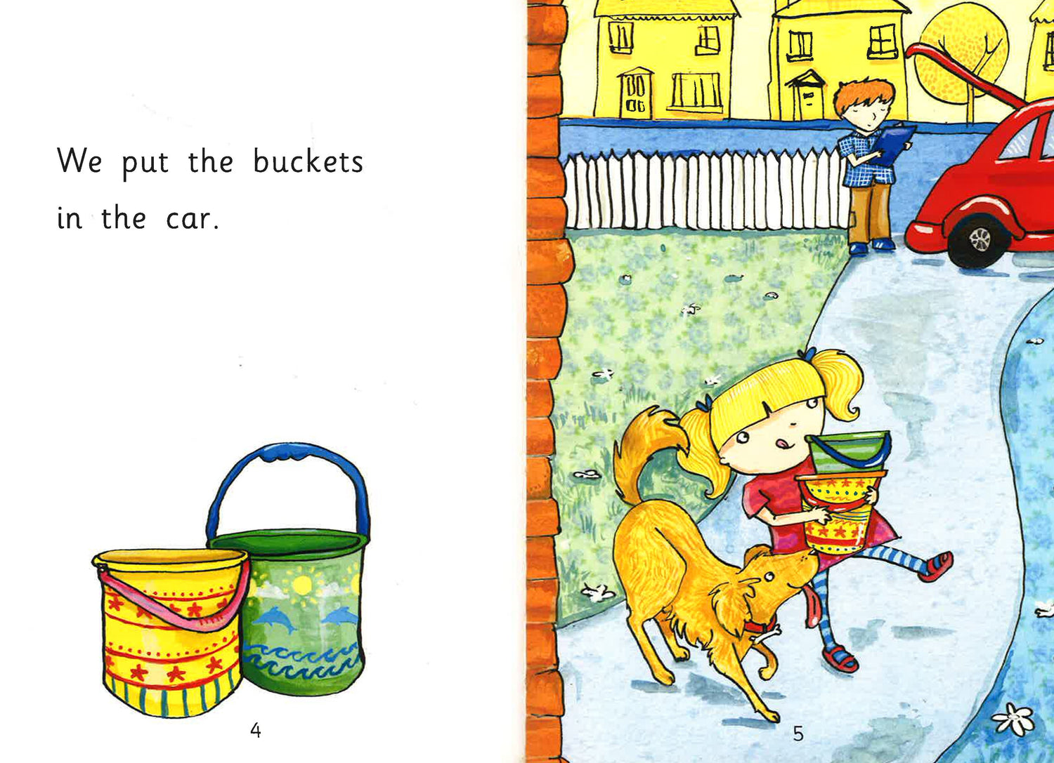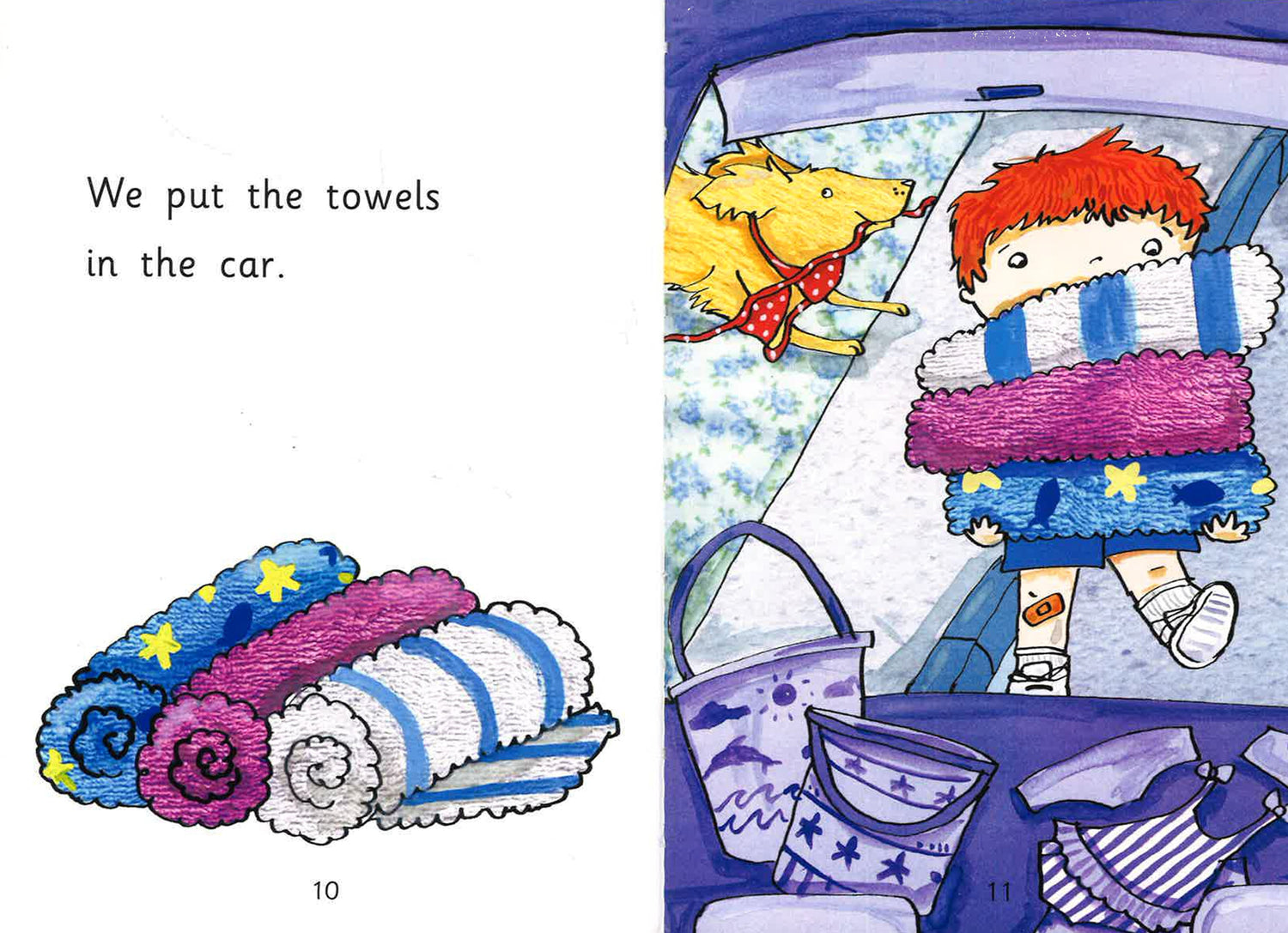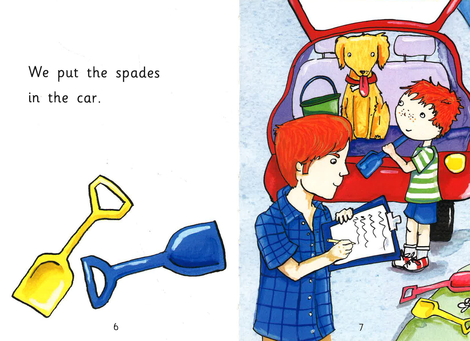 The family put lots of things in the car. At last they are ready to go to the beach!
