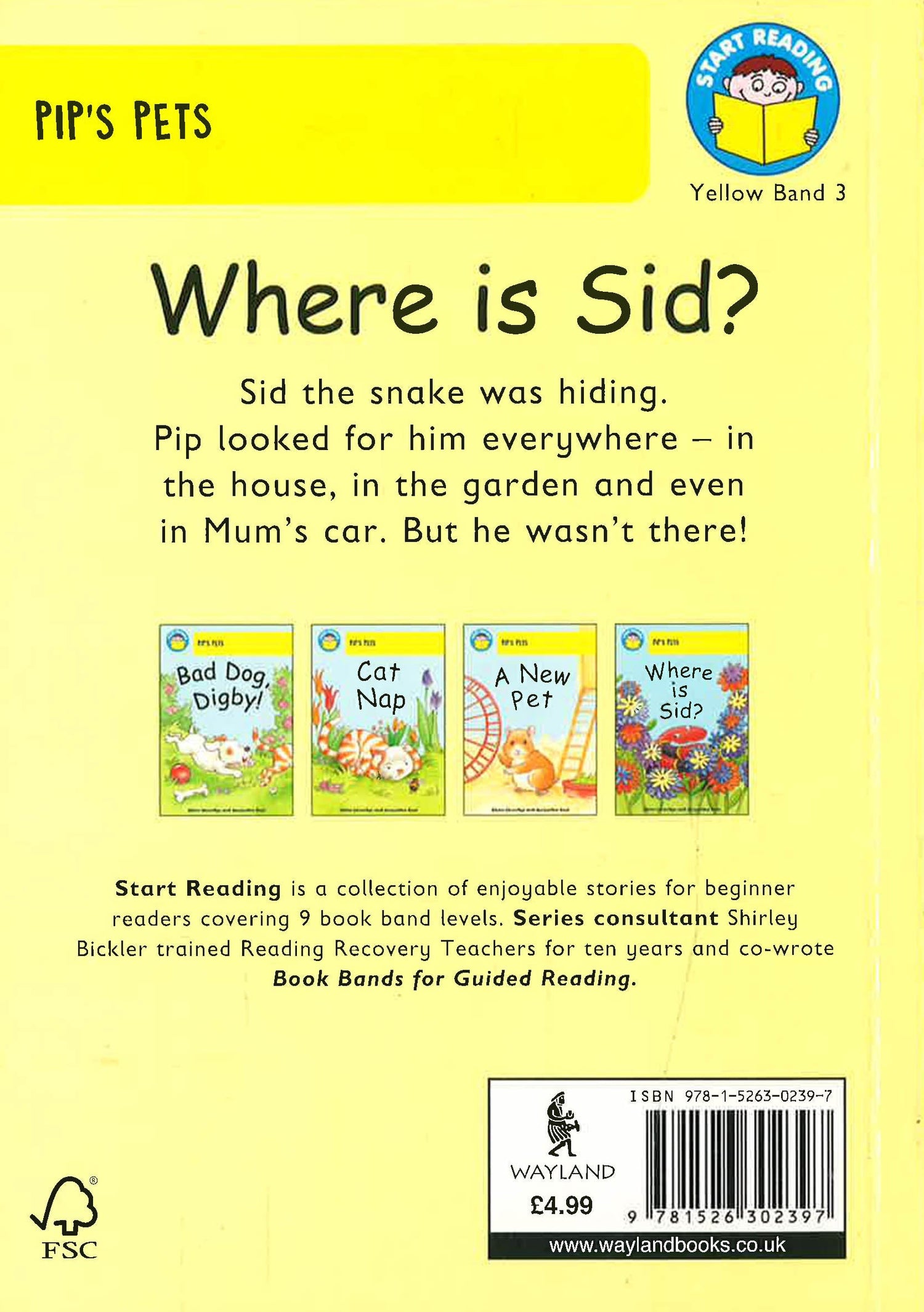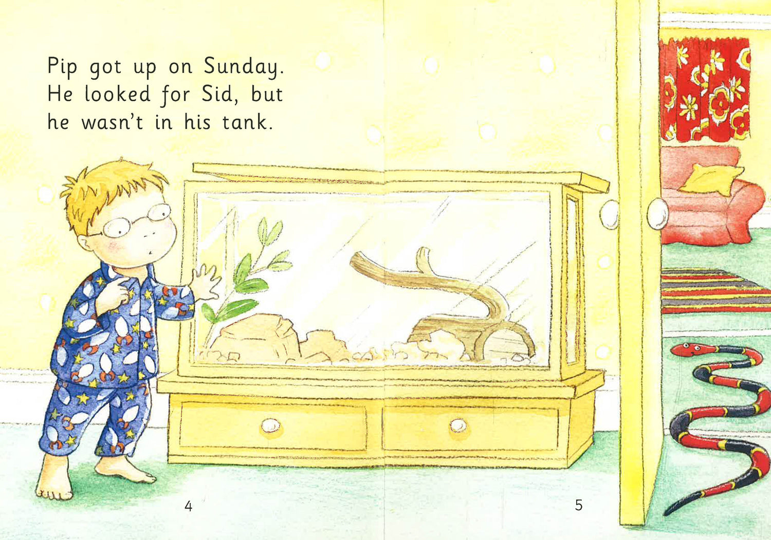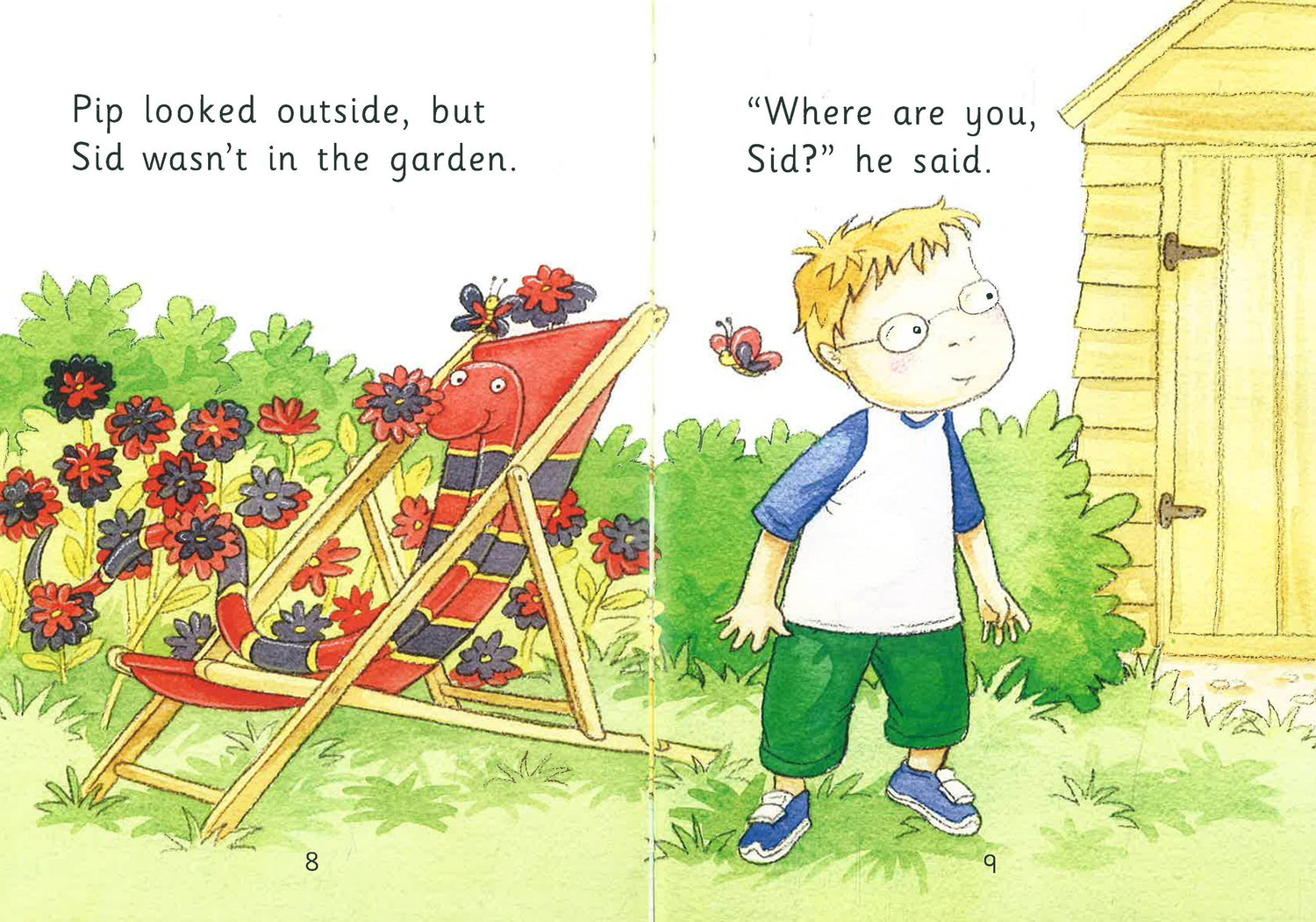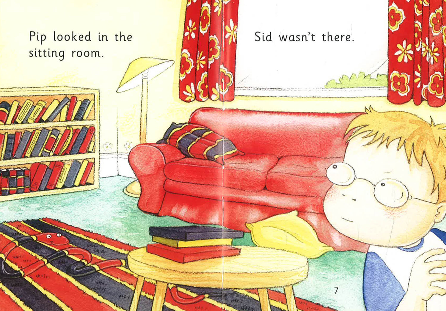 Sid the snake was hiding. Pip looked for him everywhere - in the house, in the garden and even in Mum's car. But he wasn't there!
