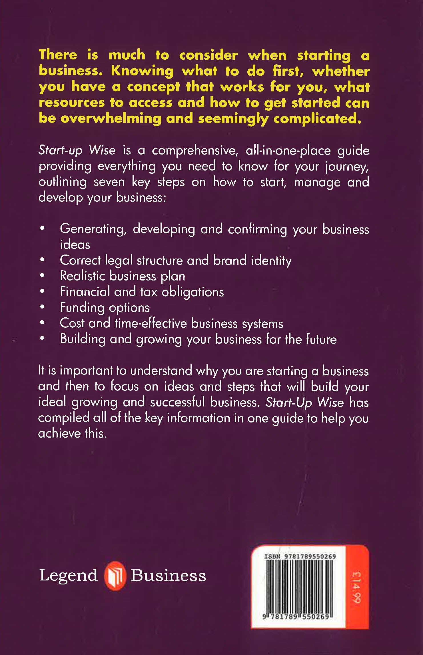 The perfect concise guide to creating your own company from scratch: brilliant' Graham Richards The Seven Stages to Launch You to Success There is much to consider when starting a business. Knowing what to do first, whether you have a concept that works for you, what resources to access and how to get started can be overwhelming and seemingly-complicated. Start-Up Wise is a comprehensive, all-in-one-place guide providing everything you need to know for your journey, outlining seven key steps on how to start, manage and develop your business: Generating, developing and confirming your business ideas Correct legal structure and brand identity Realistic business plan Financial and tax obligations Funding options Cost and time-effective business systems Building and growing your business for the future It is important to understand why you are starting a business and then to focus on ideas and steps that will build your ideal growing and successful business. Start-Up Wise has compiled all of the key information in one guide to help you achieve this. Jonathan Reuvid is a former economist for French oil company Total and later Director of European Operations of the manufacturing subsidiaries of a Fortune 500 multinational before engaging in joint ventures and start-ups in China. He is an experienced business writer having authored and edited over 80 business books.