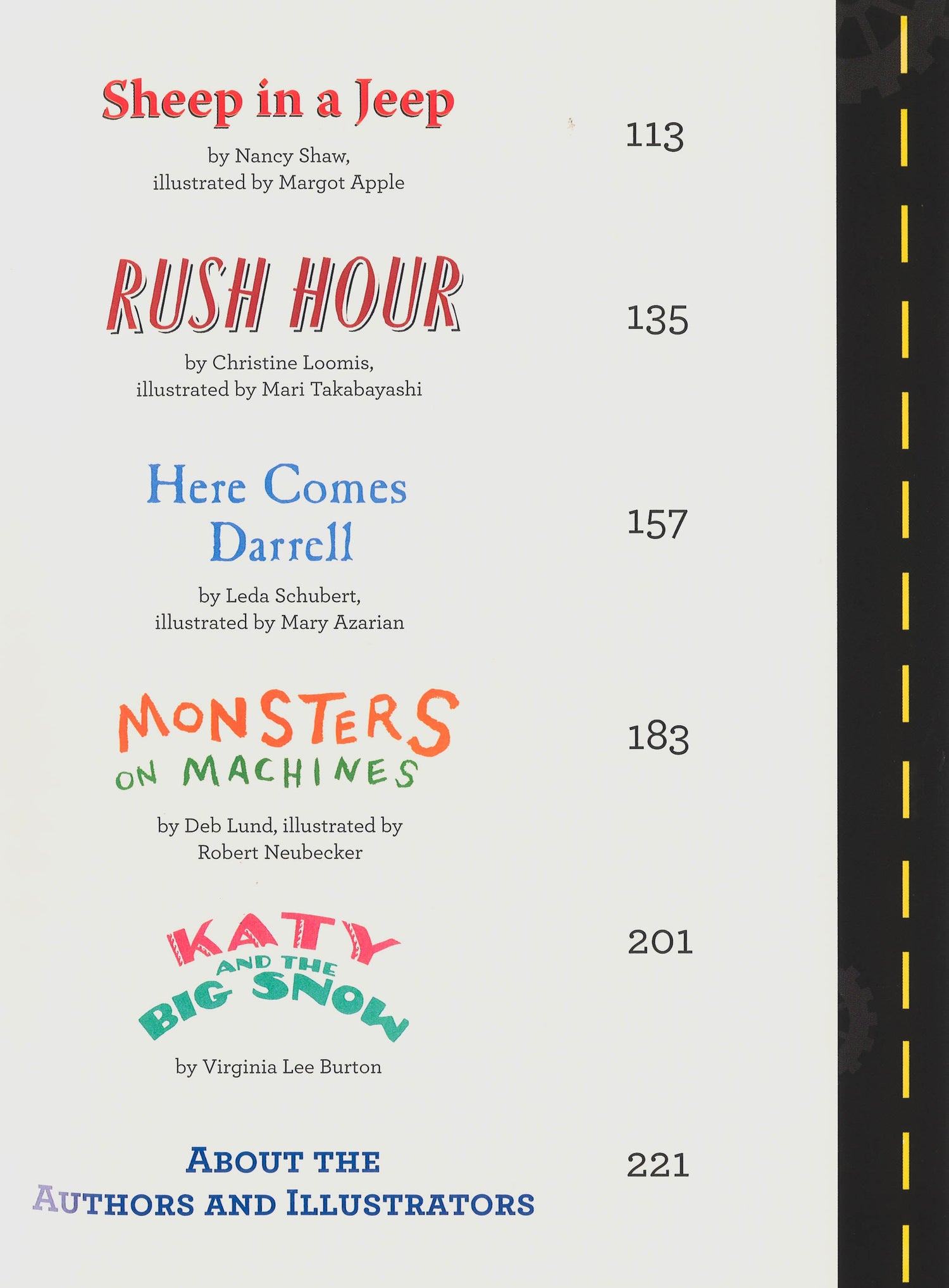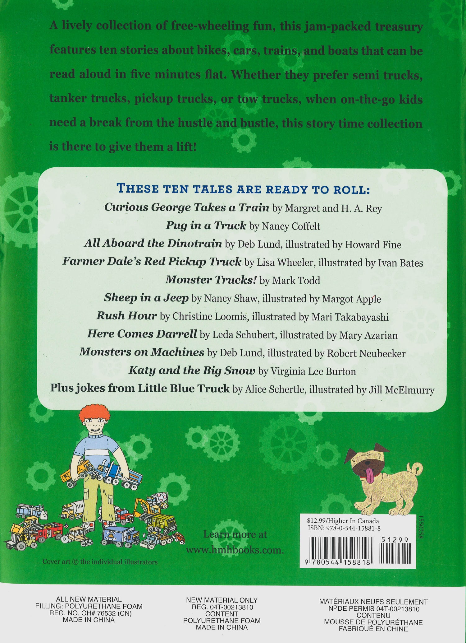 A lively collection of free-wheeling fun, this jam-packed treasury features ten stories about bikes, cars, trains, and machines that can each be read aloud in five minutes flat. Whether they prefer semi trucks, tanker trucks, pickup trucks, or tow trucks, when on-the-go kids need a break from the hustle and bustle this story time collection is there to give them a lift! Features a padded cover withplenty ofshine. Includes ten tales that are ready to roll: " Curious George Takes a Train "by Margret and H. A. Rey" Pug in a Truck "by Nancy Coffelt" All Aboard the Dinotrain "by Deb Lund, illustrated by Howard Fine" Farmer Dale's Red Pickup Truck "by Lisa Wheeler, illustrated by Ivan Bates" Monster Trucks!" By Mark Todd" Sheep in a Jeep" by Nancy Shaw, illustrated by Margot Apple" Rush Hour" by Christine Loomis, illustrated by Mari Takabayashi" Here Comes Darrell" by Leda Schubert, illustrated by Mary Azarian" Monsters on Machines" by Deb Lund, illustrated by Robert Neubecker" Katy and the Big Snow" by Virginia Lee Burton PLUS jokes from Little Blue Truck by Alice Schertle, illustrated by Jill McElmurry"