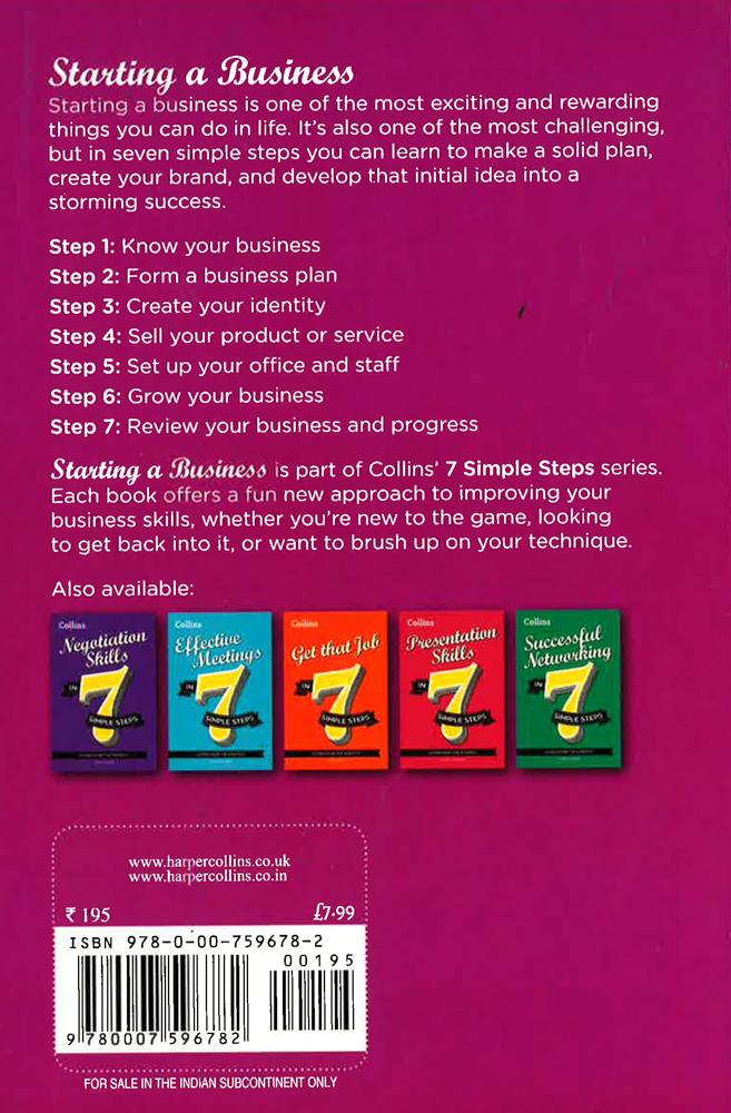 So you've thought about starting a business, but how do you get started? This book breaks it down into seven simple steps. This book includes all the advice you need, from working out the objectives and vision of your company and defining your USPs, to writing a business plan and developing the sales and marketing strategy. Follow our simple steps and learn everything you need for a successful start up. Before long you'll be watching your hard work pay off and doing something you love.