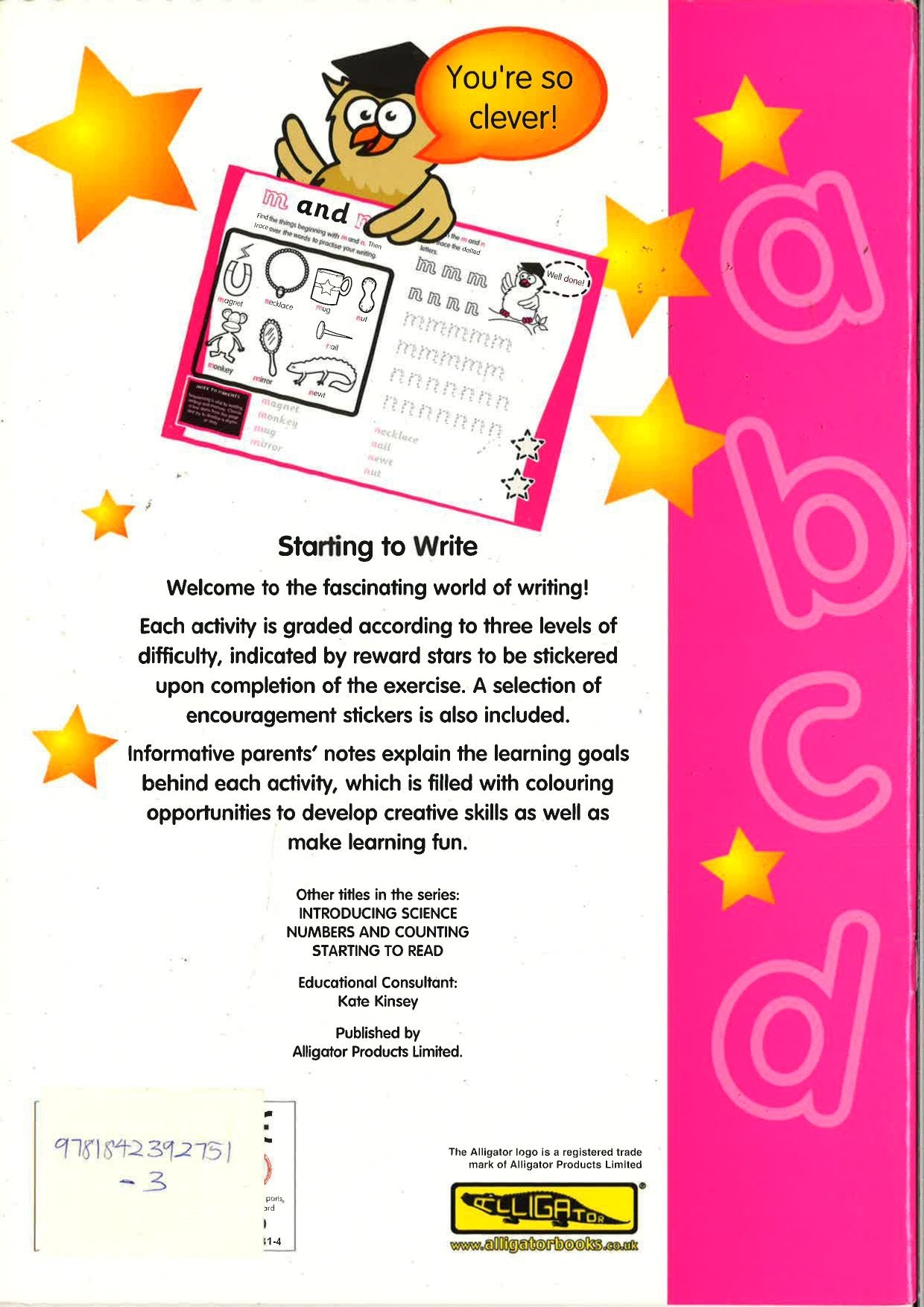 Starting to Write pre-school workbook with over 50 gold reward stickers and stars. A4 sized 32 page workbook with certificate for completing the entire book. Includes activities such as rhyming ends to words, matching words with similar sounds, blending two sounds to make a new sound and much more. Each activity includes colouring activities to develop creative skills and make learning fun. Is graded according to three levels of difficulty and indicated by the number of stickers that are awarded for finishing the page. Informative parent's notes explain the learning goals behind each activity. Suitable for ages 3-5.