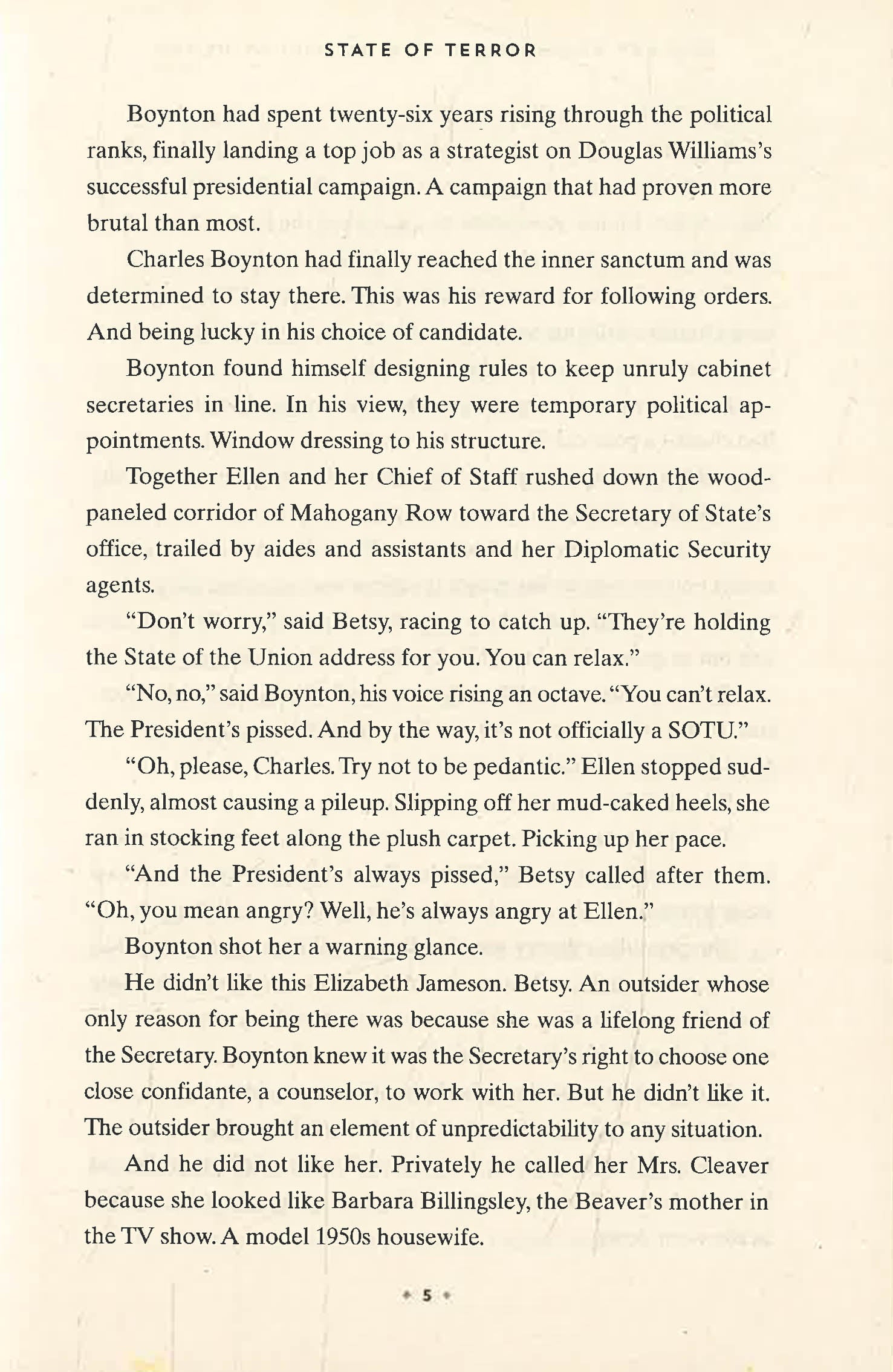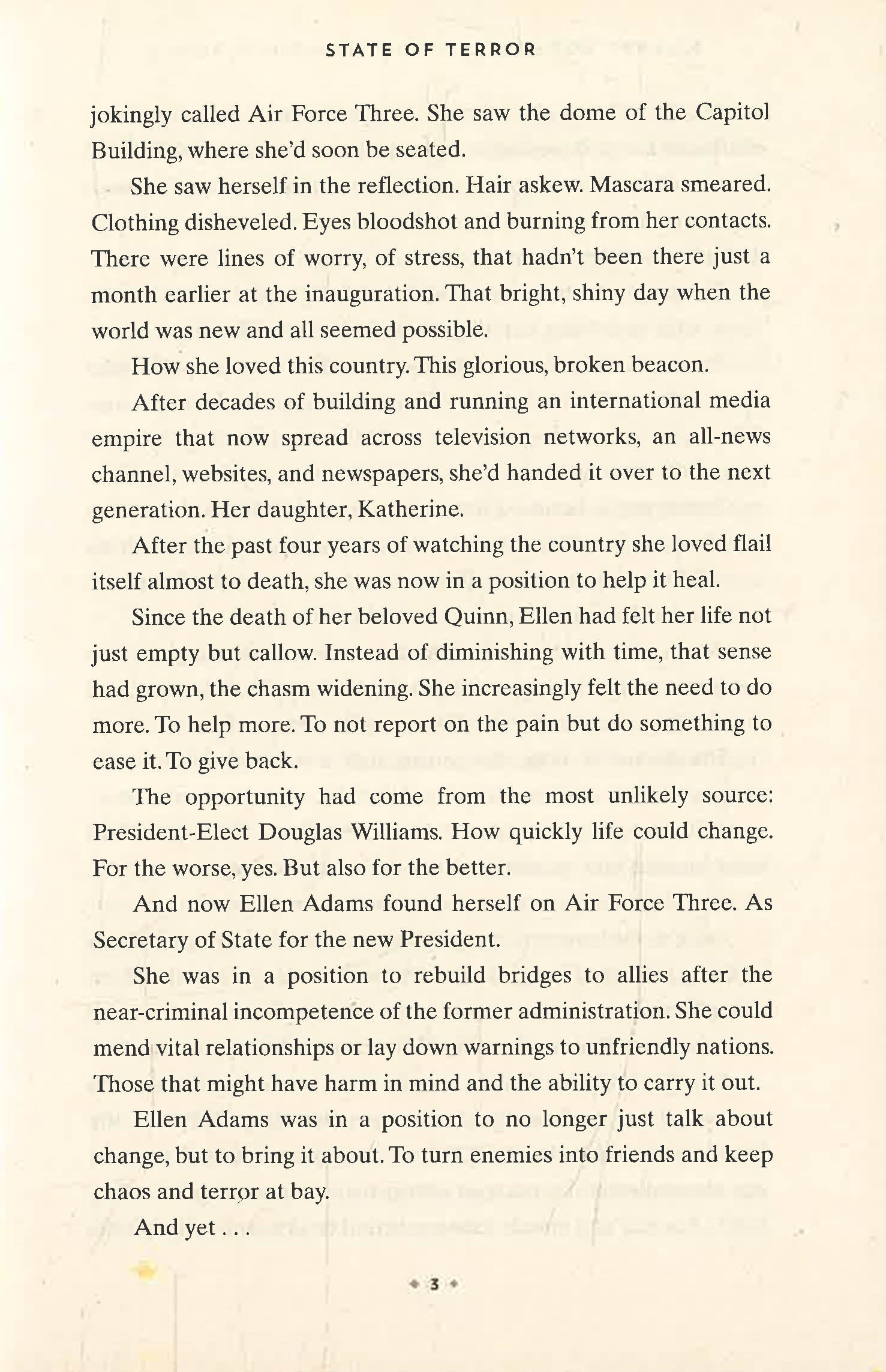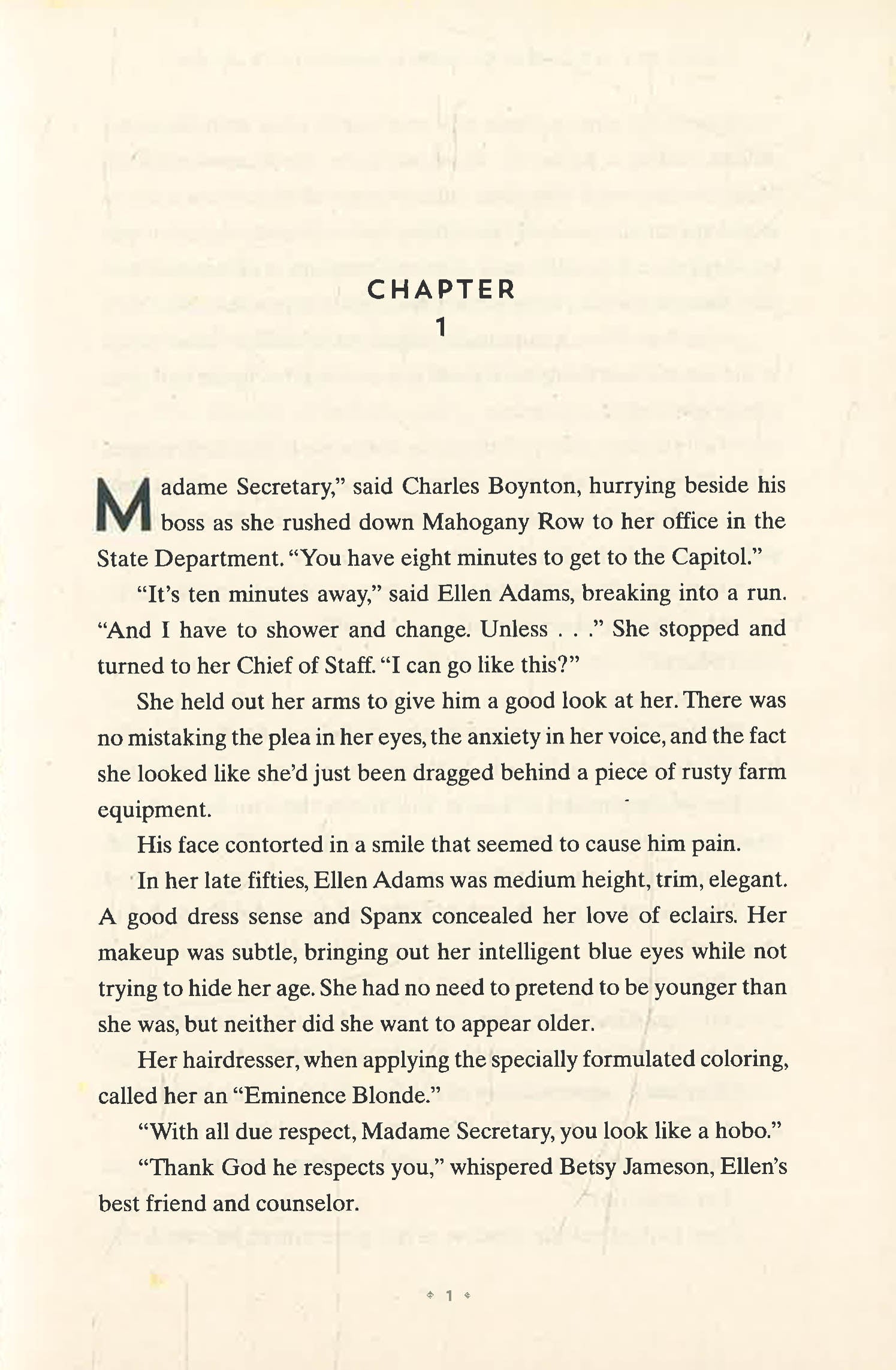After a tumultuous period in American politics, a new administration has just been sworn in. Secretary of State, Ellen Adams, is determined to do her duty for her country. But she is about to face a horrifying international threat . . .