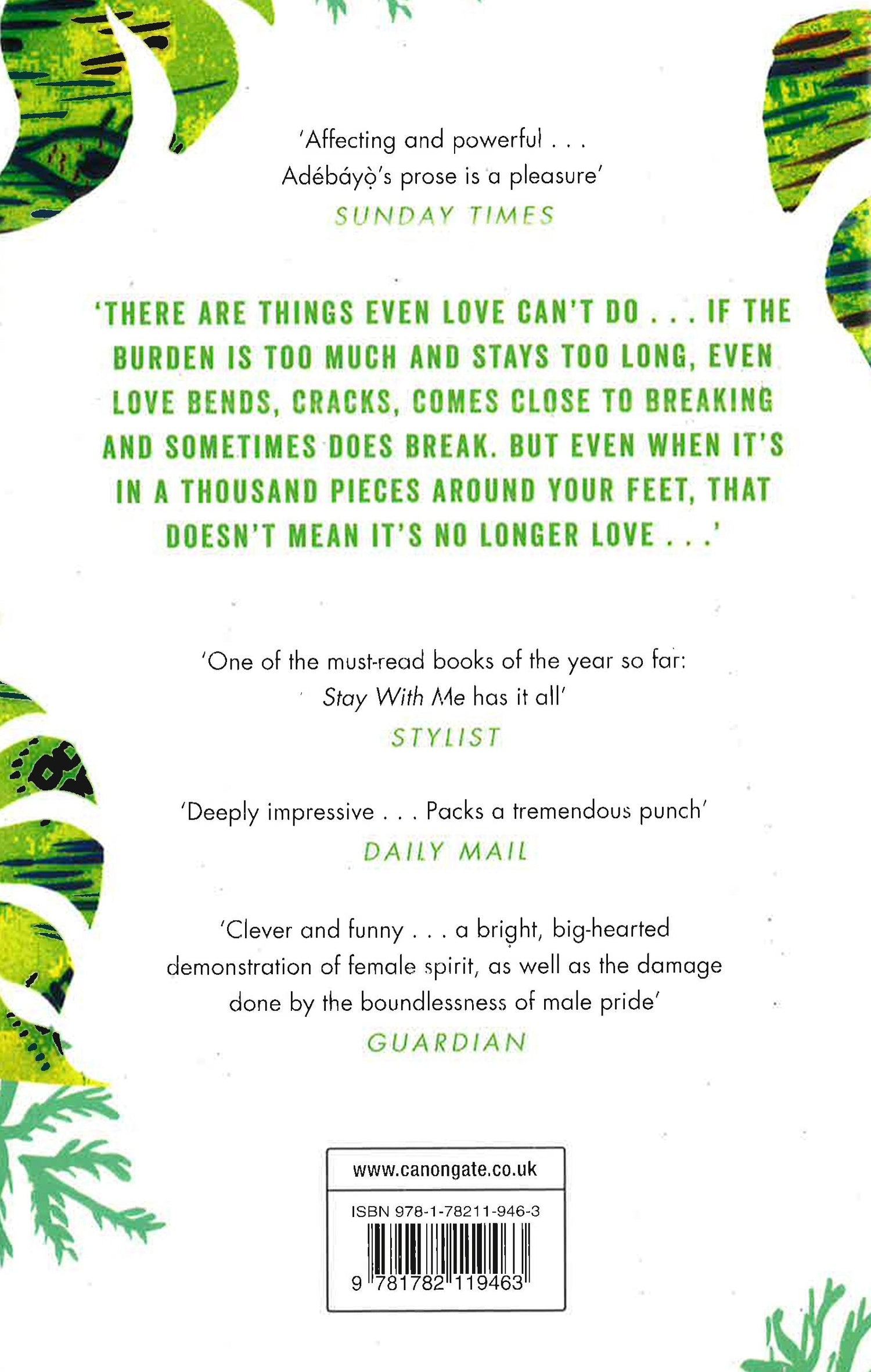 SHORTLISTED FOR THE 2017 BAILEYS WOMEN'S PRIZE FOR FICTION SHORTLISTED FOR THE 2018 WELLCOME BOOK PRIZE LONGLISTED FOR THE 2018 INTERNATIONAL DYLAN THOMAS PRIZE NEW YORK TIMES 100 NOTABLE BOOKS OF 2017 Yejide is hoping for a miracle, for a child. It is all her husband wants, all her mother-in-law wants, and she has tried everything - arduous pilgrimages, medical consultations, appeals to God. But when her relatives insist upon a new wife, it is too much for Yejide to bear. It will lead to jealousy, betrayal and despair. Unravelling against the social and political turbulence of 1980s Nigeria, Stay With Me sings with the voices, colours, joys and fears of its surroundings. Ayobami Adebayo weaves a devastating story of the fragility of married love, the undoing of family, the wretchedness of grief, and the all-consuming bonds of motherhood. It is a tale about our desperate attempts to save ourselves and those we love from heartbreak.