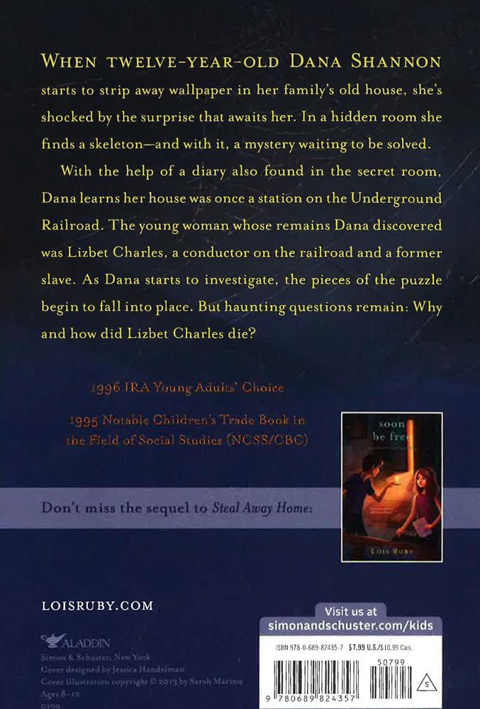 Twelve-year-old Dana and her parents are working hard to turn their new house into a bed-and-breakfast inn when Dana discovers a skeleton and a secret diary behind the wall of one of the bedrooms. This suspenseful, thought-provoking novel tells the story of the Underground Railroad and how the dramatic discovery affects the lives of Dana and her family.