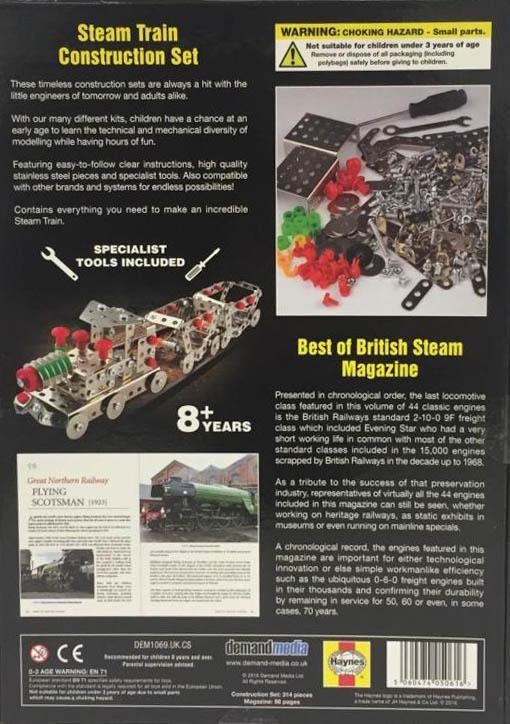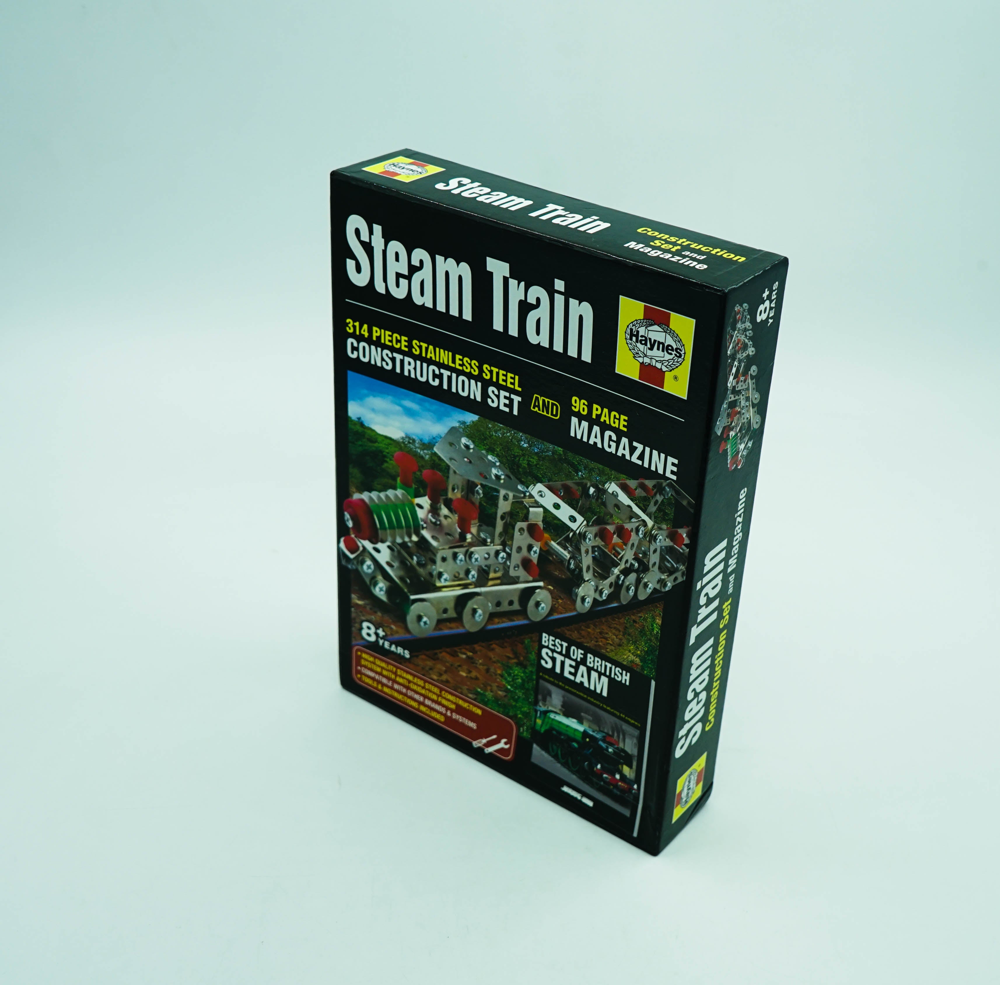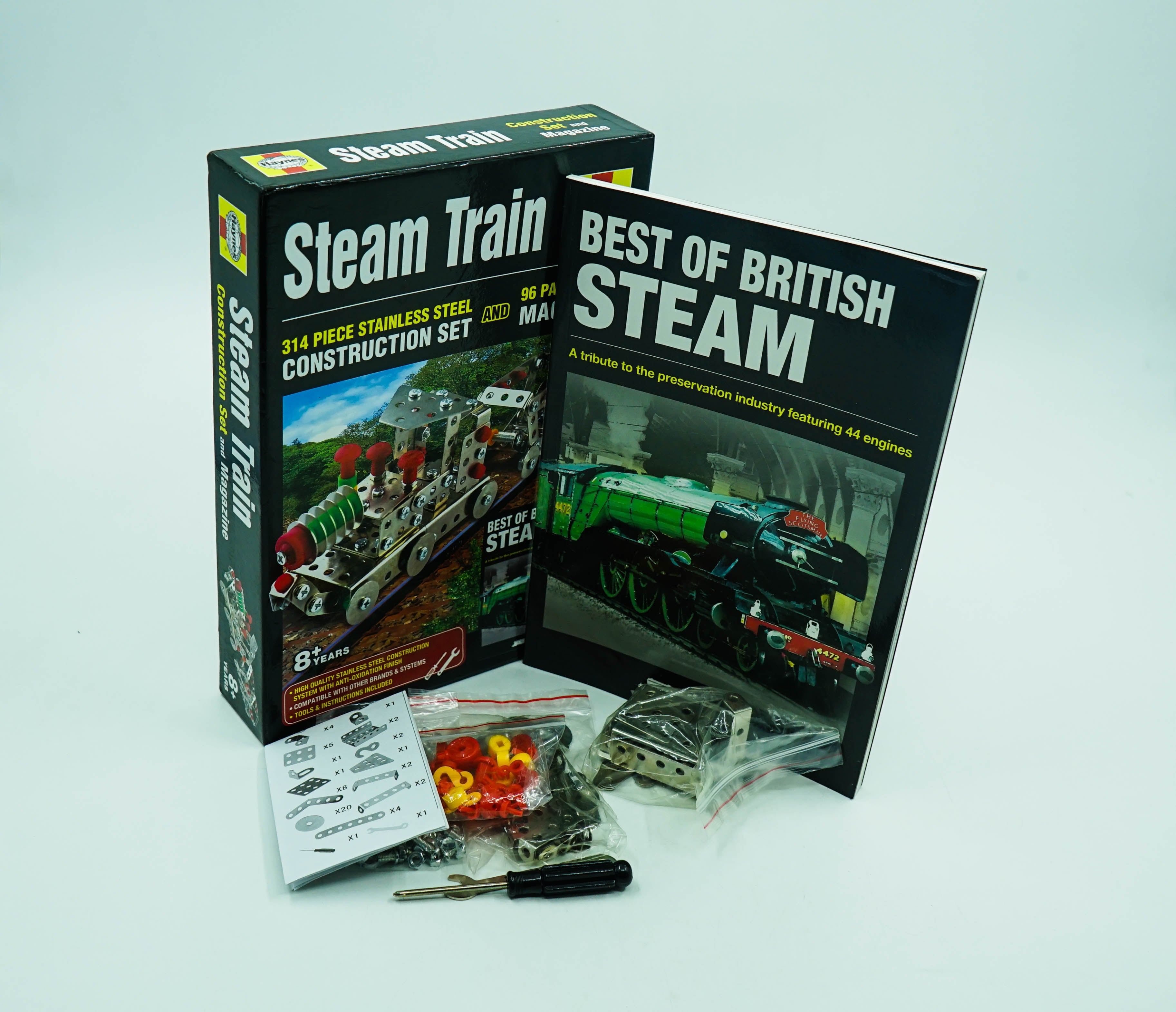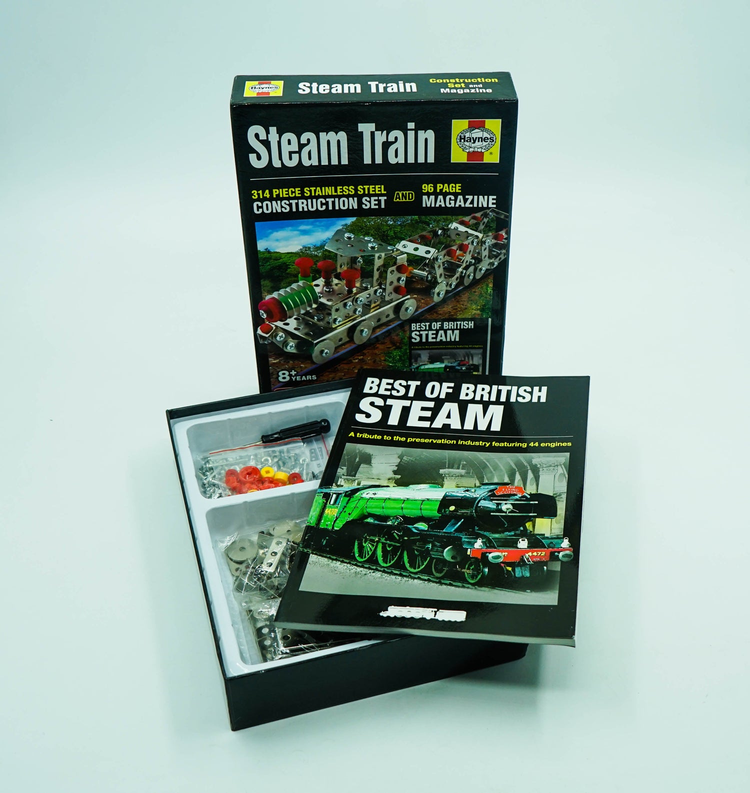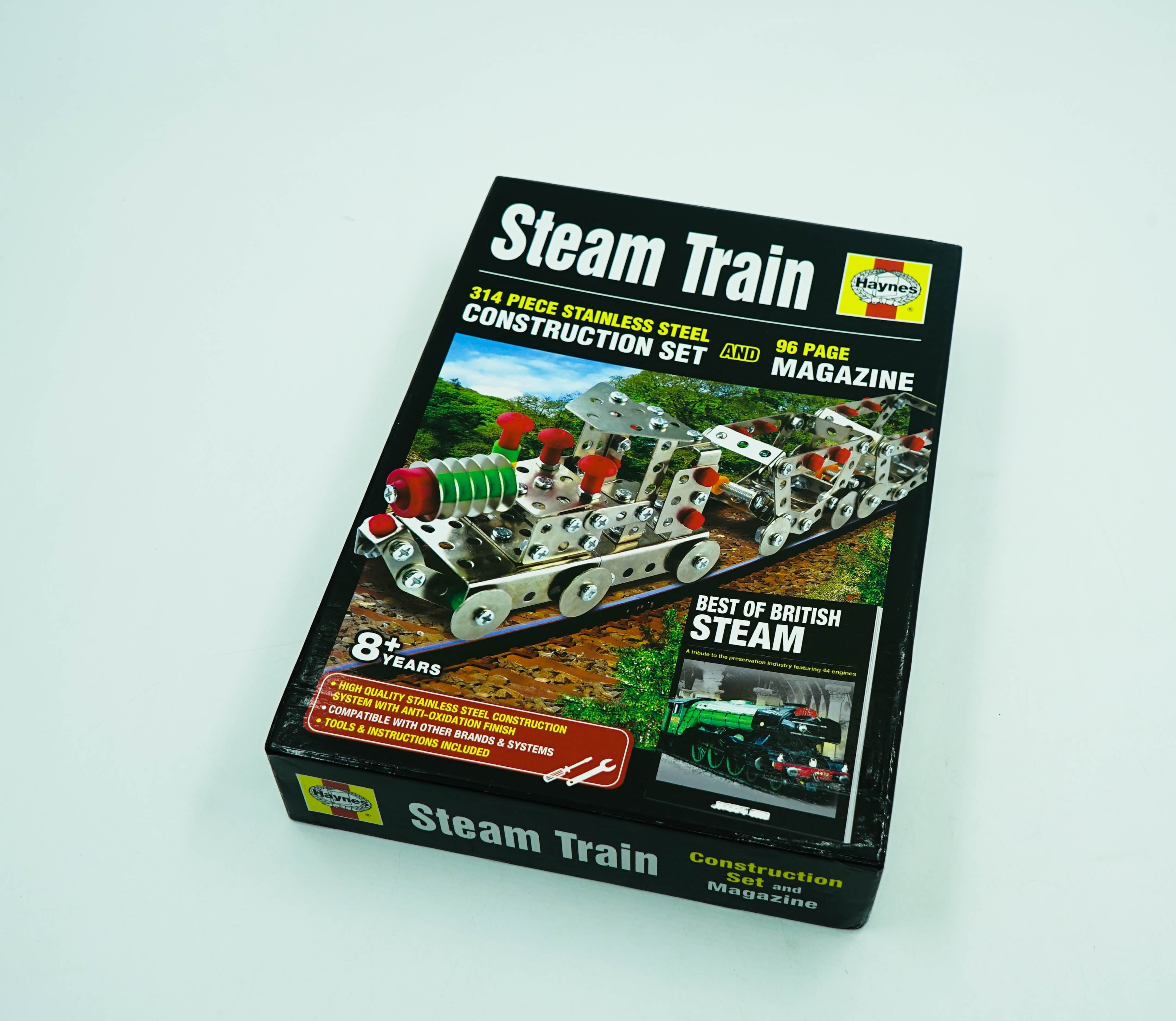 Here we have a Haynes Steam Train Construction Kit Set 314 Pieces. Includes 96 page magazine, high quality stainless steel steam train kit, includes tools and instructions.