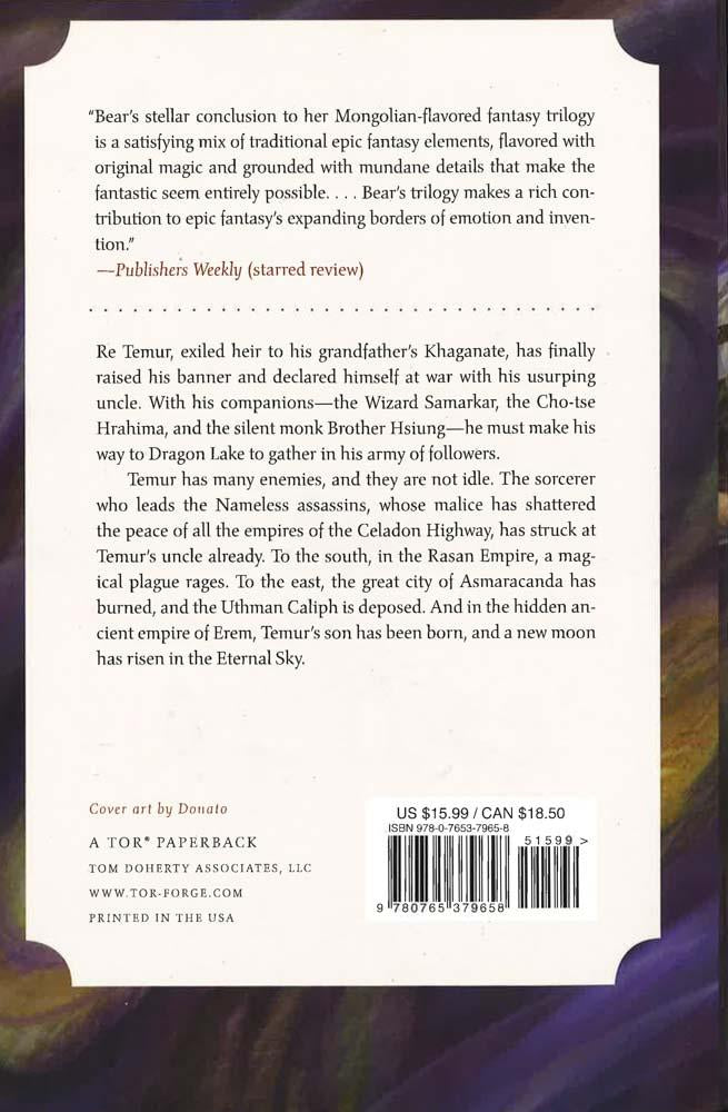 Elizabeth Bear concludes her award-winning epic fantasy trilogy, The Eternal Sky, with Steles of the Sky. Re Temur, exiled heir to his grandfather's Khaganate, has finally raised his banner and declared himself at war with his usurping uncle. With his companions--the Wizard Samarkar, the Cho-tse Hrahima, and the silent monk Brother Hsiung--he must make his way to Dragon Lake to gather in his army of followers. Temur has many enemies, and they are not idle. The sorcerer who leads the Nameless Assassins, whose malice has shattered the peace of all the empires of the Celedon Highway, has struck at Temur's uncle already. To the south, in the Rasan empire, a magical plague rages. To the east, the great city of Asmaracanda has burned, and the Uthman Caliph is deposed. And in the hidden ancient empire of Erem, Temur's son has been born, and a new moon has risen in the Eternal Sky.
