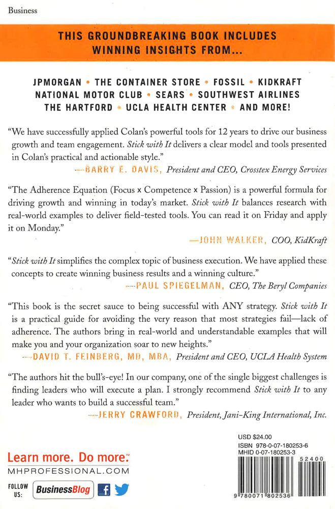 This groundbreaking book includes Winning Insights from...JPMorgan * The Container Store * Fossil * KidKraft * National Motor Club * Sears * Southwest Airlines * The Hartford * UCLA Health Center * and more!There is no such thing as a one-size-fits-all strategy, especially in today's highly complex and competitive world of business. But there is such a thing as a one-size-fits-all approach to business success . . . it's called the Artof Adherence.A good strategy gets you in the game, but adhering to your strategy gets you into the winner's circle. With today's microwave mentality, business leaders often abandonstrategies quickly because they don't yield immediate results.Learn how world-class leaders and organizations master the Art of Adherence. Stick with It reveals a time-tested, real-world validated formula for winning:FOCUS X COMPETENCE X PASSION = ADHERENCEWhen you consistently sharpen Focus, build Competence, and ignite Passion, you plant the seeds of victory. Initially, you may not see tangible results, but rest assured growth is occurring under the surface. Asindividuals and teams stick with it, momentum builds, creating a self-reinforcing cycle of victory.The authors, including leadership guru Lee J. Colan, draw upon 25 years of corporate leadership, field research, executive consulting, and training with many ofthe world's leading organizations. They combine real-world stories with cut-through-the-clutter tools so you can convert this rapid-read book into fast results.READ STICK WITH IT TODAY AND WIN TOMORROW!Praise for Stick With It:"We have successfully applied Colan's powerful tools for 12 years to drive our business growth and team engagement. Stick with It delivers a clear model and tools presented in Colan's practical and actionable style." -- Barry E. Davis, President and CEO, Crosstex Energy Services"The Adherence Equation (Focus x Competence x Passion) is a powerful formula for driving growth and winning in today's market. Stick with It balances research with real-world examples to deliver field-tested tools. You can read it on Friday and apply it on Monday." -- John Walker, COO, KidKraft"Stick with It simplifies the complex topic of business execution. We have applied these concepts to create winning business results and a winning culture." -- Paul Spiegelman, CEO, The Beryl Companies"This book is the secret sauce to being successful with ANY strategy. Stick with It is a practical guide for avoiding the very reason that most strategies fail-lack of adherence. The authors bring in real-world and understandable examples that will make you and your organization soar to new heights." -- David T. Feinberg, MD, MBA, President and CEO, UCLA Health System"The authors hit the bull's-eye! In our company, one of the single biggest challenges is finding leaders who will execute a plan. I strongly recommend Stick with It to any leader who wants to build a successful team." -- Jerry Crawford , President, Jani-King International, Inc.