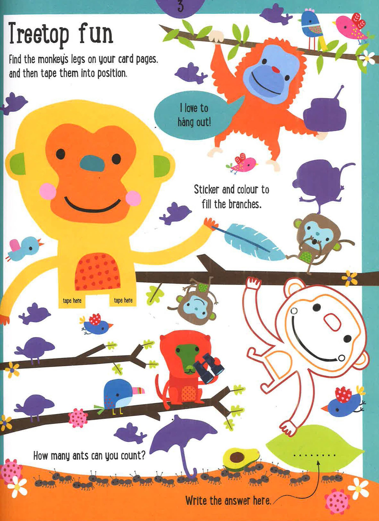 This animal-themed Sticker activity books are full of fun: labyrinths, matching, coloring, jumping grids, etc., all kinds of small animals you can't think of: little lions, monkeys, tigers, whales, peacocks, etc. There are more than 250 stickers and cool cut-out paper models. But before you start, the baby has to prepare the tools: pencil, eraser, and scotch tape so you can make the perfect work!