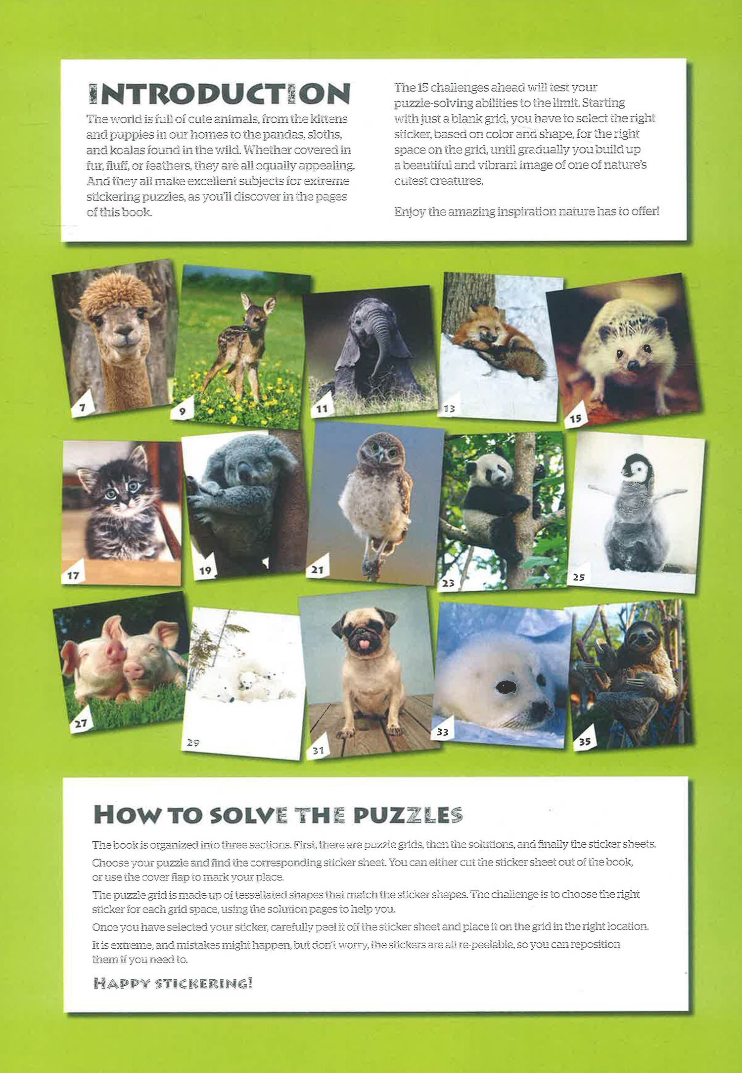 Puzzle enthusiasts who want to try something new and challenging will get extreme enjoyment out of these 15 adorable stickering puzzles. Each puzzle consists of a tessellated grid that includes a few clues to get you started, along with up to 100 reusable stickers to complete the image. When the last sticker is placed, you’ll have a beautiful glossy art poster that is worthy of being displayed on the wall. All types of cute animals from across the world are featured in this addictive puzzle book.