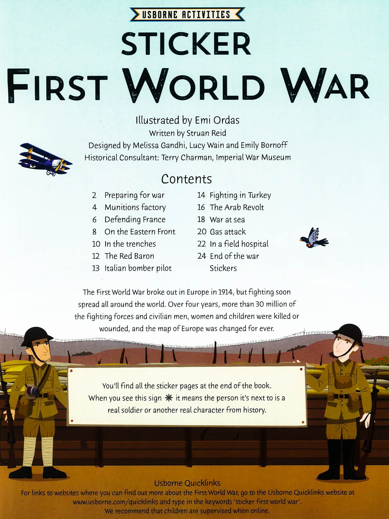 Follow the course of the First World War and meet some of the men and women who took part, from field marshals to factory workers and soldiers in muddy trenches. Includes over 170 stickers of uniforms, clothes and accessories to dress the characters for action, and links to websites and video clips with more information on the First World War.
