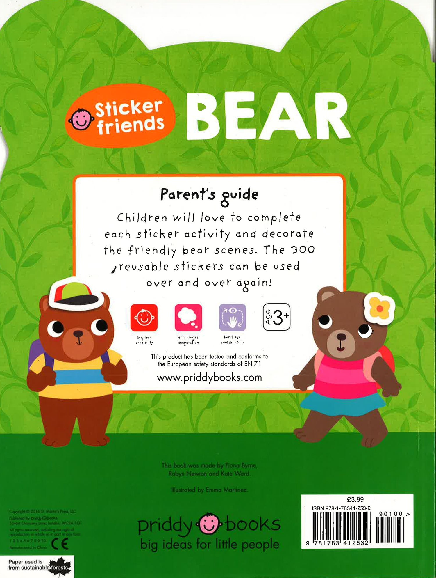 Preschoolers will love the fun-packed pages of this oh-so-cute bear-shaped sticker book. With over 300 adorable bear stickers, little hands will be kept busy decorating the scenes and completing the activities inside. Perfect for rainy days or sunny days, car trips or at home, to share with friends or for individual play, this fabulous book is full of bear stickering fun!
