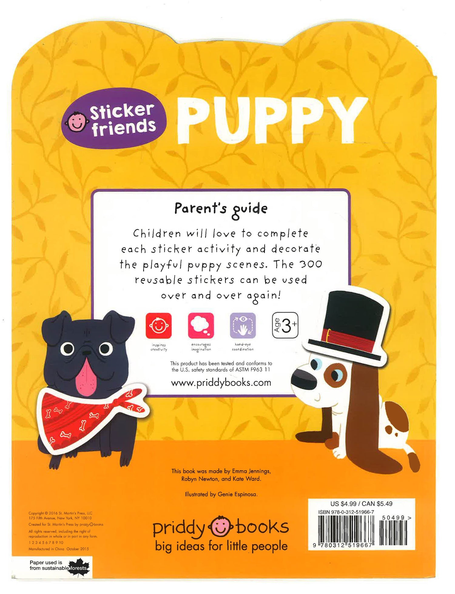 Preschoolers will love the fun-packed pages of this oh-so-cute puppy-shaped sticker book. With over 300 playful puppy stickers, little hands will be kept busy decorating the scenes and completing the activities inside. Perfect for rainy days or sunny days, car trips or at home, to share with friends or for individual play, this fabulous book is full of puppy stickering fun!