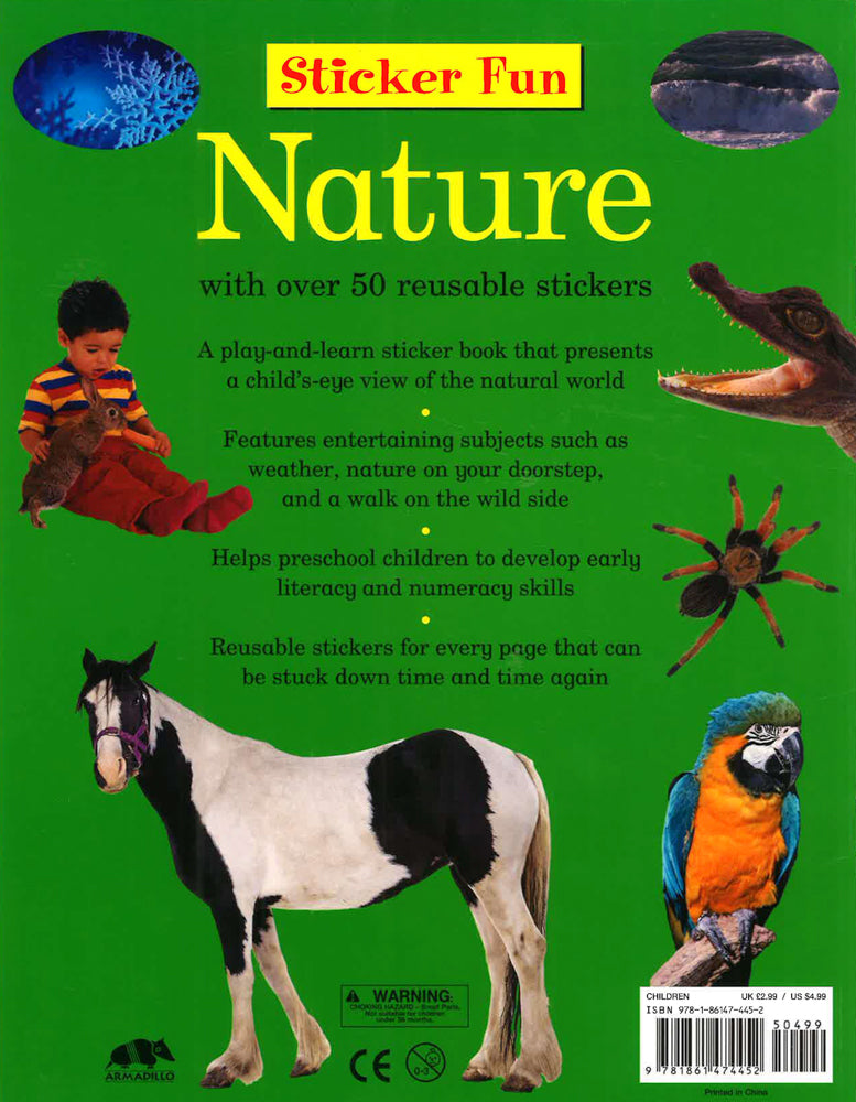 This title comes with over 50 reusable stickers. This is a play-and-learn sticker book that presents a child's-eye view of the natural world. You can meet familiar and strange animals and plants in a variety of locations: at home, on the beach, in the forest and on the farm. Fun words complement lively photographs and set simple challenges to seek the right sticker for the right place - find another duck to paddle in a puddle, look for leaves to blow in the wind, pick up a missing penguin, find the snail who left the trail, and much more. It features entertaining subjects such as weather, nature on your doorstep, and a walk on the wild side. It helps preschool children to develop early literacy and numeracy skills. It offers reusable stickers for every page that can be stuck down time and time again. Give your child an excellent start to their learning with this lively activity book. Hunt for the escaped hamster, find another wriggling worm in the wet grass, seek the sheepdog's lost flock, and complete a line of marching ants. Number skills and basic vocabulary are introduced through simple words and pictures.Find the yellow flower, place some more plants on the table and find others to grow in the garden. The sticker activities put learning into practice and quite naturally make it an enjoyable experience for early readers.