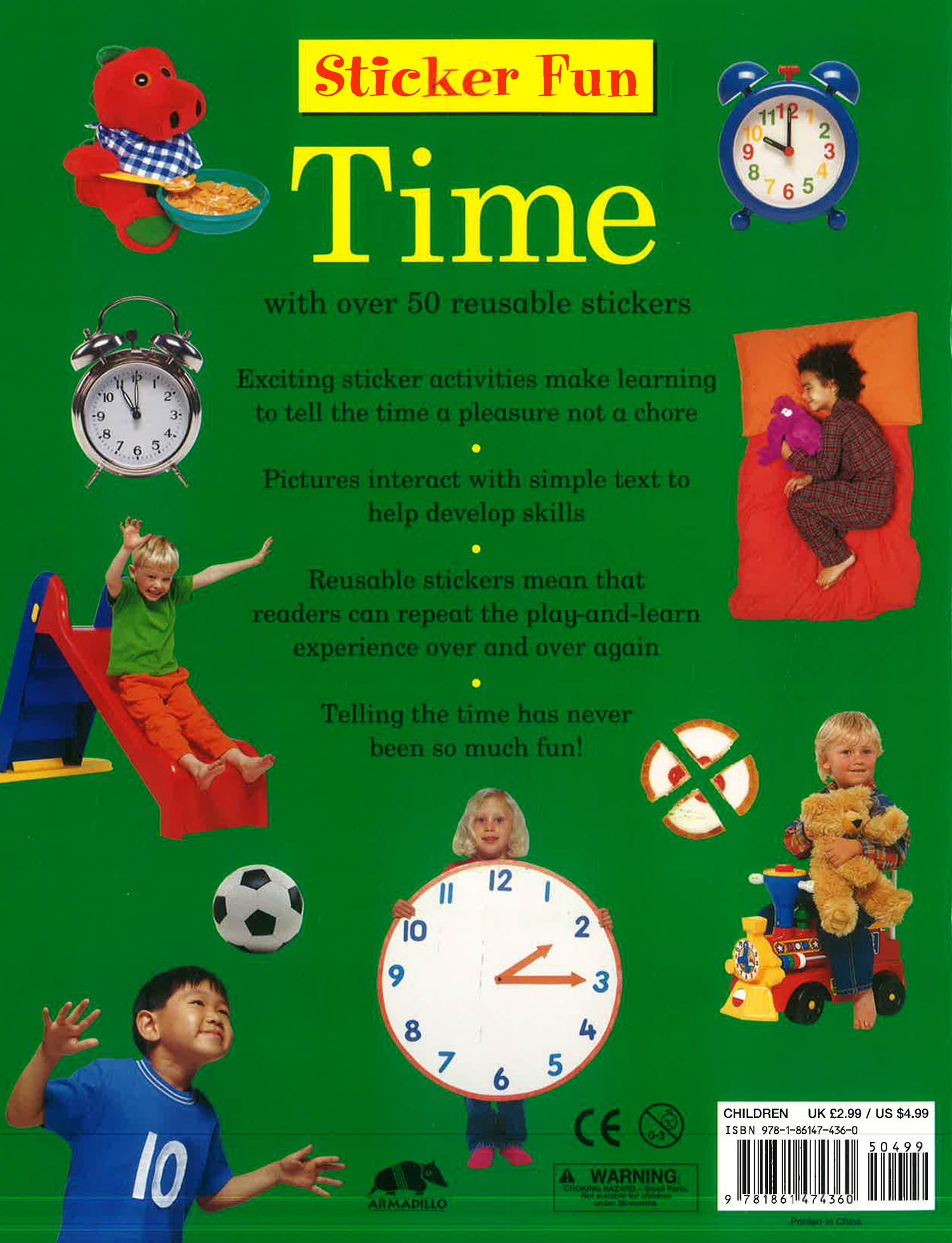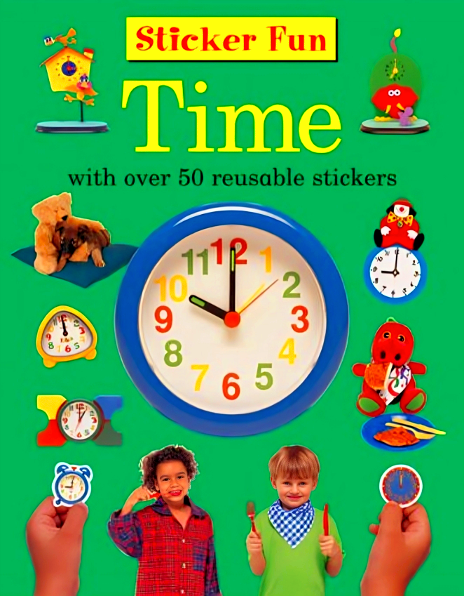 This title comes with over 50 reusable stickers. Features: exciting sticker activities make learning how to tell the time a pleasure not a chore; find some puppies eating breakfast at 7 o'clock, seek a rabbit getting ready at 8 o'clock, and two teddy bears exercising at 11 o'clock, and find some toys for bathtime; pictures interact with simple text to help develop skills; reusable stickers mean that readers can repeat the play-and-learn experience time and time again; stick down two more clocks that say 9 o'clock, find a busy builder boy at 10 o'clock, and put a sleepy puppy to bed for an afternoon nap; full of action photographs of children, animals and toys for youngsters to identify with; and, learning to tell the time has never been so much fun! What time is it? It's time for sticker fun! Young children will adore the bright pictures, games and stickers in this engaging play book. They will delight in finding the bathtime babies, feeding the hungry children and matching the right clocks to all the different activities. After covering various times of day and hours on the clock, the book also teaches children about half and quarter hours, minutes and having to be on time.What's more, the stickers are reusable, so the games can be enjoyed any time at all.