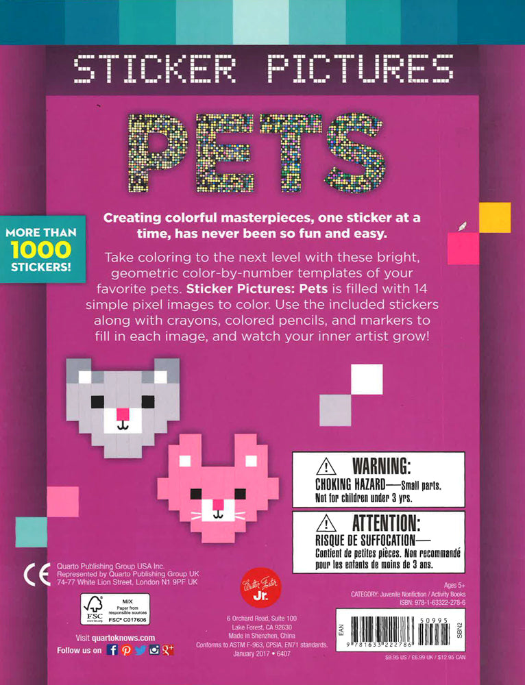 Sticker Pictures: Pets gives you tons of pixel inspired images to color in and put stickers on. Grow your inner artist by coloring your favorite pets! Take coloring to the next level with these bright, geometric color-by-number templates of your favorite pets. Sticker Pictures: Pets is filled with 14 simple pixel images to color, including a puppy, kitten, bunny, and hamster. Use the included stickers along with crayons, colored pencils, and markers to fill in each image, and watch your inner artist grow!