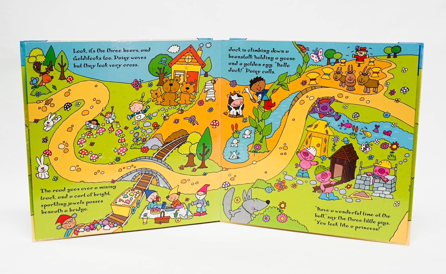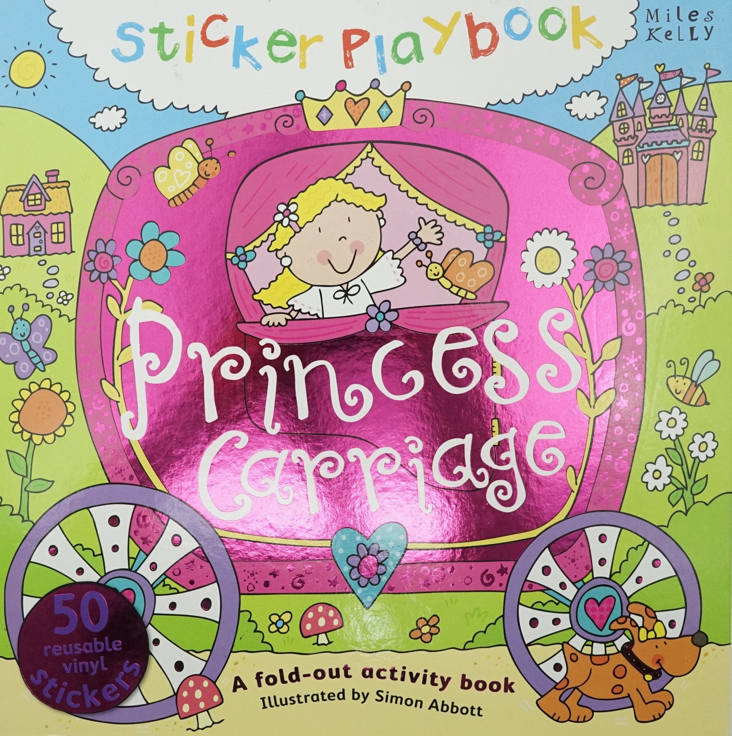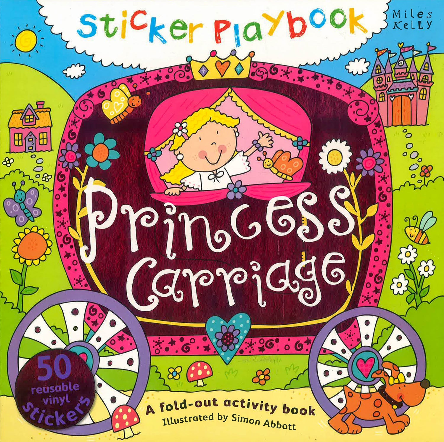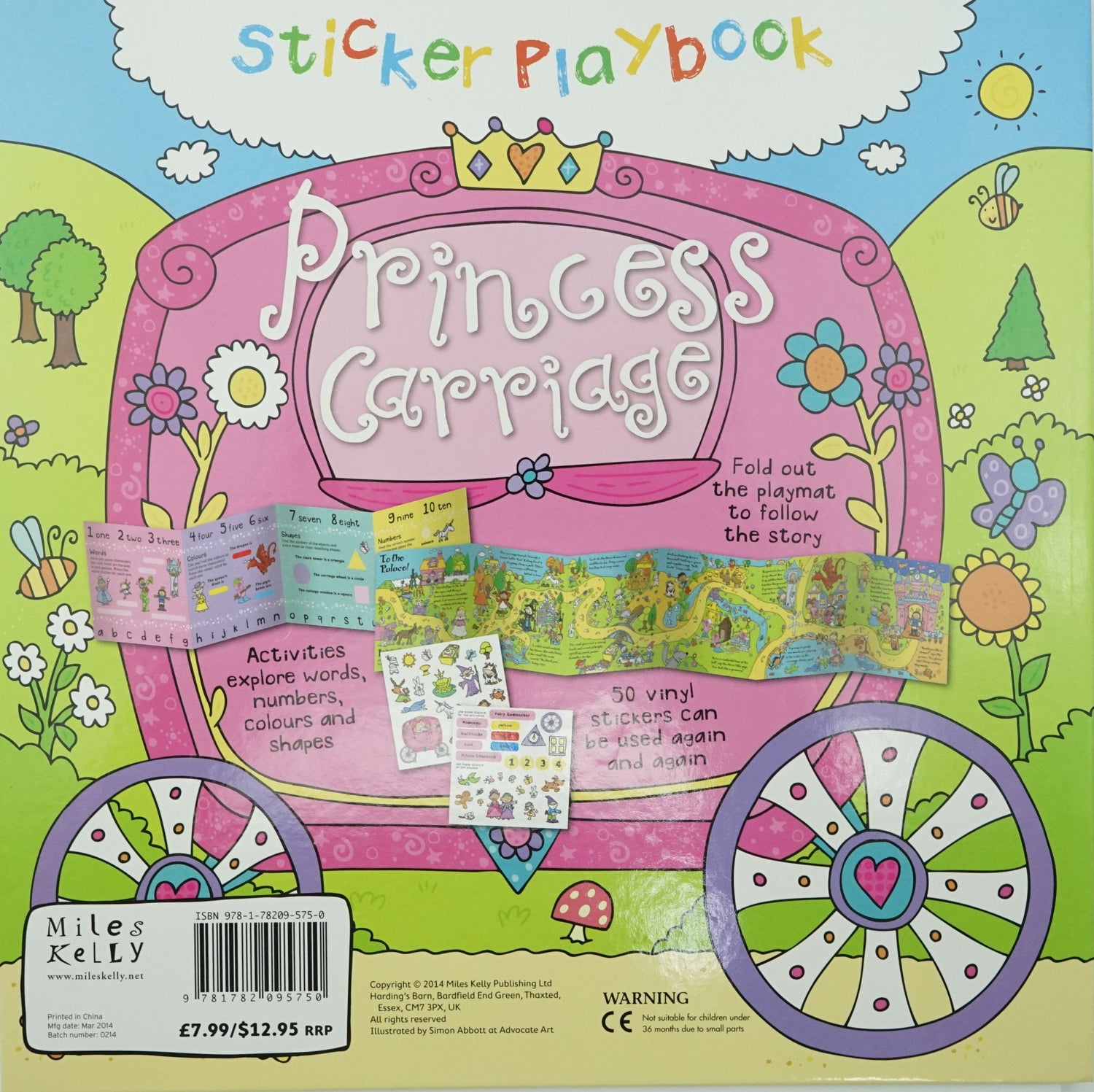 Sticker Playbook Princess Carriage is a double-sided play mat for toddlers, with learning activities, 50 reusable vinyl stickers and a fantastic illustrated short story about Daisy and her journey to the palace for the prince's ball. # The playmat folds away easily after playtime.# Your child can use the stickers with the activity pages to develop number and word recognition.# You can share the story, full of favourite fairytale characters, with your child whilst using the playmat to keep them engaged. Synopsis - Product detailsOn one side, a simple story accompanies an illustrated route that children can interact with using the stickers, which include the fairy tale characters of Rapunzel, Fairy Godmother and Prince Charming. The play mat can be turned over for kids to complete the sticker activities, covering words, colours, shapes and numbers. Both long concertina pages feature wonderfully detailed illustrations by Simon Abbott for young children to explore. Perfect for folding out on the floor, young children will enjoy playing and learning with Sticker Playbook Princess Carriage, one of our most popular fold-out books for toddlers. Excerpts from the story inside Princess Carriage Sticker Playbook: It's the day of the prince's ball and Daisy wishes she could go. Suddenly in a swirl of stars her fairy godmother appears! A witch stands outside her house. She asks Daisy if she would like some sweets. "No thank you," Daisy says. Fun word, colour, shape and number activities for kids: # Test your fairy tale knowledge and place the correct character names next to the illustrations.# What colour is the dragon?# Find the stickers of the objects and place them on their matching shapes. For example, 'The clock tower is a triangle'.