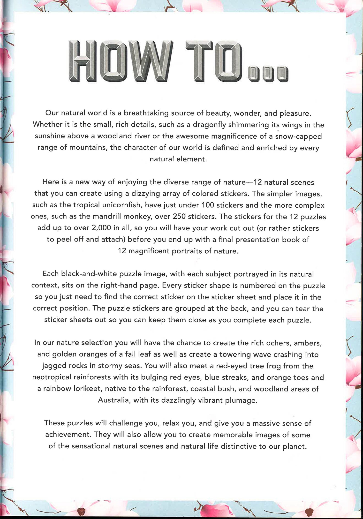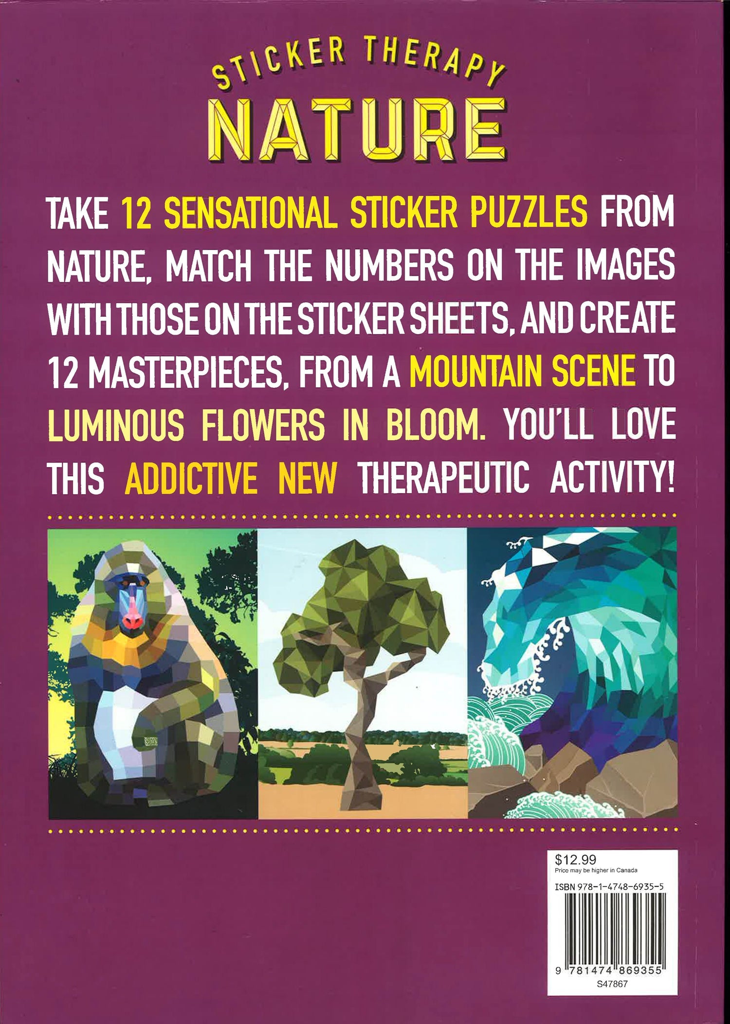 Sticker Therapy Nature is a wonderful activity book of sticker puzzles. With 12 sensational sticker puzzles from nature, match the numbers on the images with those on the sticker sheets and create 12 masterpieces, from a mountain scene to luminous flowers in bloom. You'll love this addictive new therapeutic activity!