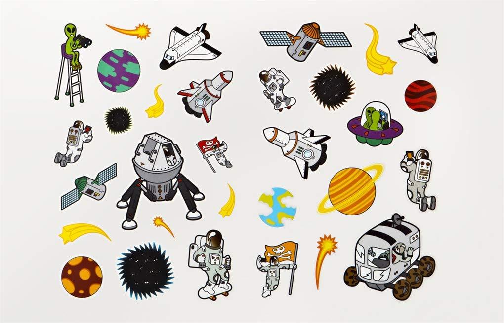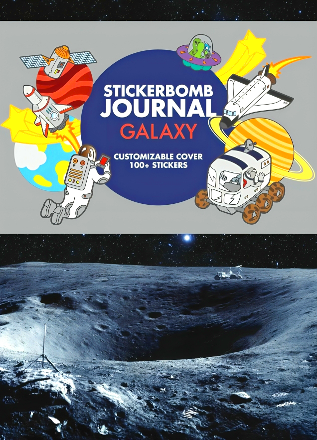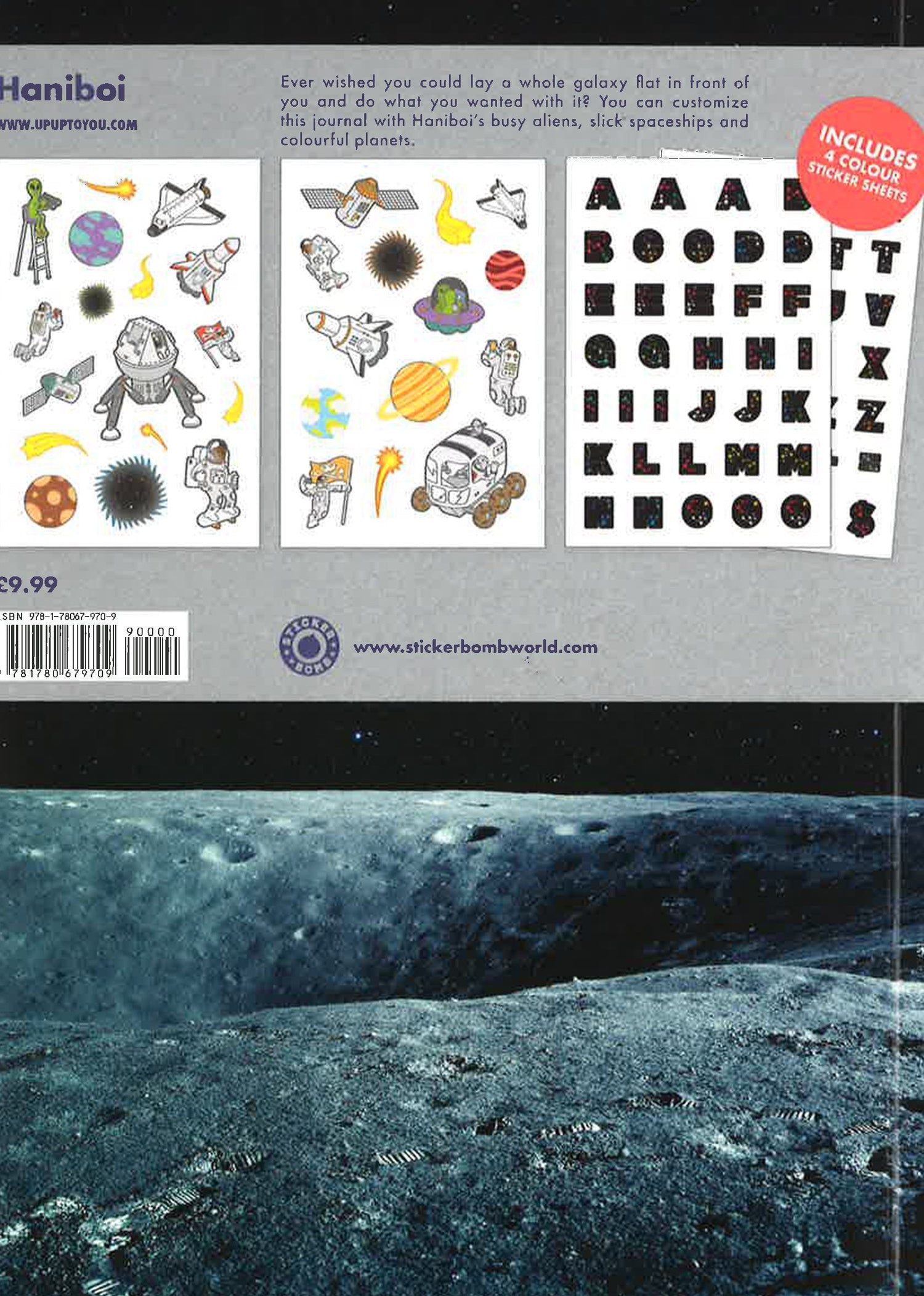 This original range of journals includes sticker sheets you can use to customize the covers and create a unique design. Each journal has a pocket at the back containing four sheets of colourful vinyl stickers specially created by an artist on a particular theme. Two sheets have pictorial stickers and two have letters and symbols so you can mix words and images to decorate the journals however you wish. The moonscape covers of this Galaxy journal can be decorated with the spaceships, astronauts, rockets, planets and aliens of artist Haniboi. Add words or names using his colourful letters and symbols to make a fully personalized journal.