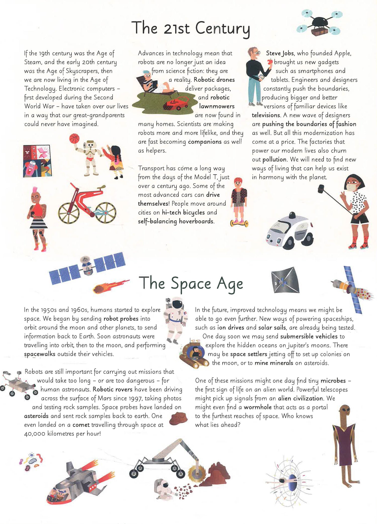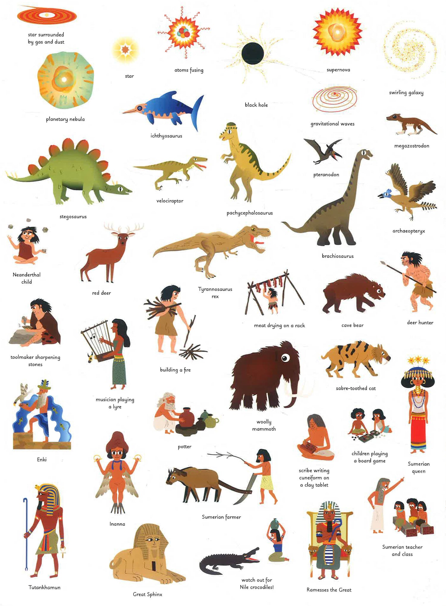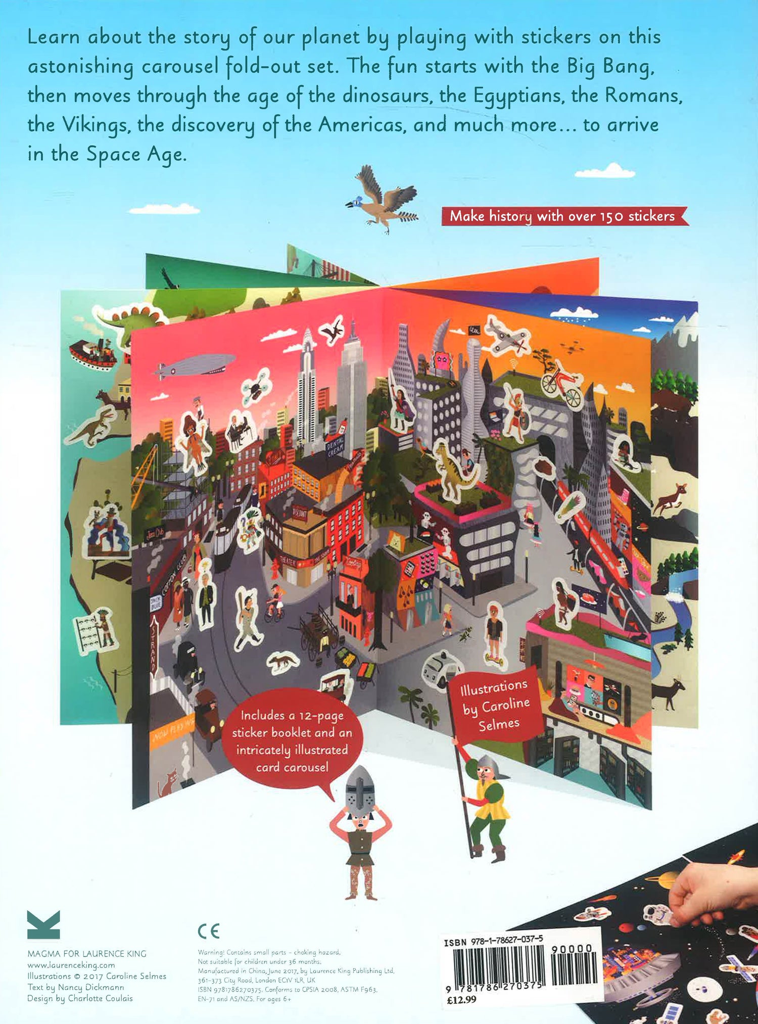 Learn about the history of the world, stickering this inventive new format as you learn! Sticky History of the World includes a large-format, eight-page sticker booklet and an intricately illustrated, eight-panel fold-out card carousel. Each of the panels of the carousel is based upon an era of the history of the world, from the Big Bang and the age of the dinosaurs, via the Romans and the Egyptians, right up to the modern age, and even into the future. Use the stickers to decorate the panels and to create your own incredible picture of the world!