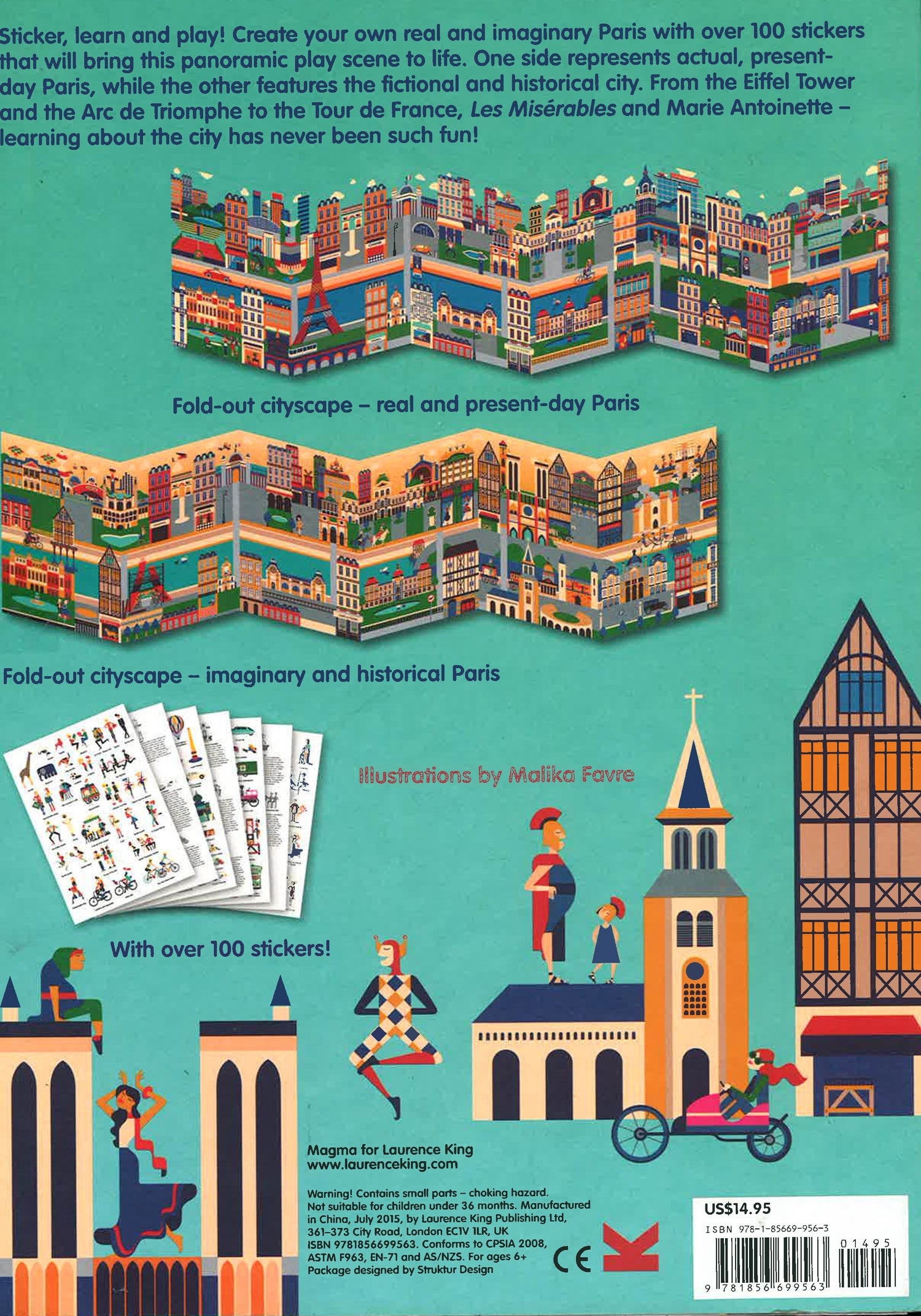 Sticker, learn and play! Create your own real and imaginary Paris with over 100 stickers that will bring this panoramic play scene to life. One side represents actual, present day Paris, while the other features the fiction al and historical city. From the iconic Louvre pyramid and the Eiffel Tower to the Three Musketeers and Napoleon learning about the city has never been such fun!