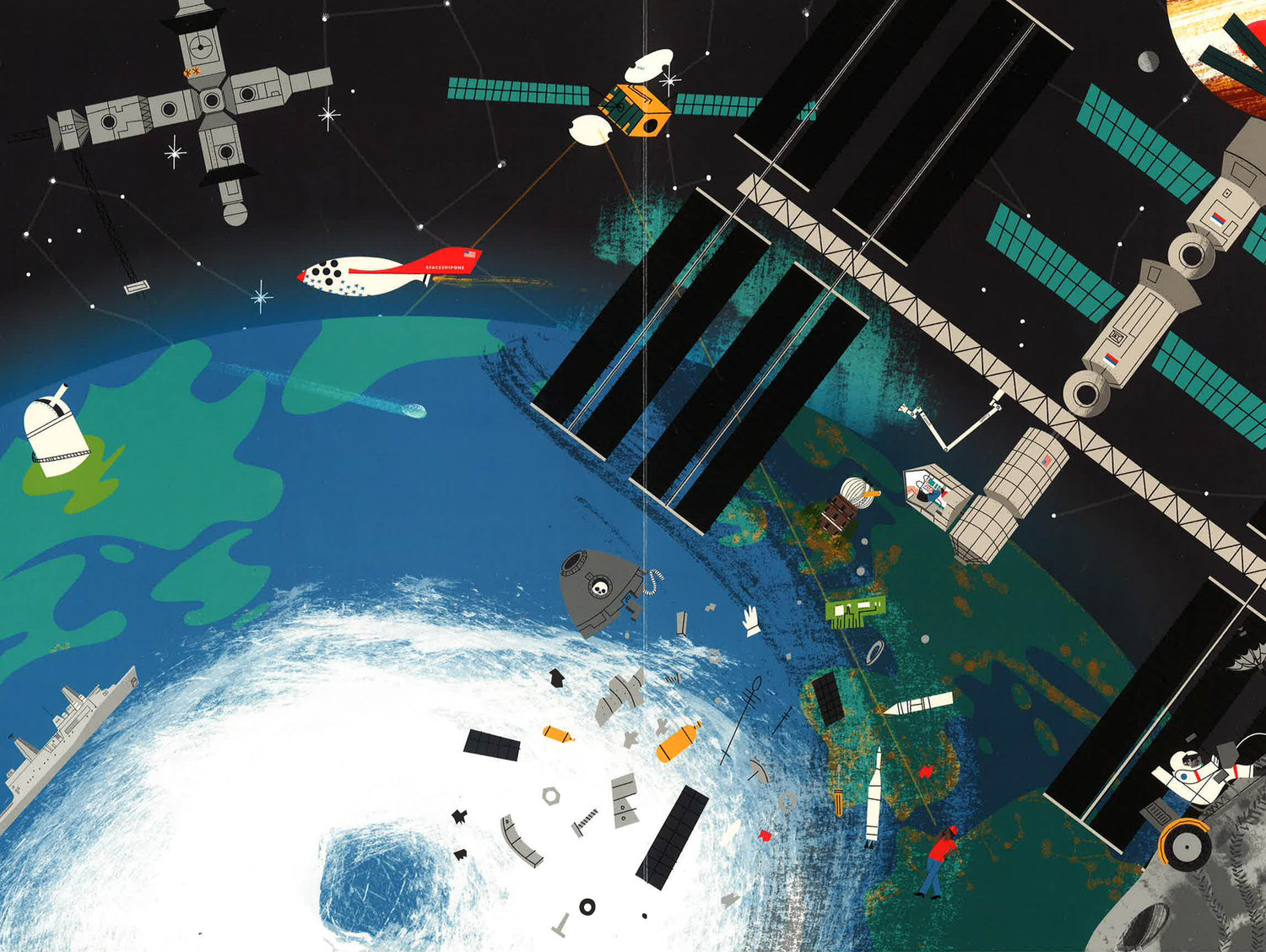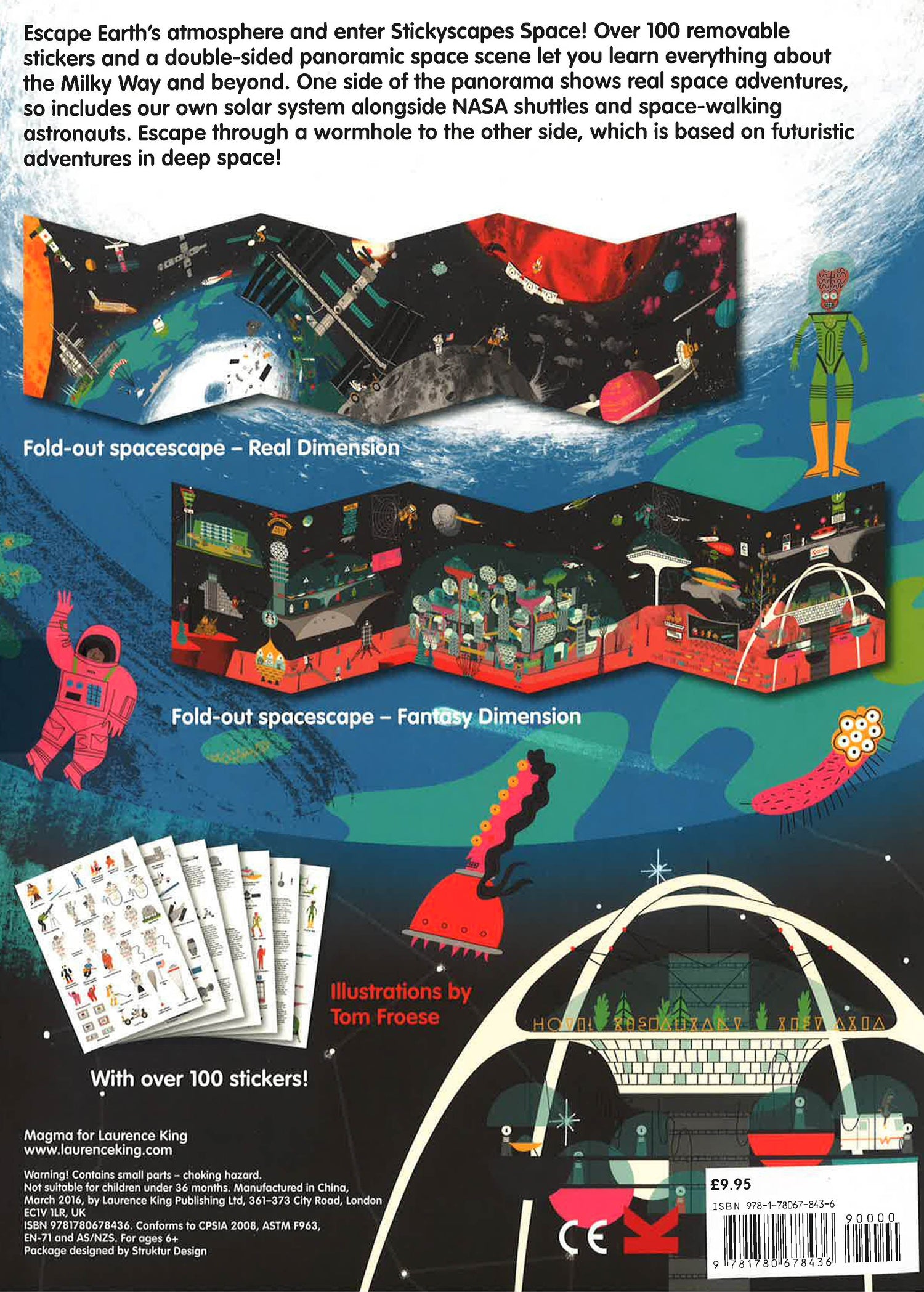 Escape Earth's atmosphere and enter Stickyscapes Space! Over 100 removable stickers and a double-sided panoramic space scene let you learn everything about the Milky Way and beyond. One side of the panorama shows real space adventures, so includes our own solar system alongside NASA shuttles and space-walking astronauts. Escape through a wormhole to the other side, which is based on futuristic adventures in deep space!