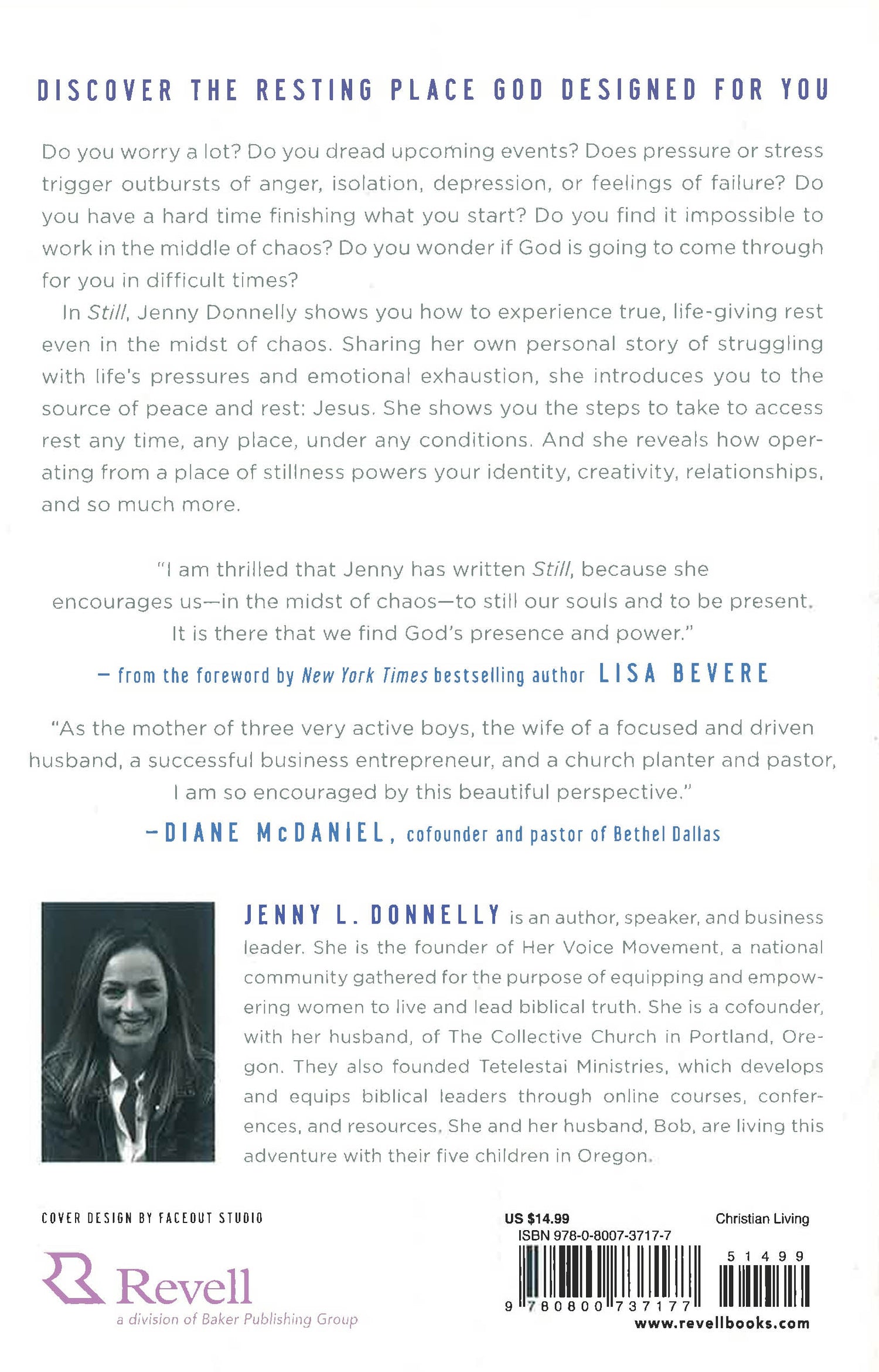 Do you worry a lot? Is it common for you to dread upcoming events? Does pressure or stress trigger outbursts of anger, isolation, depression, or feelings of failure? Do you have a hard time finishing what you start? Do you find it impossible to work in the middle of chaos? Do you wonder if God is really going to come through for you in difficult times? In Still, Jenny Donnelly teaches you how to experience true, life-giving rest even in the midst of chaos. While most of us think of rest as something we do, Jenny shares how rest is a place from which we live and work. Sharing her own personal story of struggling with life's pressures and spiritual exhaustion, she introduces you to the source of peace and rest: Jesus. She shows you the steps to take to access rest anytime, anyplace, under any conditions. And she reveals how operating from a place of stillness powers your identity, creativity, relationships, and so much more. If you've been stressed and anxious, operating on autopilot as life whizzes by, it's time you discovered the resting place God designed for you.