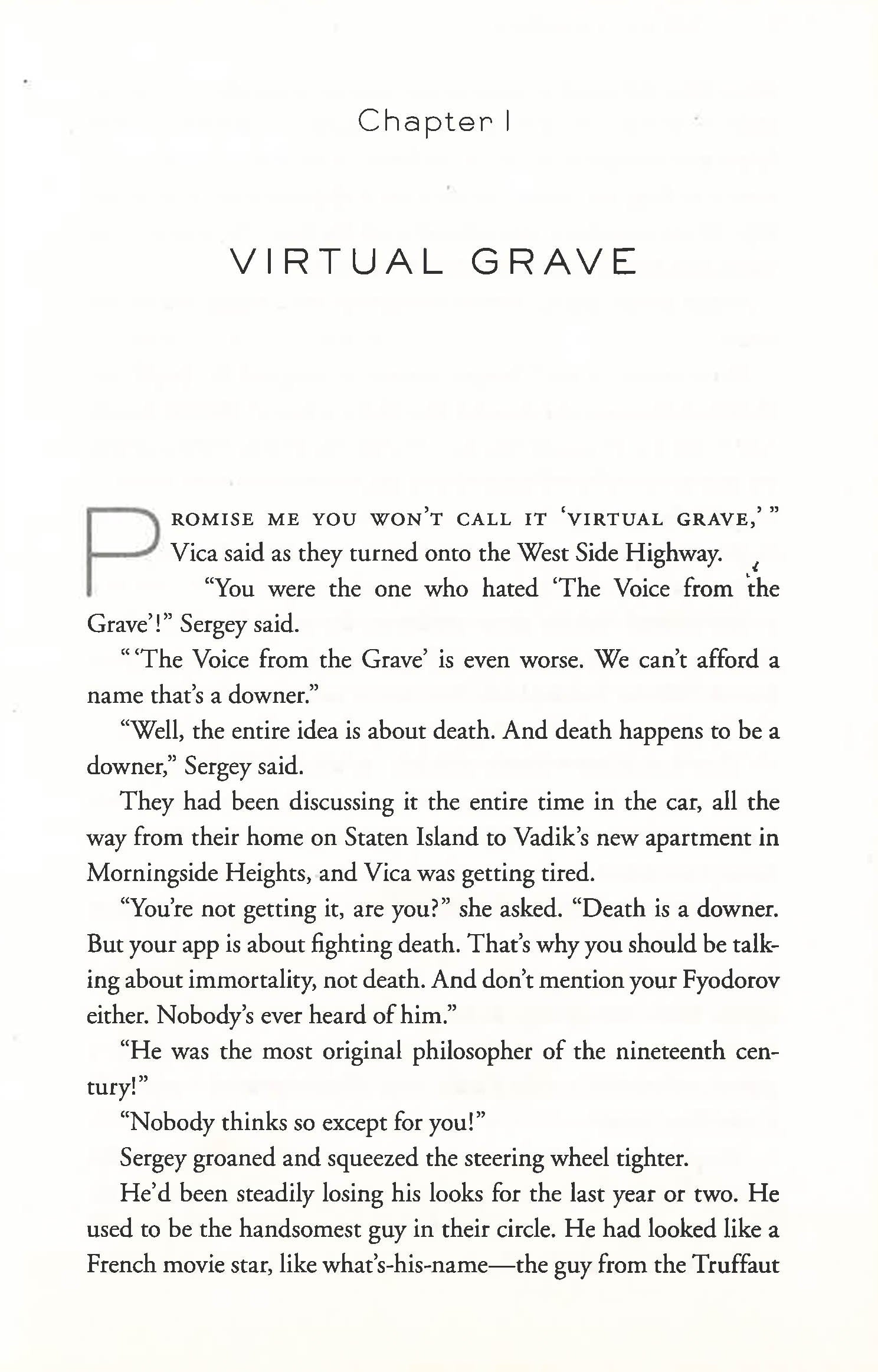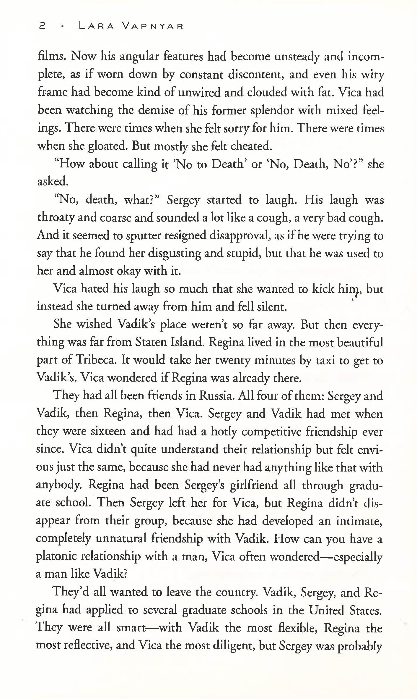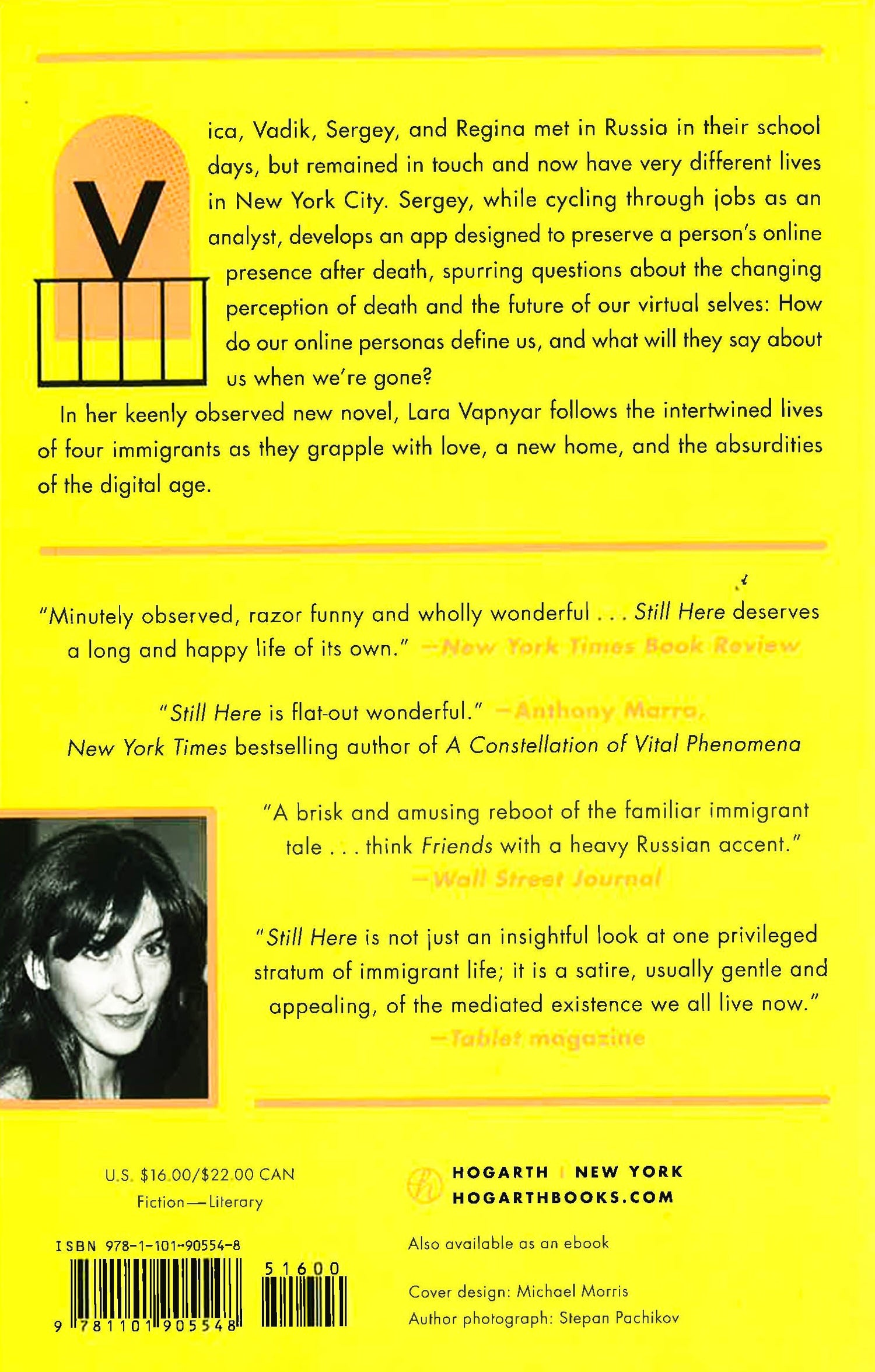 A profound and dazzlingly entertaining novel from the writer Louis Menand calls "Jane Austen with a Russian soul" In her warm, absorbing and keenly observed new novel, Lara Vapnyar follows the intertwined lives of four immigrants in New York City as they grapple with love and tumult, the challenges of a new home, and the absurdities of the digital age. Vica, Vadik, Sergey and Regina met in Russia in their school days, but remained in touch and now have very different American lives. Sergey cycles through jobs as an analyst, hoping his idea for an app will finally bring him success. His wife Vica, a medical technician struggling to keep her family afloat, hungers for a better life. Sergey's former girlfriend Regina, once a famous translator is married to a wealthy startup owner, spends her days at home grieving over a recent loss. Sergey's best friend Vadik, a programmer ever in search of perfection, keeps trying on different women and different neighborhoods, all while pining for the one who got away. As Sergey develops his app--calling it "Virtual Grave," a program to preserve a person's online presence after death--a formidable debate begins in the group, spurring questions about the changing perception of death in the modern world and the future of our virtual selves. How do our online personas define us in our daily lives, and what will they say about us when we're gone? -- New York Times Book Review, 100 Notable Books of 2016
