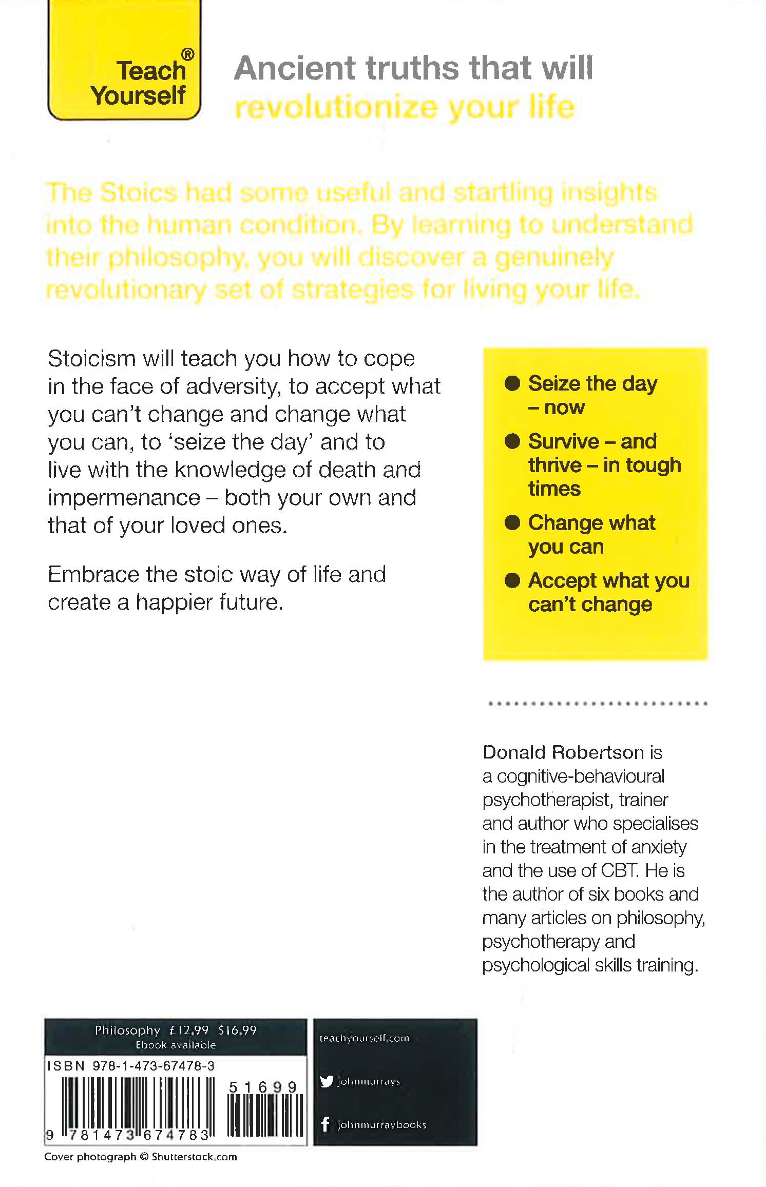 The stoics lived a long time ago, but they had some startling insights into the human condition - insights which endure to this day. The philosophical tradition, founded in Athens by Zeno of Citium in 301 BC, endured as an active movement for almost 500 years, and contributions from dazzling minds such as Cicero, Seneca and Marcus Aurelius helped create a body of thought with an extraordinary goal - to provide a rational, healthy way of living in harmony with the nature of the universe and in respect of our relationships with each other.In many ways a precursor to Cognitive Behavioural Therapy (CBT), Stoicism provides an armamentarium of strategies and techniques for developing psychological resilience, while celebrating all in life which is beautiful and important. By learning what stoicism is, you can revolutionise your life and learn how to seize the day, live happily and be a better person. This simple, empowering book shows how to use this ancient wisdom to make practical, positive changes to your life. Using thought-provoking case studies, highlighting key ideas and things to remember and providing tools for self-assessment, it demonstrates that Stoicism is a proven, profound pathway to happiness.