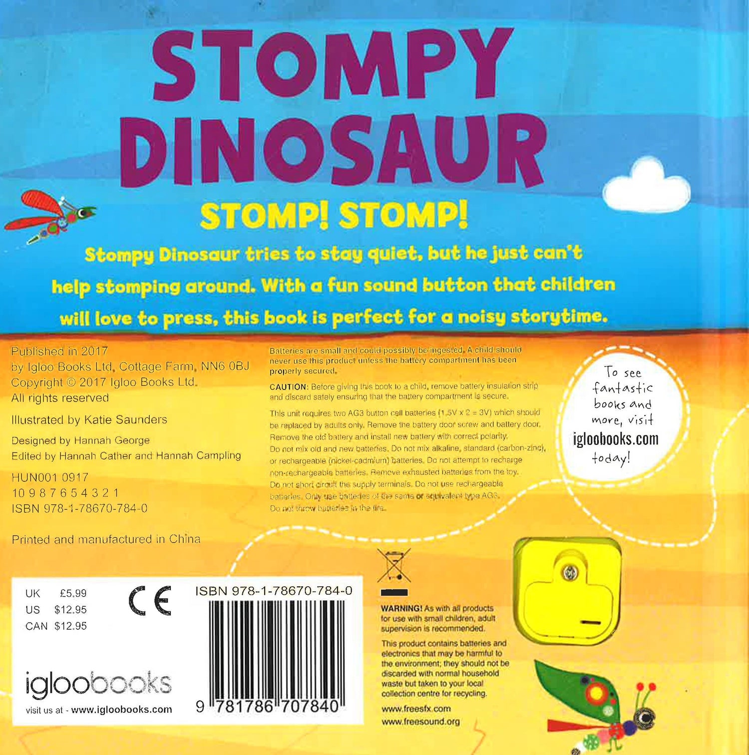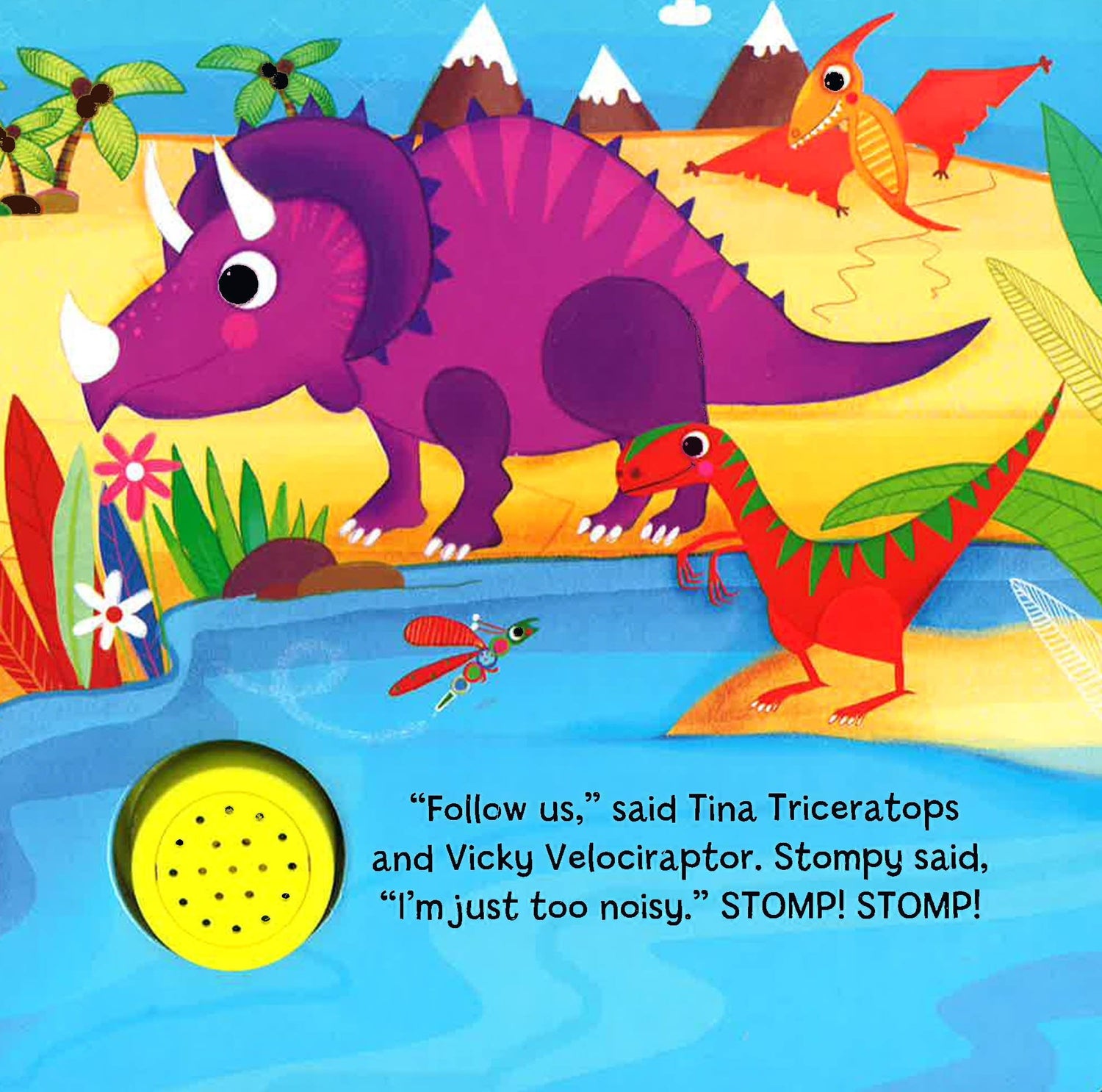 Stompy Dinosaur tries to stay quiet, but he just can't help stomping around. With a fun sound button that children will love to press, this book is perfect for a noisy storytime.