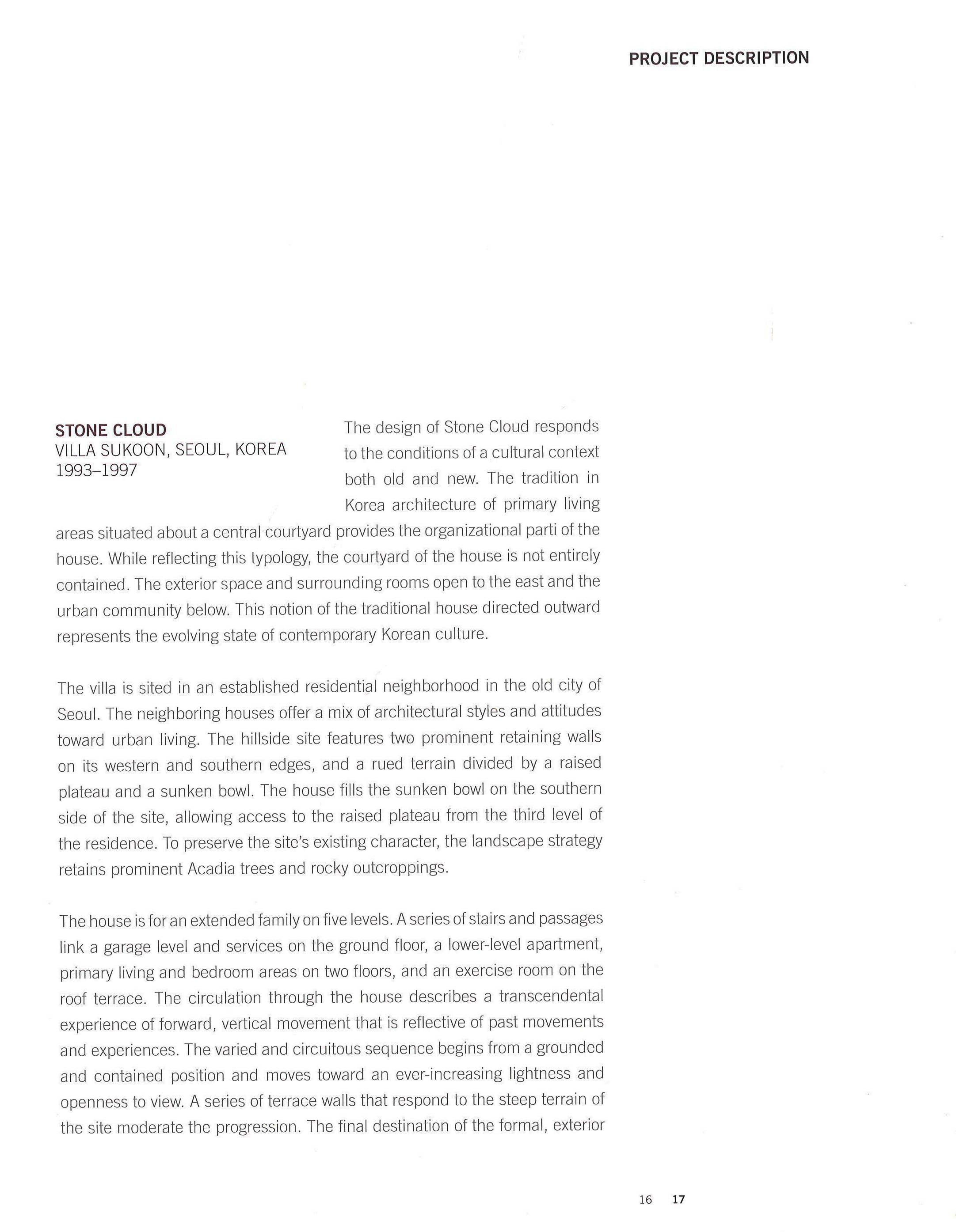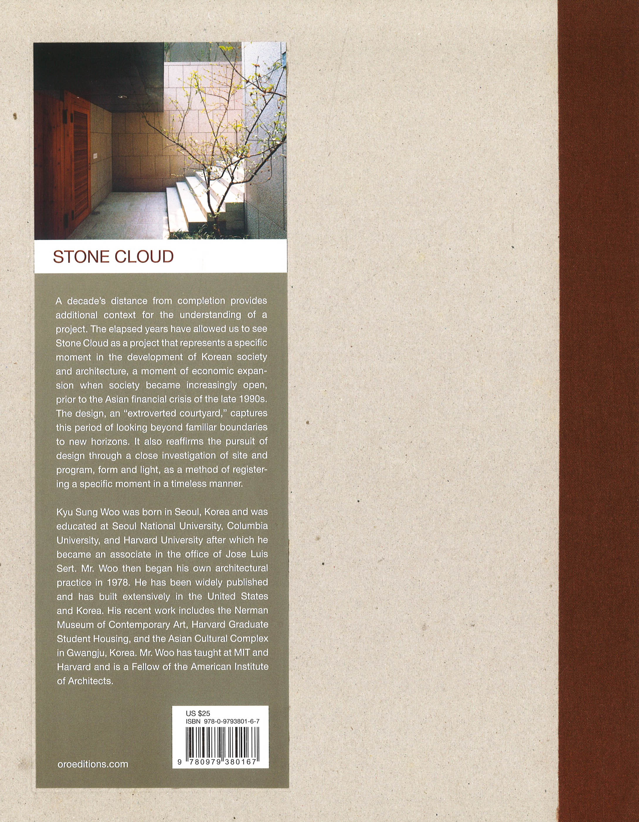 A decade after it was completed, we can now see Kyu Sung Woo's Stone Cloud house as a project that perfectly represents a specific moment in Korean culture and architecture--a moment of economic expansion when society became increasingly open, just prior to the Asian financial crisis of the late 1990s. Designed as an "extroverted courtyard," this influential project captures a period that looked beyond familiar boundaries to new horizons. Kyu Sung Woo was born in Seoul, Korea, and was educated at Seoul National University, Columbia University and Harvard University, after which he became an associate in the office of Jose Luis Sert. Mr. Woo opened his own architectural practice in 1978. He has been widely published and has built extensively in the United States and Korea. Recent projects include the Nerman Museum of Contemporary Art in Kansas and Harvard Graduate Student Housing in Cambridge, Massachusetts.