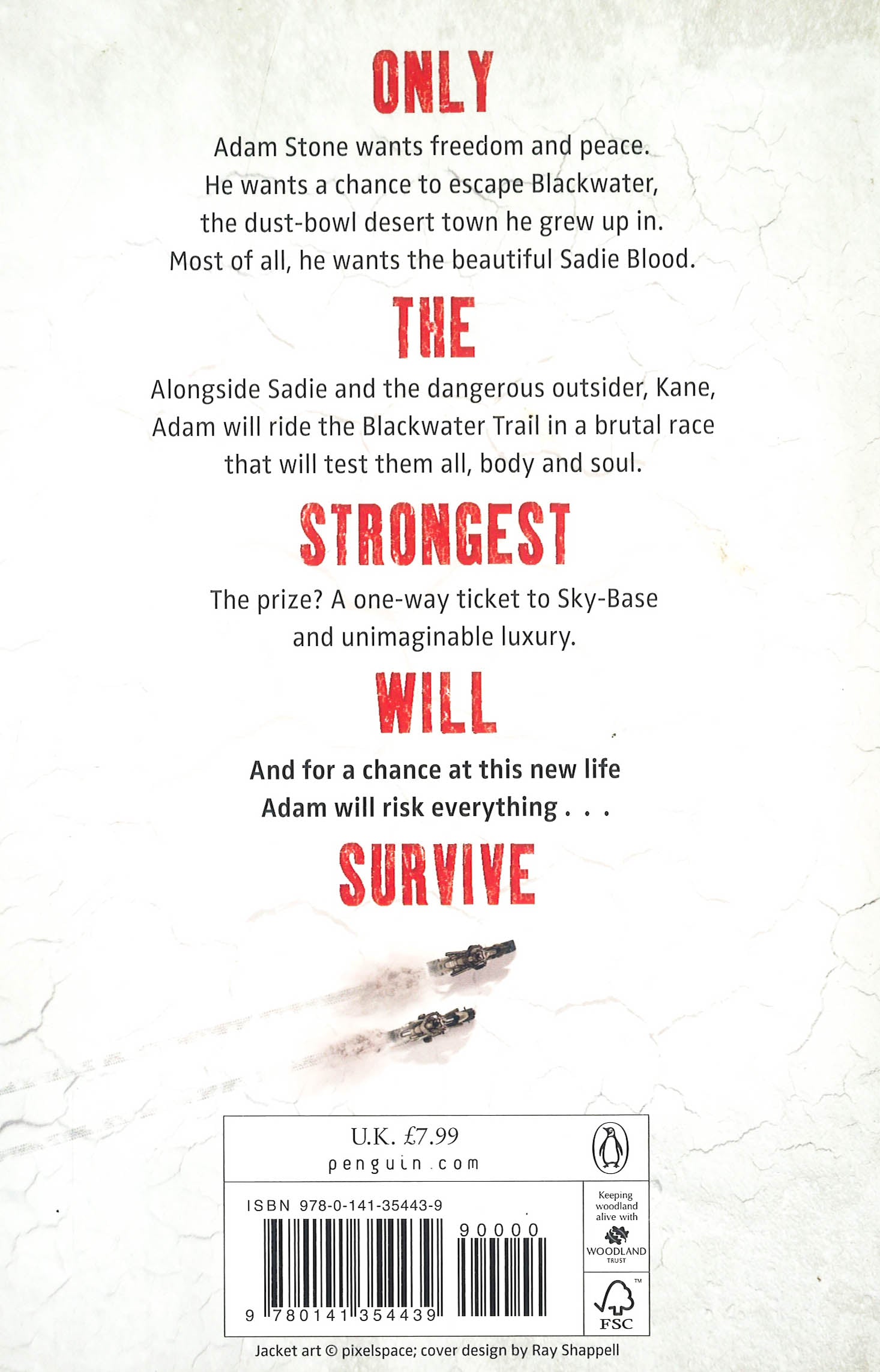The Hunger Games meets The Road in a stunning debut novel from a powerful new voice in YA fiction. *Shortlisted for the Branford Boase award 2016*Adam Stone wants freedom and peace. He wants a chance to escape Blackwater, the dust-bowl desert town he grew up in. Most of all, he wants the beautiful Sadie Blood. Alongside Sadie and the dangerous outsider, Kane, Adam will ride the Blackwater Trail in a brutal race that will test them all, body and soul. Only the strongest will survive.The prize? A one-way ticket to Sky-Base and unimaginable luxury.And for a chance at this new life, Adam will risk everything . . .'Pacy and gripping, with echoes of Mad Max and a dash of Brave New World.' Sally Green, author of Half Bad