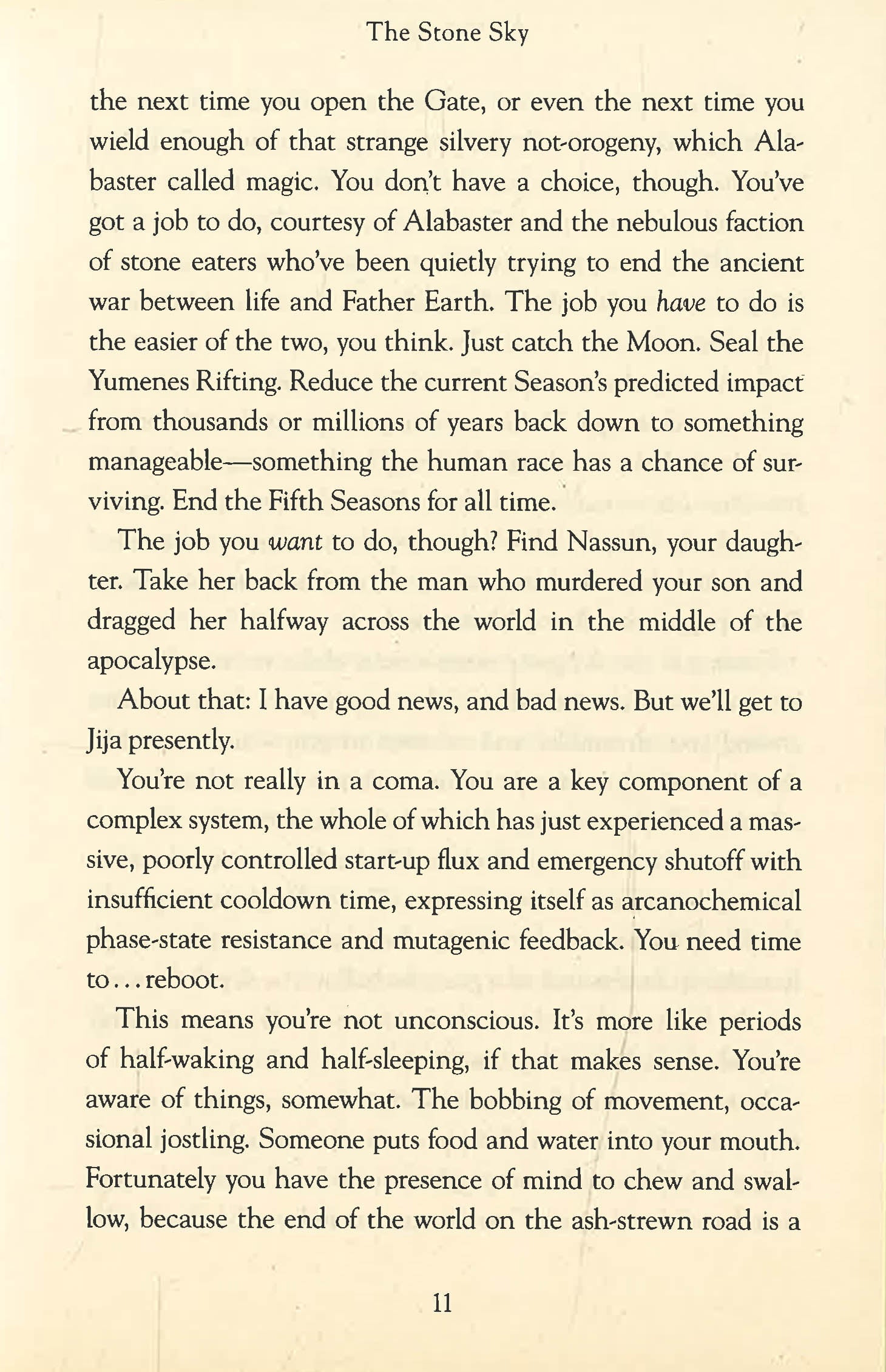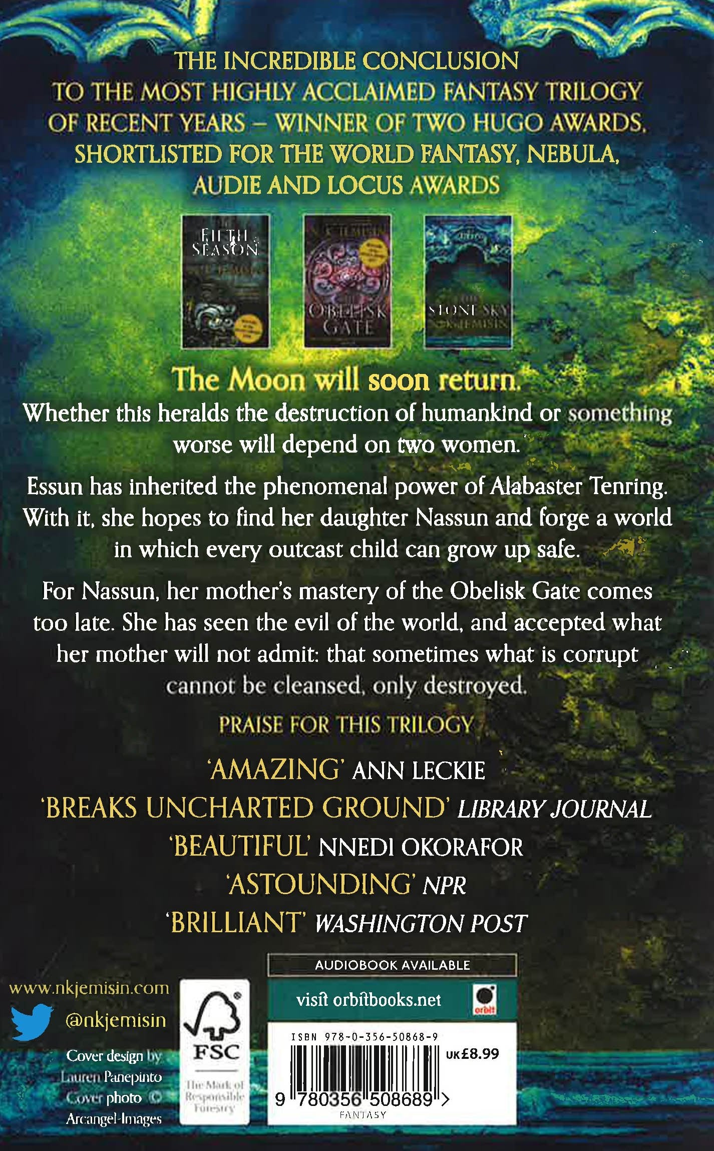 The incredible conclusion to the record-breaking triple Hugo award-winning trilogy that began with the The Fifth Season. The Moon will soon return. Whether this heralds the destruction of humankind or something worse will depend on two women. Essun has inherited the phenomenal power of Alabaster Tenring. With it, she hopes to find her daughter Nassun and forge a world in which every outcast child can grow up safe. For Nassun, her mother's mastery of the Obelisk Gate comes too late. She has seen the evil of the world, and accepted what her mother will not admit: that sometimes what is corrupt cannot be cleansed, only destroyed.