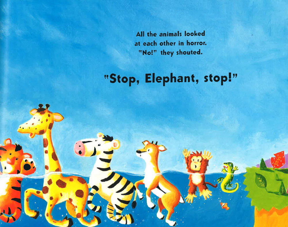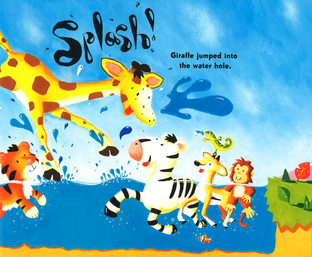 Lizard is boiling hot, so he jumps into the water hole with a tiny little splash. Monkey decides to jump in too, then Zebra, then Giraffe ... As the splashes get bigger and bigger, things soon begin to spiral out of control.