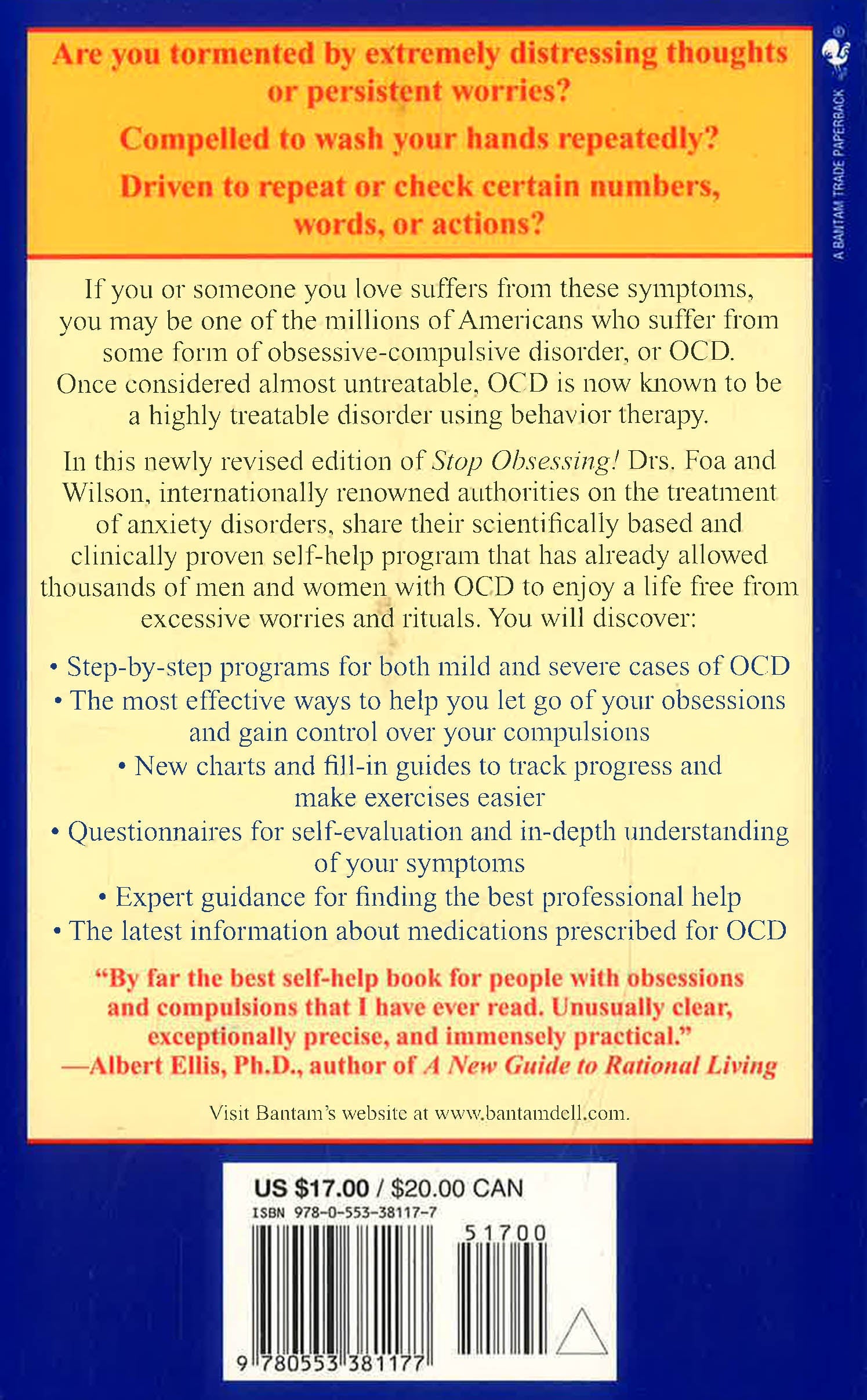Once considered almost untreatable, OCD is now known to be a highly treatable disorder using behavior therapy. In this newly revised edition of Stop Obsessing! Drs. Foa and Wilson, internationally renowned authorities on the treatment of anxiety disorders, share their scientifically based and clinically proven self-help program that has already allowed thousands of men and women with OCD to enjoy a life free from excessive worries and rituals.